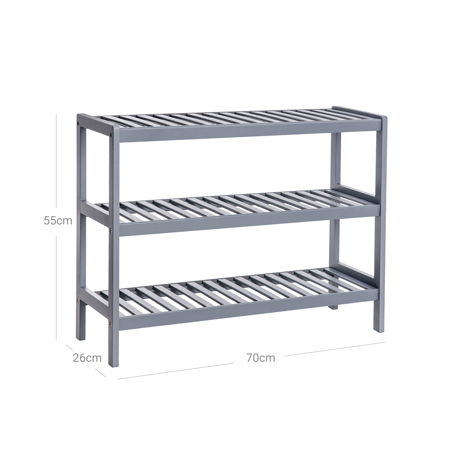 The Songmics shoe rack is the ideal storage solution for your hallway or corridor. You get a stylish shoe rack that impresses with its high-quality workmanship and is extremely decorative. Not only does it bring order to your home, you can also use it to display shoes and decorative items in your shop. The 4 storage spaces can be used to store shoes, bags, plants, baskets, and bathroom accessories such as towels. Here are some more ideas. Why should you choose the Songmics shoe rack? Songmics is always customer-oriented and is fully committed to offering high-quality products with a good price/performance ratio. We have excellent customer service and do everything we can to solve your problems. Product details: – Color: gray – Material: bamboo – Dimensions: 70 x 55 x 26 cm (W x H x D) – Weight: 3.4 kg Scope of delivery: – 1 x shoe rack with 3 levels – 1 x accessory bag (incl. Allen key) – 1 x instructions (DE, EN, FR, IT, ES)