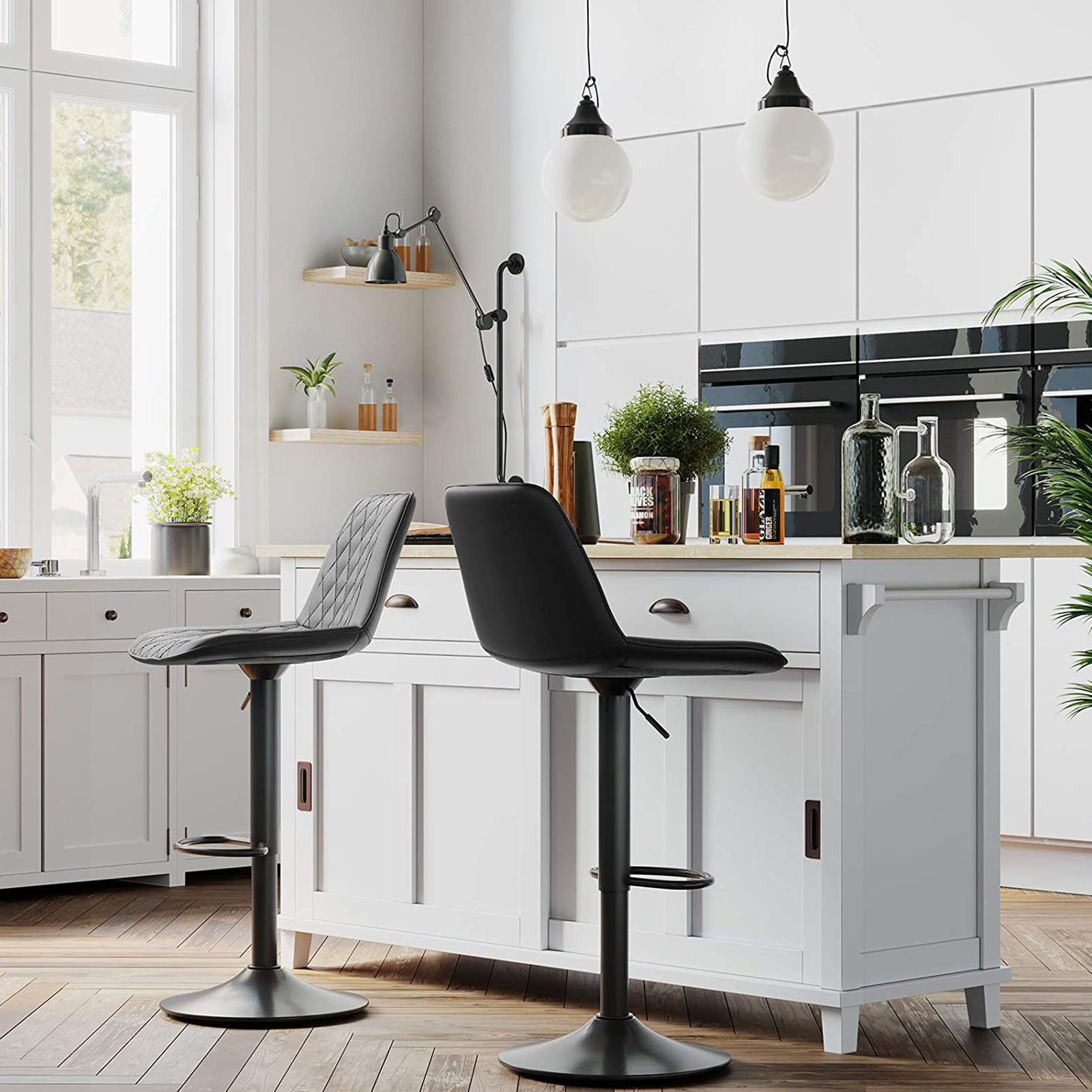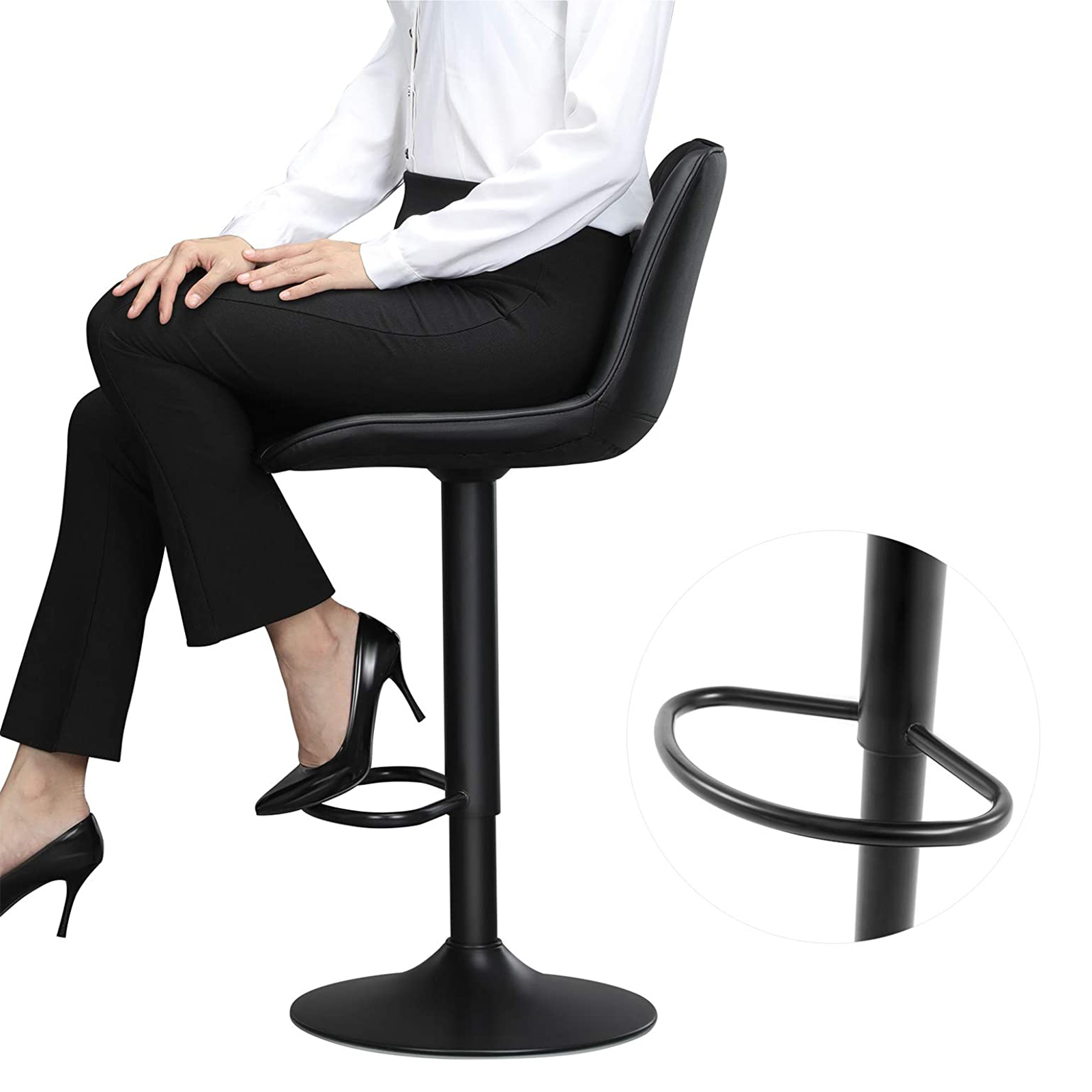 Head to the bar! Have you been working too much in recent weeks? Then make the most of the weekend and sit down with a good friend! The best place to do this is at your bar table, which will now shine thanks to these eye-catching bar stools. The ergonomically shaped seat shell and practical footrest ensure a high level of seating comfort, so you can talk about old times late into the night.Safety first: to ensure that these chairs don’t wobble and that you can adjust the seat height continuously and without any problems, we use particularly durable auto-return cylinders. These have been tested by SGS and comply with the BIFMA X5.1 standard (test report no.: AJHL200400841FT; owner: supplier).Product details: Color: Black Material: PU leather, foam, steel Overall size: 47 x 51 x (88.5-108.5) cm (L x W x H) Seat height: 60.5-80.5 cm Seat width: 47 cm Seat depth: 38.5 cm Backrest dimensions: 34 x 30 cm (L x W) Base diameter: 38.5 cm Weight per bar stool: 7.6 kg Max. static load capacity per bar stool: 120 kg Scope of delivery: 2 x bar stools 2 x accessory pack 1 x instructions (DE, EN, FR, ES, IT) SONGMICS notes:For safety reasons, children are not allowed to climb on or play with the product.