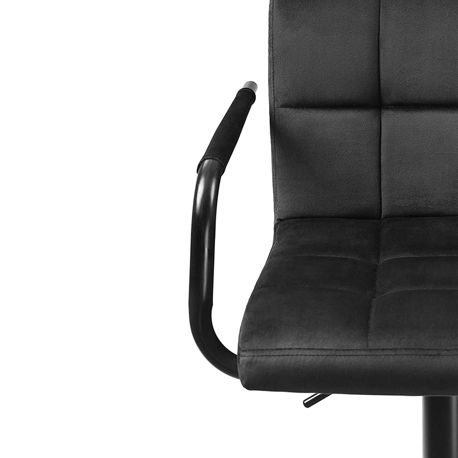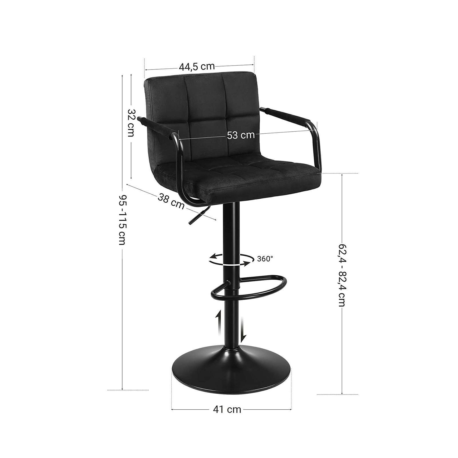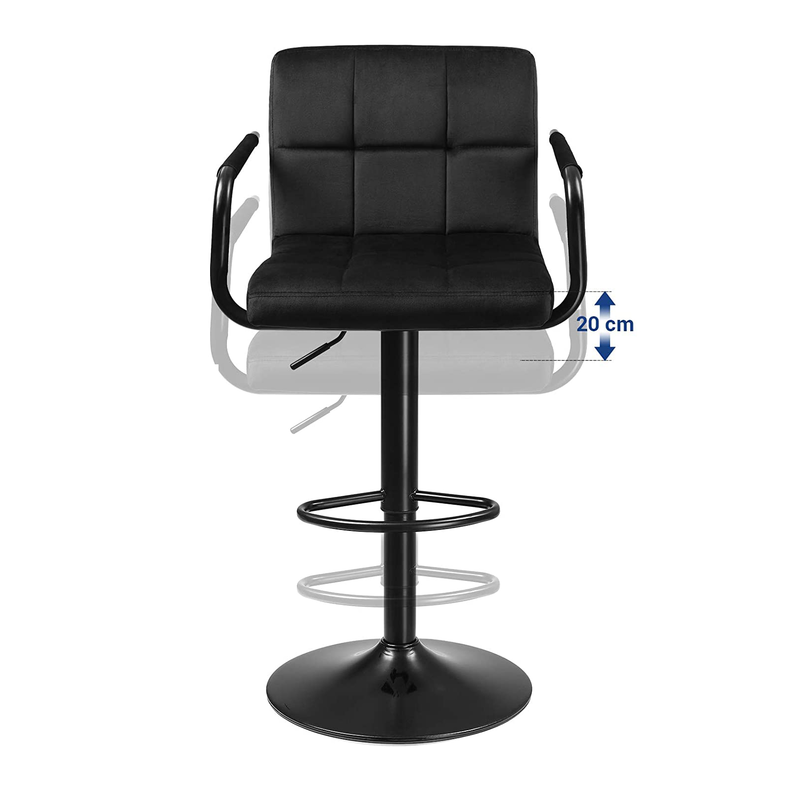 Comfort doesn’t just mean sitting on the couch in the living room. Thanks to these well-upholstered bar stools from SONGMICS, which feature a soft backrest, practical armrests, and a footrest, you can now enjoy comfort in your kitchen too. Safe rotationThe 360° swivel kitchen chairs rotate smoothly and without wobbling. The base has a large diameter of 41 cm and is equipped with an anti-slip plastic ring on the underside. This ensures safe use and protects your floor from scratches. Elegance to the tipsThe simple profile, comfortable velvet cover, and powder-coated metal structure not only make this product shine, but also your kitchen. Have breakfast here with your loved one, work on the computer, or pour your guests a glass of wine. Product details:- Color: Black- Material: Velvet, metal, foam- Size: 38 x 44.5 x (95-115) cm (L x W x H)- Height of adjustable seat: 62.5-82.5 cm- Seat size: 38 x 44.5 cm (L x W)- Backrest height: 32 cm- Base diameter: 41 cm- Weight per chair: 9 kg- Max. static load capacity per bar stool: 120 kgScope of delivery:- 2 x bar stool- 2 x accessory package- 1 x instructions (DE, EN, FR, ES, IT)