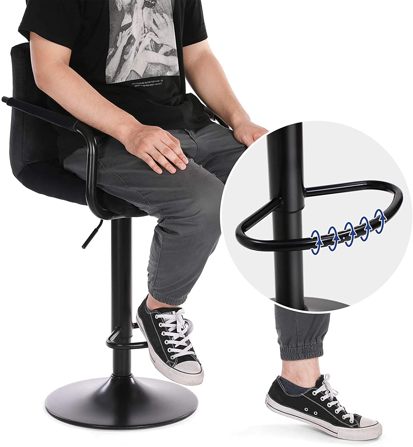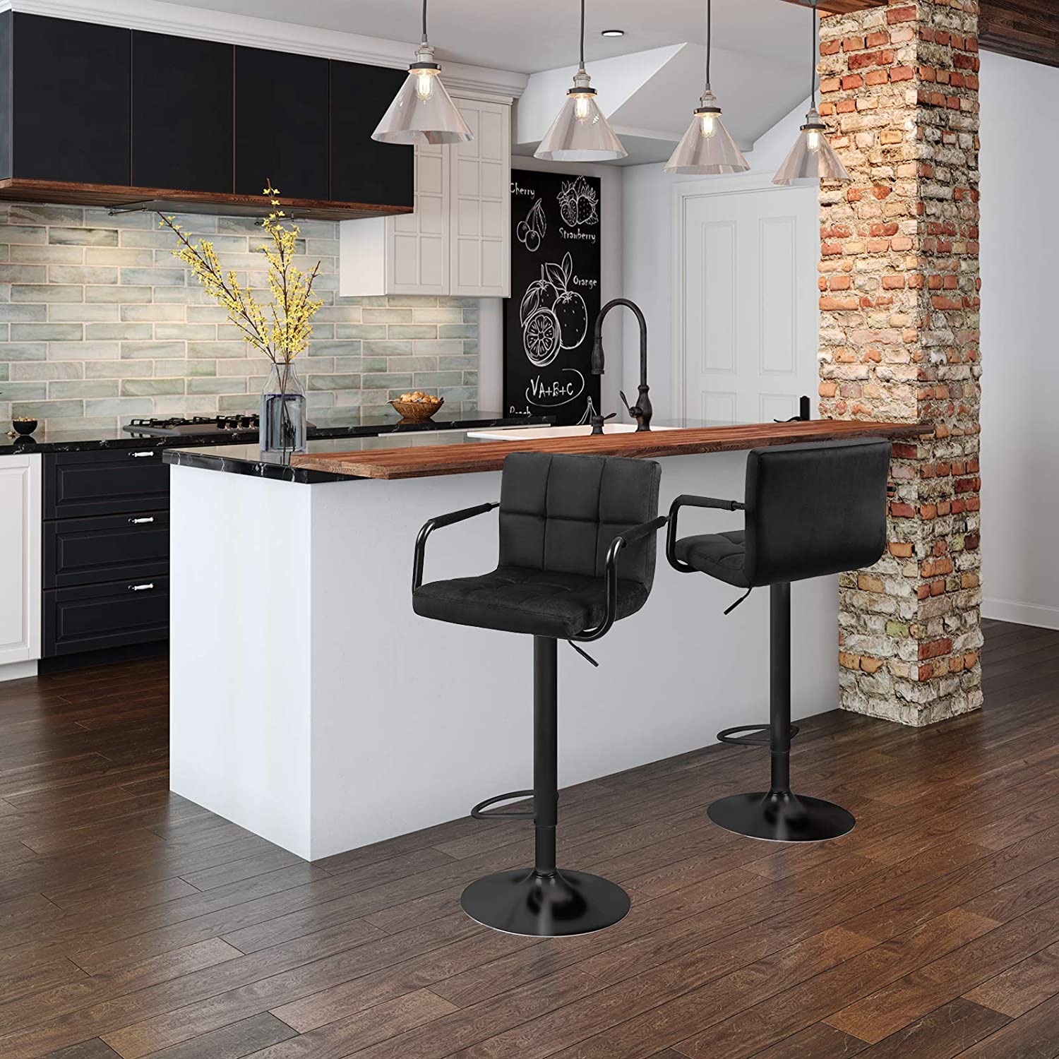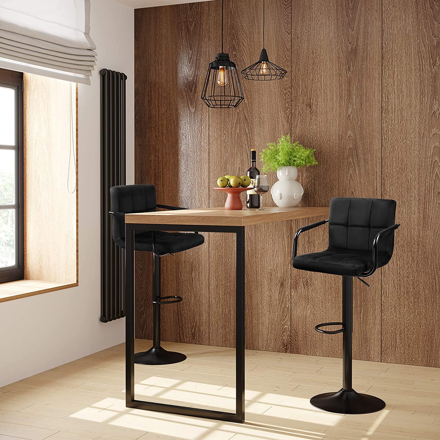 Comfort doesn’t just mean sitting on the couch in the living room. Thanks to these well-upholstered bar stools from SONGMICS, which feature a soft backrest, practical armrests, and a footrest, you can now enjoy comfort in your kitchen too. Safe rotationThe 360° swivel kitchen chairs rotate smoothly and without wobbling. The base has a large diameter of 41 cm and is equipped with an anti-slip plastic ring on the underside. This ensures safe use and protects your floor from scratches. Elegance to the tipsThe simple profile, comfortable velvet cover, and powder-coated metal structure not only make this product shine, but also your kitchen. Have breakfast here with your loved one, work on the computer, or pour your guests a glass of wine. Product details:- Color: Black- Material: Velvet, metal, foam- Size: 38 x 44.5 x (95-115) cm (L x W x H)- Height of adjustable seat: 62.5-82.5 cm- Seat size: 38 x 44.5 cm (L x W)- Backrest height: 32 cm- Base diameter: 41 cm- Weight per chair: 9 kg- Max. static load capacity per bar stool: 120 kgScope of delivery:- 2 x bar stool- 2 x accessory package- 1 x instructions (DE, EN, FR, ES, IT)