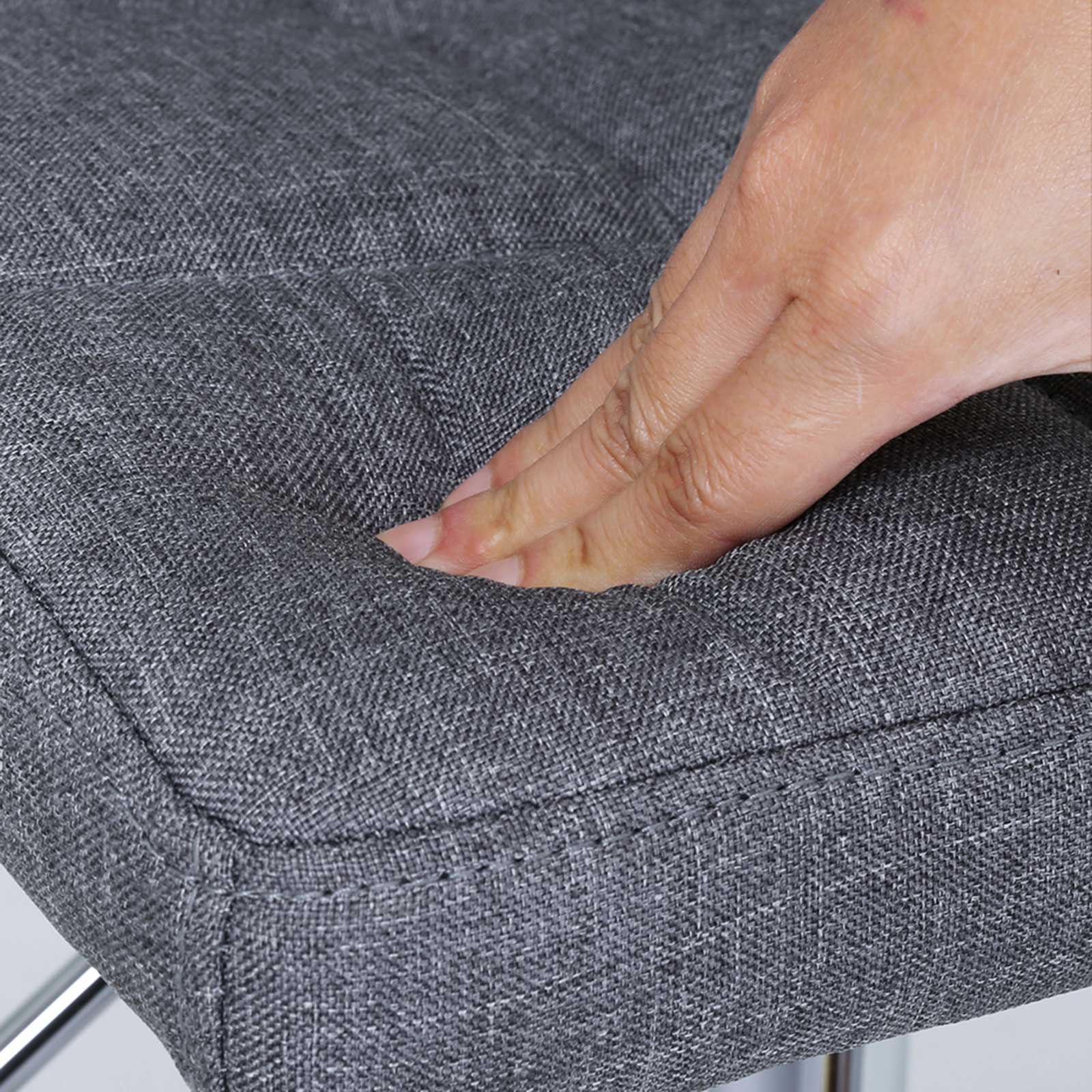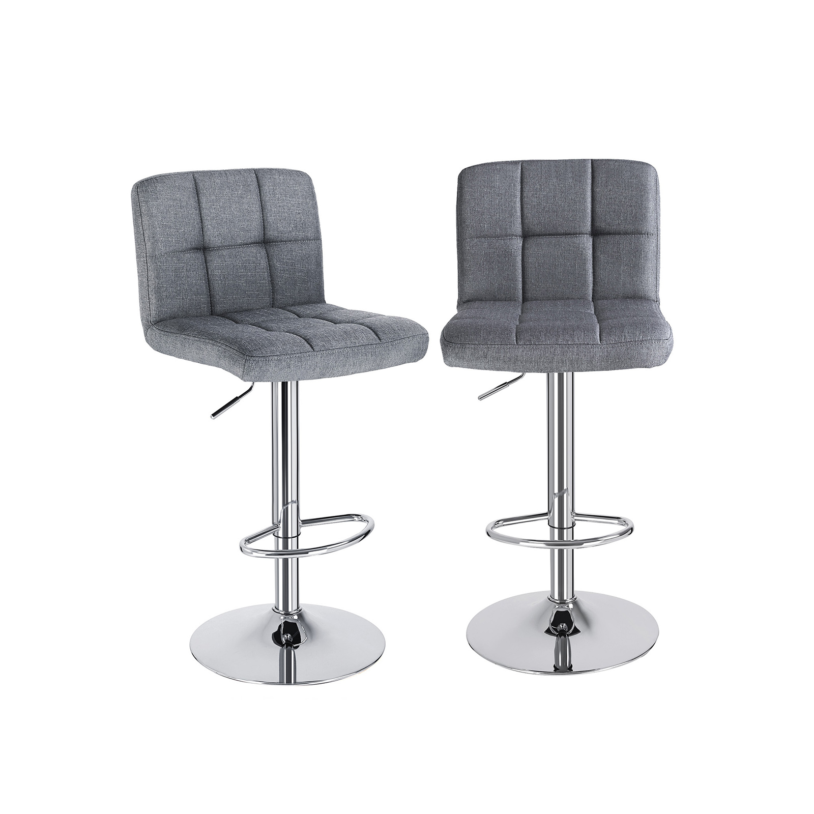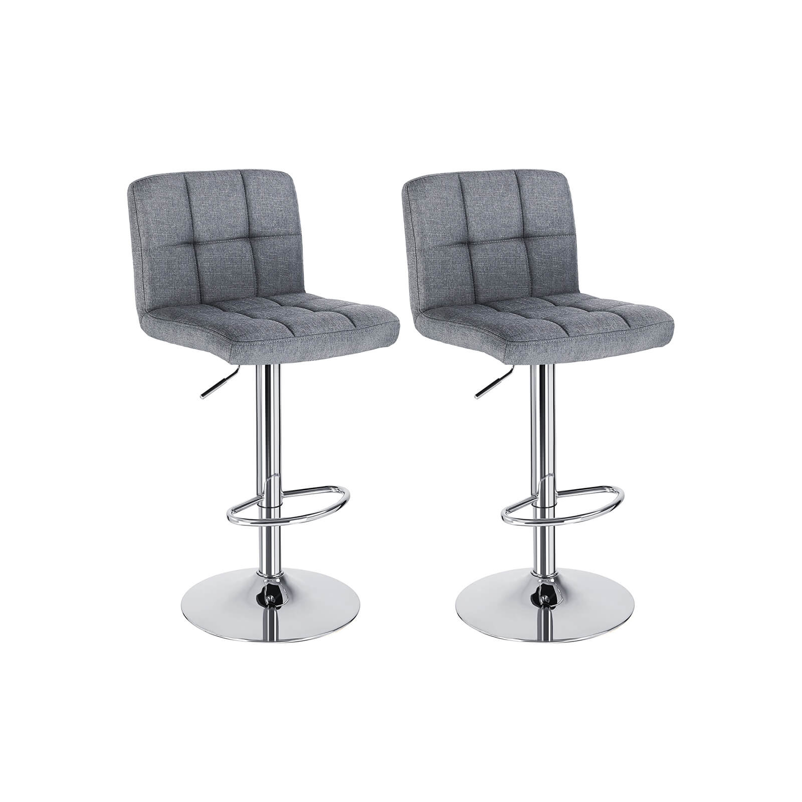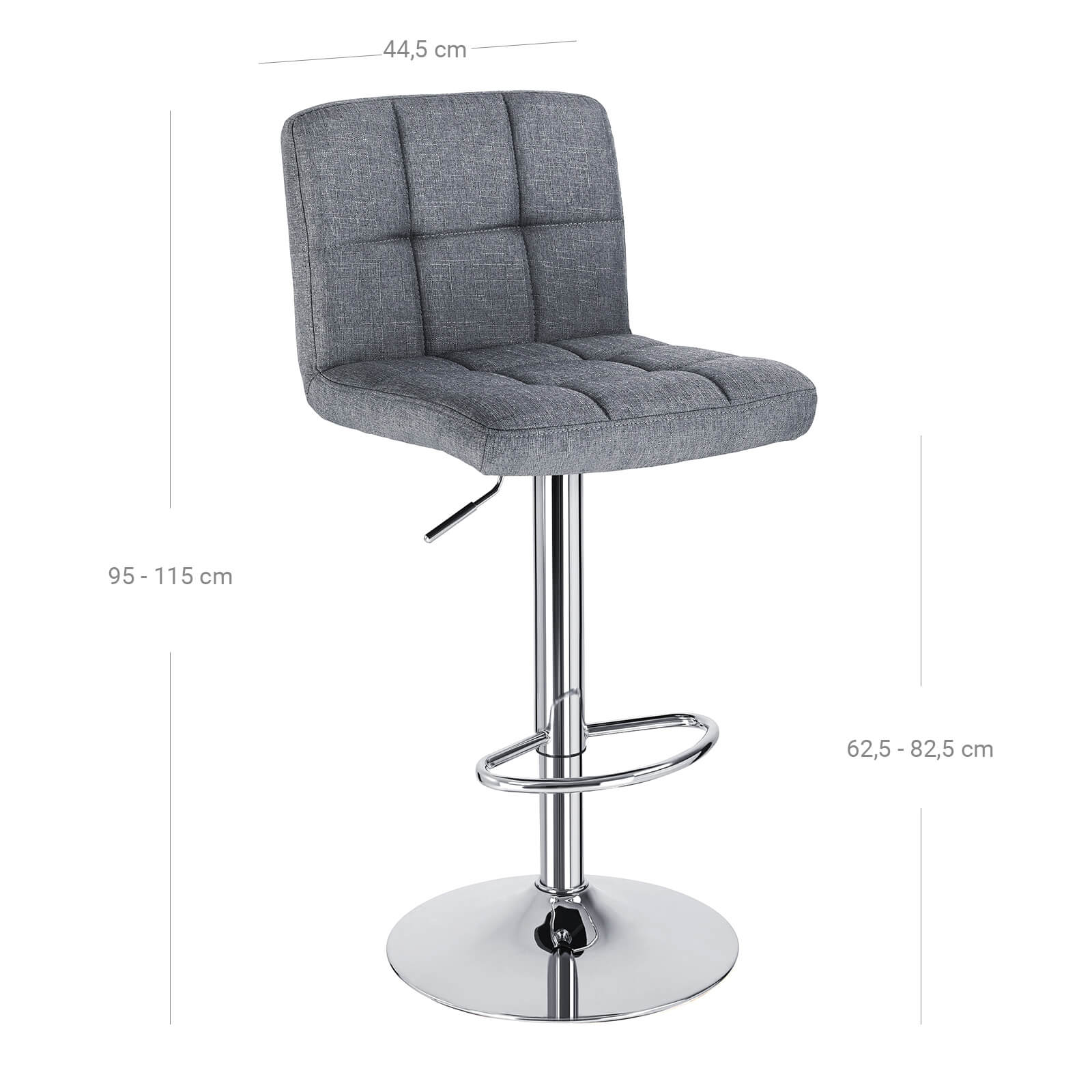 Product description The Songmics bar stool is characterized by its comfortable seat, good stability, and clean workmanship. It is equipped with high-density foam padding, a comfortable PU surface, a large base, a high-quality gas spring, and a shiny base frame. It is height-adjustable and can be rotated freely. Furthermore, the lower rubber ring protects the floor from scratches. The Songmics bar stool fits perfectly in snack bars, cafes, department stores, and even at home at the counter. It is not only practical for sitting, but also serves as decoration and creates fashion and trends. Product details:- Seat: 44.5 x 38 cm (W x D) – Total height: approx. 95 – 115 cm – Seat height adjustment: approx. 62.5 – 82.5 cm – Backrest height: 32 cm – Base diameter: 41 cm – Material: Linen + chrome-plated steel – Color: gray Set includes: Scope of delivery: – 2 x bar stools – 1 x instructions (DE, EN, FR, IT, ES) – 1 x hardware bag