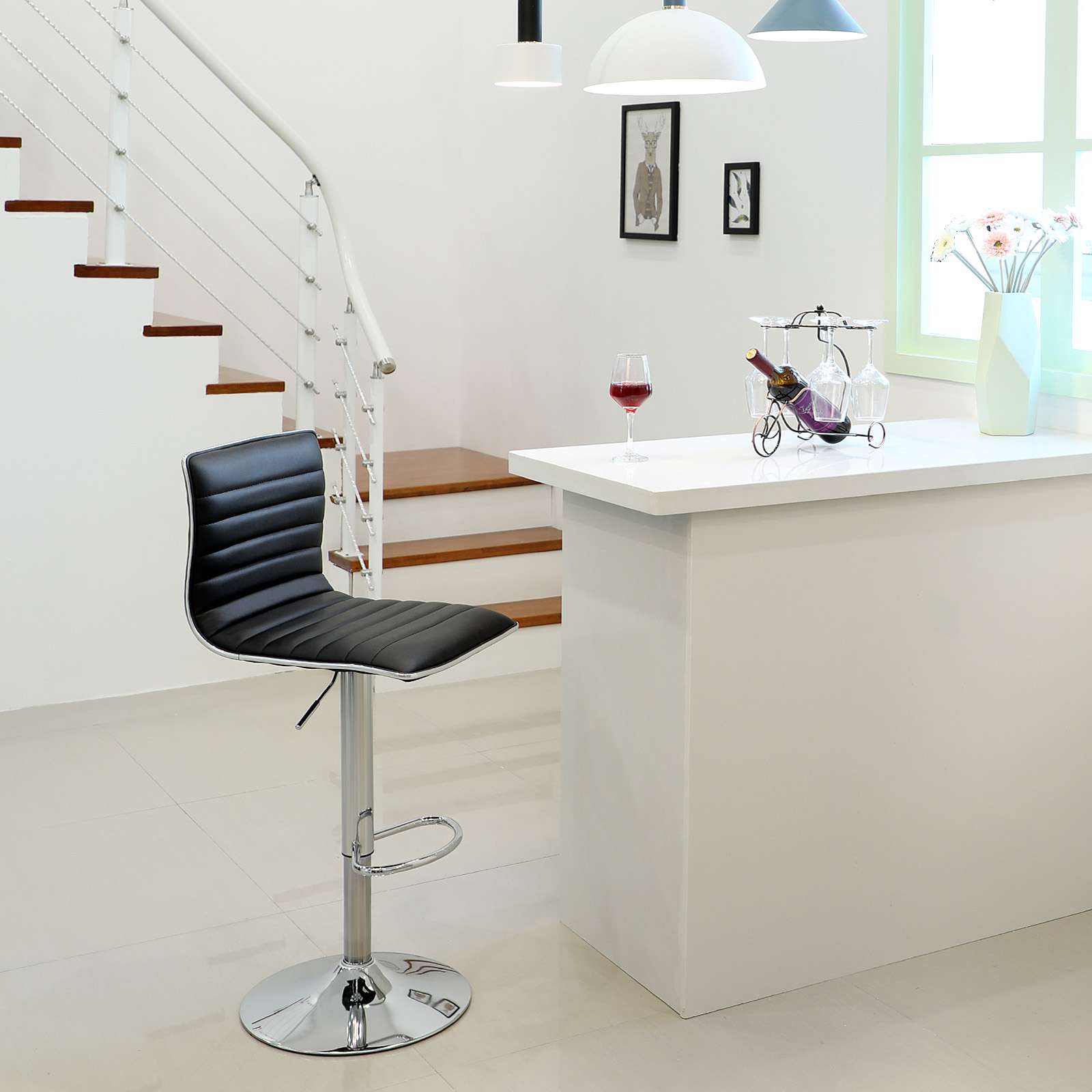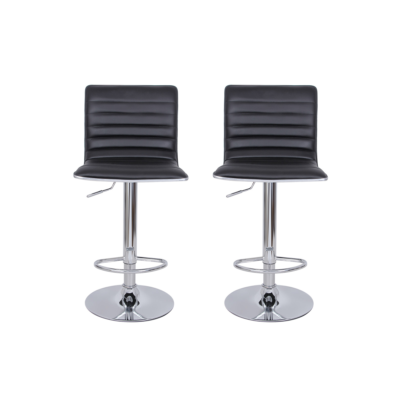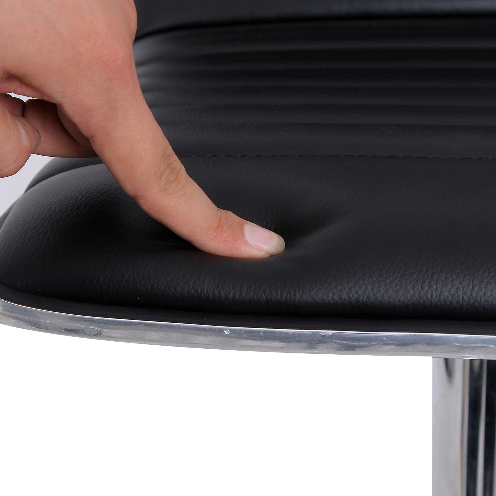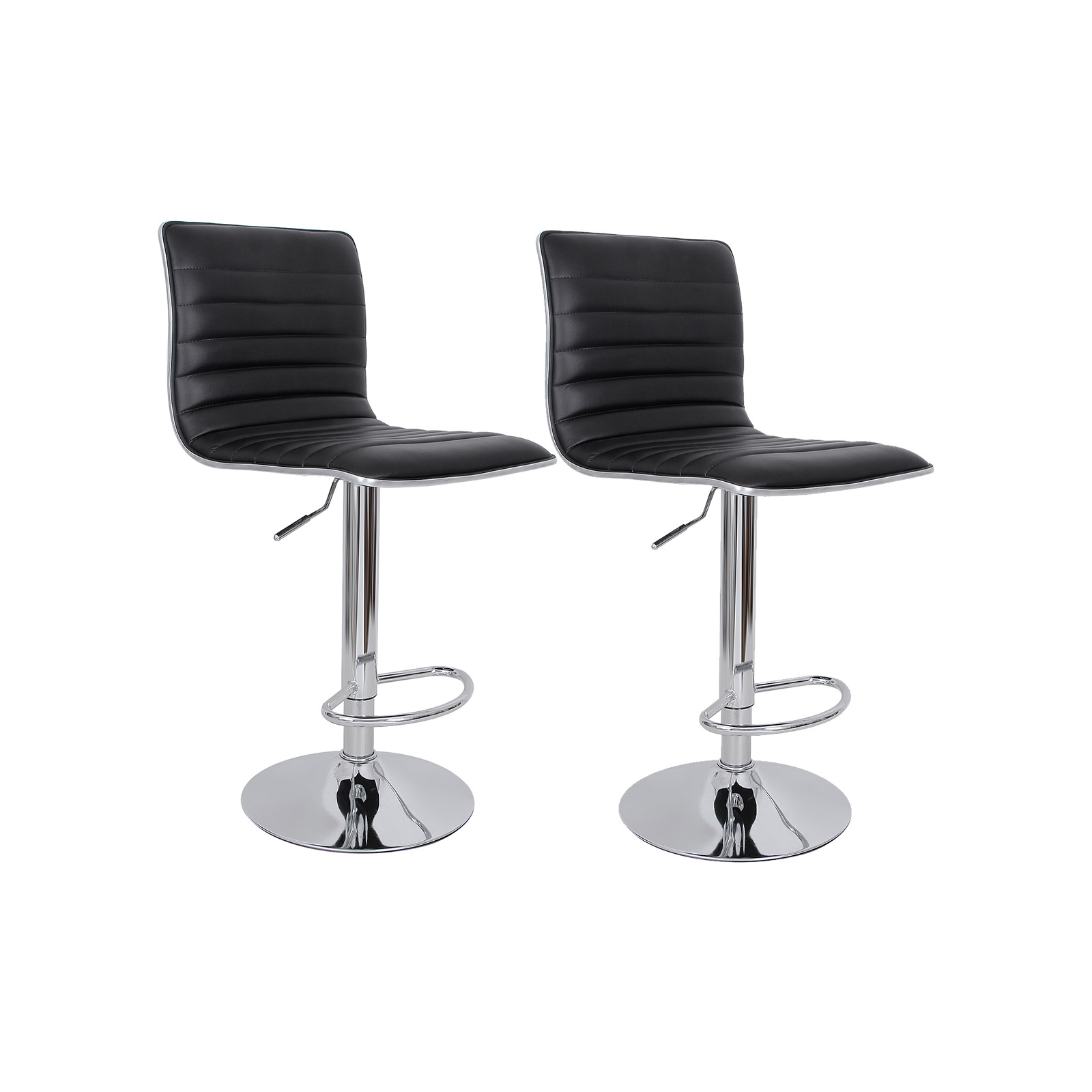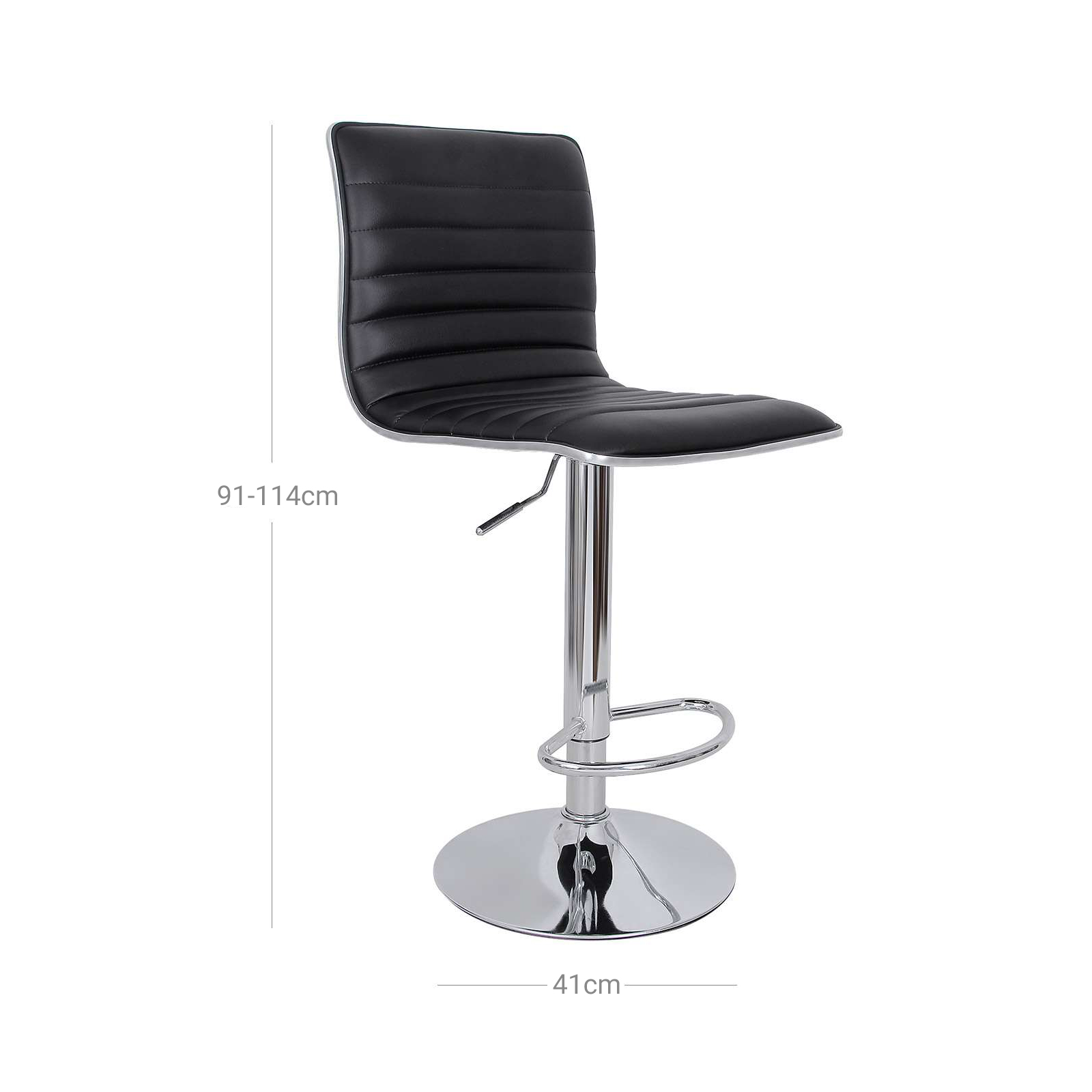 Note: It is normal for the plastic strip and rubber seal around the seat to have a gap on the right-hand side. This is not a defect and does not affect the robustness of the bar stool. Please do not worry. Product details: Material: linen, chrome-plated steel Color: black Seat: 40 x 42 cm Backrest height: 33 cm Base diameter: 41 cm Seat height adjustment: approx. 57-77 cm Total height: 94-114 cm Scope of delivery: 2 x bar stools 1 x instructions (DE, EN, FR, IT, ES) 1 x tool