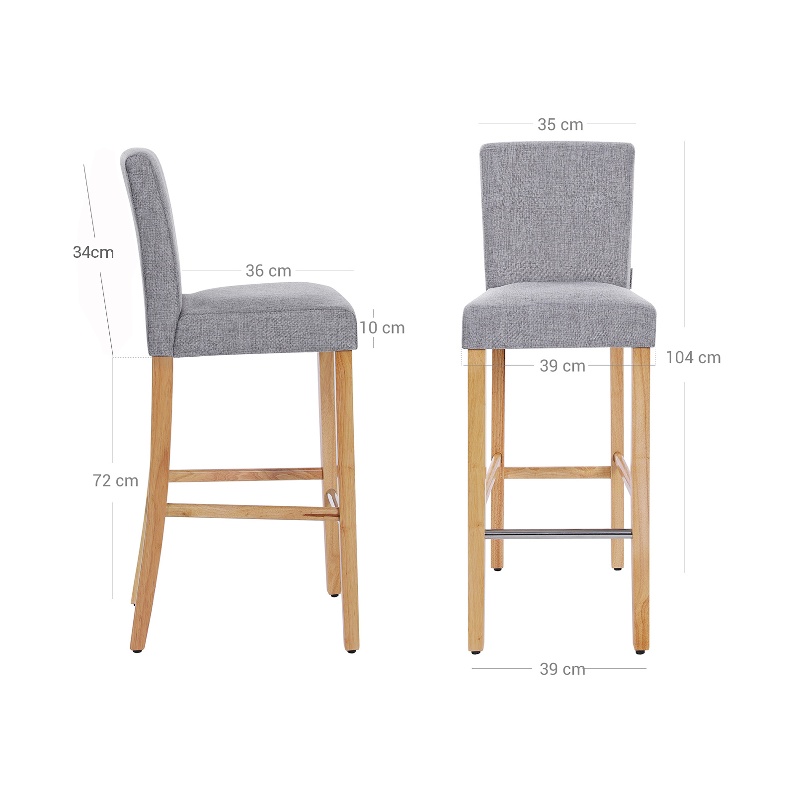 The upholstered bar stool with backrest is a true classic. With a high level of comfort thanks to the beautifully and fully upholstered backrest and seat, and a reasonable seat height with footrest, you can enjoy a relaxing time while eating or drinking. Ideal for counters, bars, living rooms, kitchens, or gardens! Product details: – Color: Light gray-natural – Material: – Cover: Cotton-linen fabric – Backrest frame and legs: Rubberwood (clear lacquer finish) – Seat frame: Pine wood – Seat plate: Plywood – Size: 39 x 51.5 cm x 99.5 cm (L x W x H) – Seat height: 76 cm; Seat depth: 36 cm; Seat width: 39 cm – Weight: 6.15 kg/chair – Max. static load capacity: 110 kg Scope of delivery: – 2 x bar stools – 2 x accessory bags – 1 x instructions (DE, EN, IT, FR, ES) SONGMICS notes:- For lasting stability and safety, it is advisable to regularly check the condition of the screws and tighten them. Repeated assembly and disassembly is also not recommended. – Please never rock while sitting, and all 4 legs should remain on the floor.
