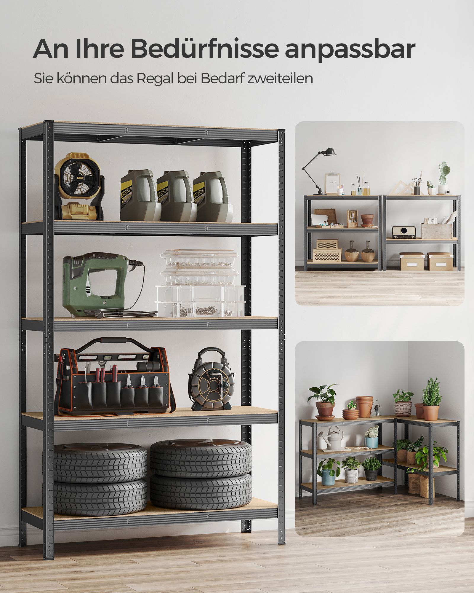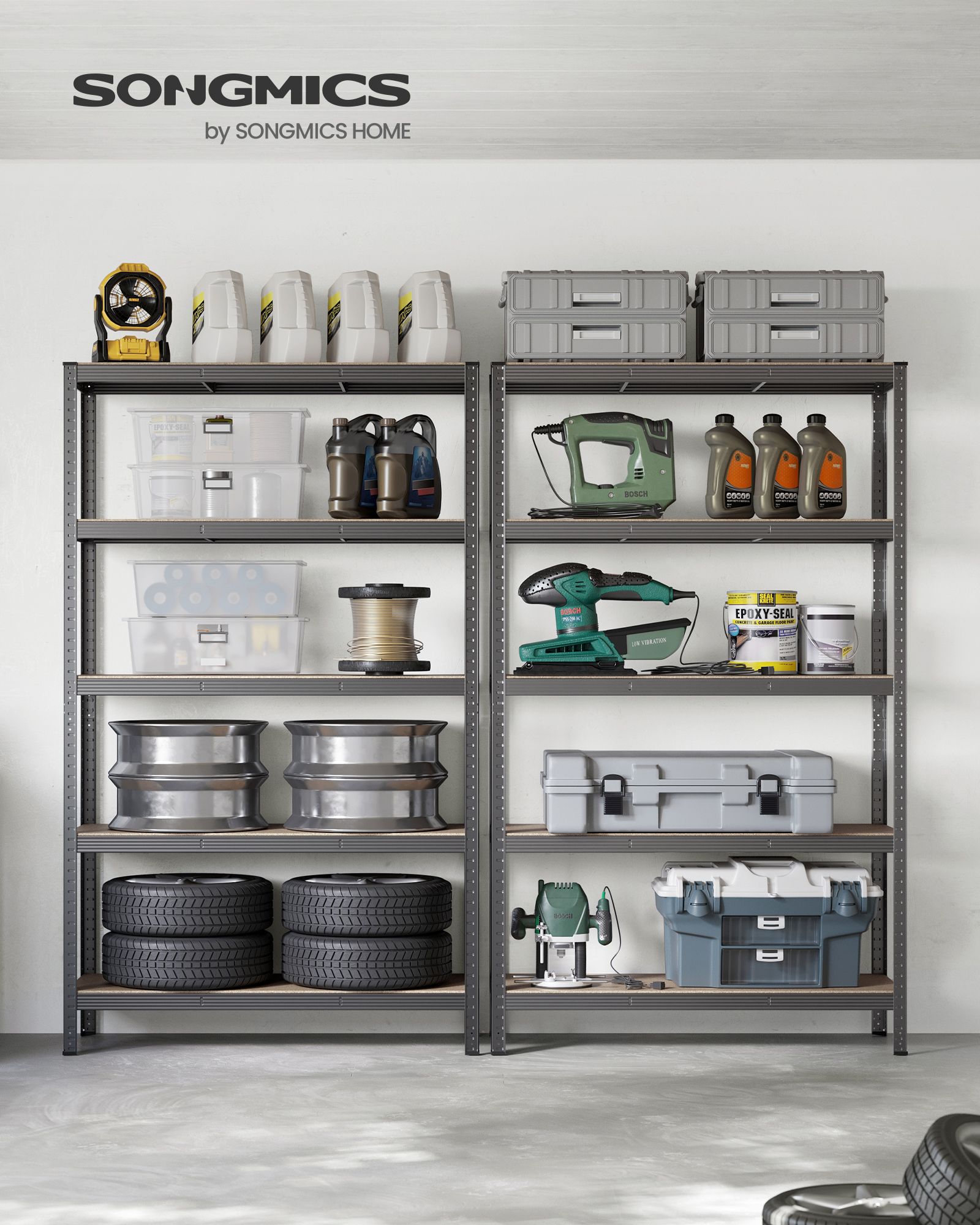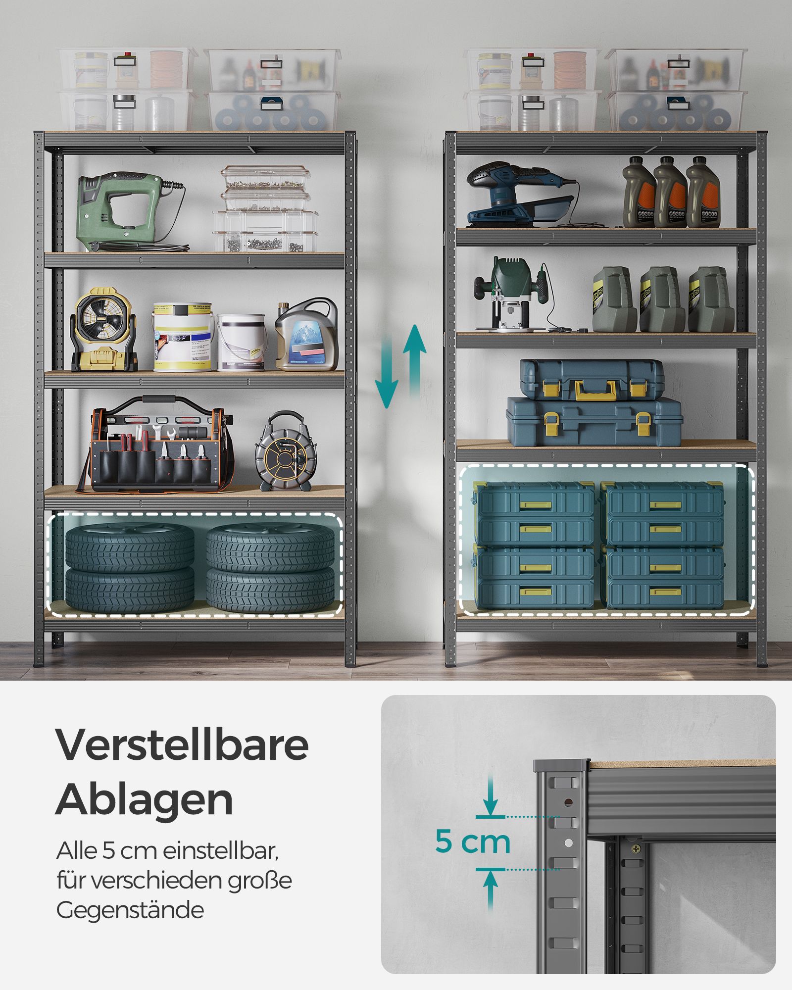 Product details: Color: Gray Material: Powder-coated steel, MDF (medium-density fiberboard) Size: 60 x 120 x 200 cm (D x W x H) Weight: 22.8 kg Max. static load capacity of each shelf: 175 kg Max. total static load capacity: 875 kg Scope of delivery: 1 x storage shelf 1 x anti-tip device 1 x instructions SONGMICS Notes:Please secure the product to the wall using the anti-tip bracket provided to ensure safety during use. Always wear gloves when assembling. Please do not place the product in a damp environment. The max. load capacity in the text refers to the maximum static weight.
