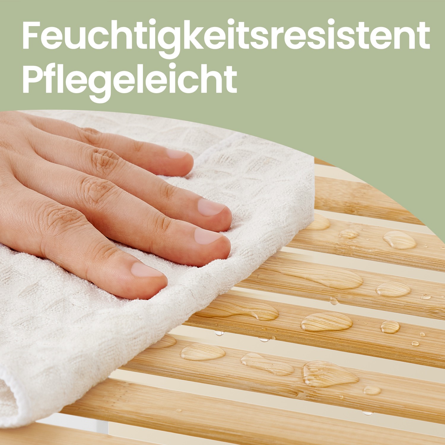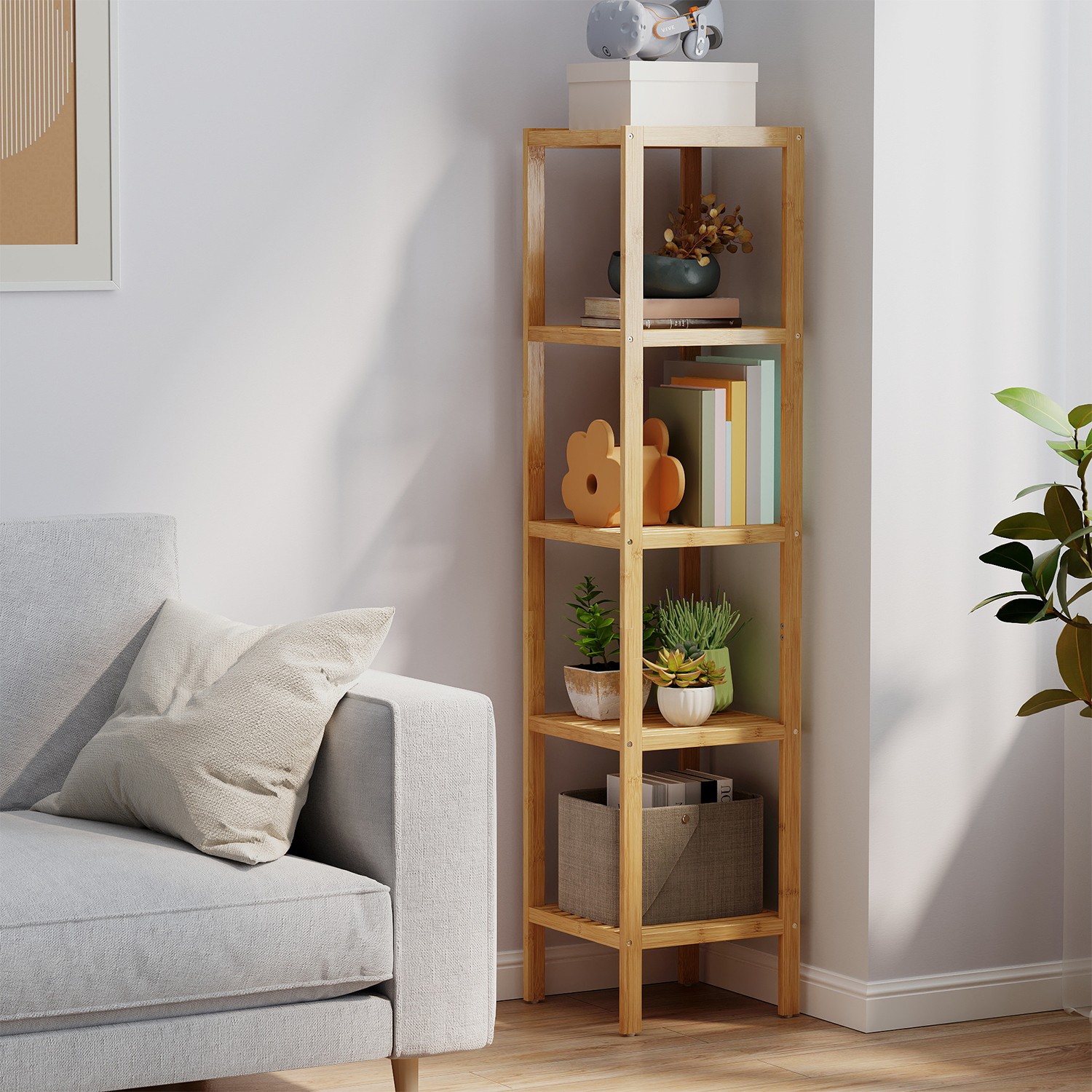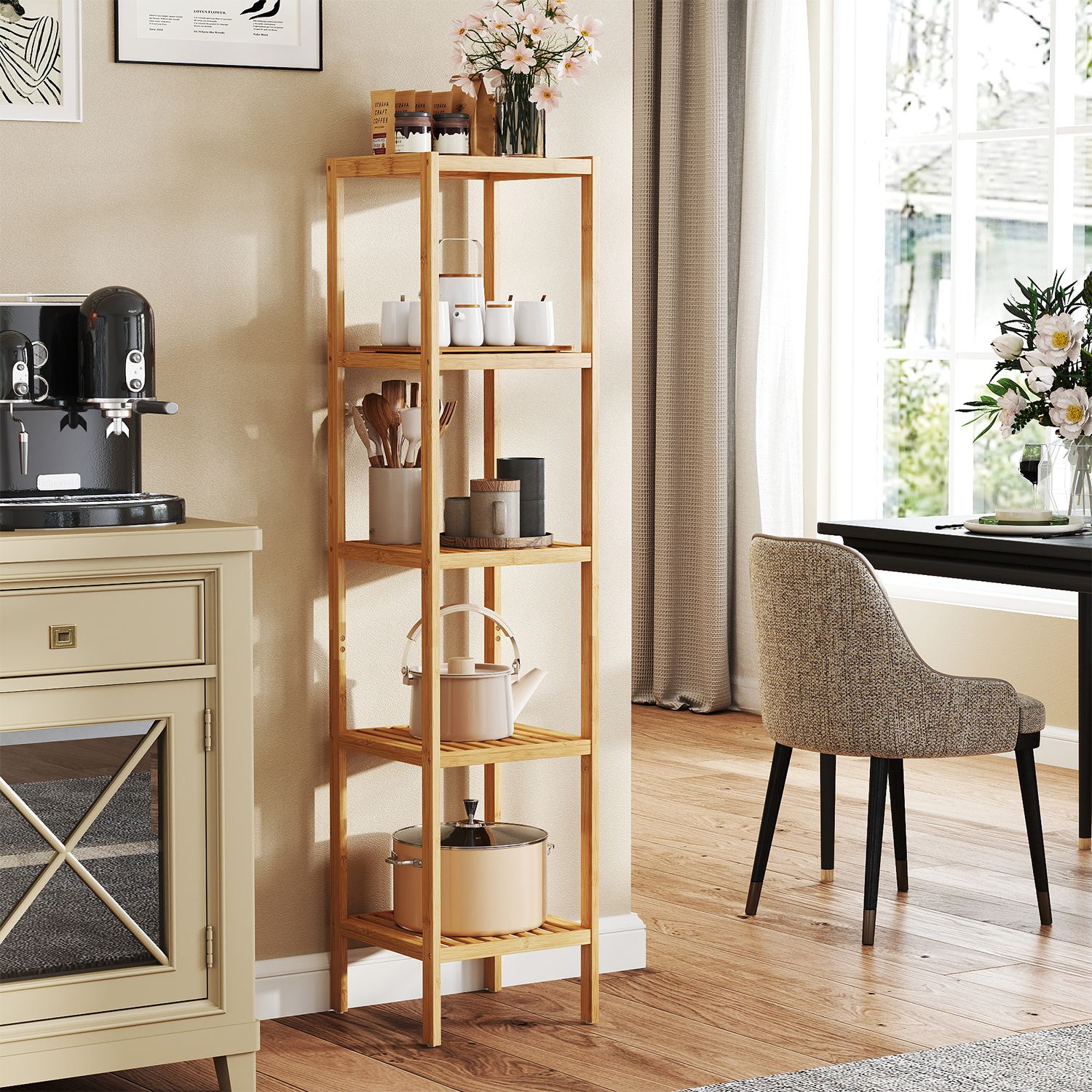 Do you need a storage shelf that can hold lots of items within easy reach and is sturdy enough to last for years? Would you also like to maximize the limited storage space in your home? Then try this bamboo shelf from SONGMICS! It will never let you down. Bamboo makes the difference What do you think of when you see bamboo? A natural material? Correct, but that’s not all! Bamboo is also wear-resistant and user-friendly. The material also has a long service life and retains its stylish appearance even after years of use. An eye-catcher everywhere! With its beautiful, well-crafted bamboo surface, this shelf adds a natural yet elegant touch to your home. From photo frames and shower gels to plants and cookware, everything will find its place here. Whether in the living room, bathroom, hallway, or kitchen—try out where the shelf looks best and let us know in the reviews! Product details: – Color: natural – Material: bamboo – Product size: 33 x 33 x 146 cm (L x W x D) – Distance between shelves: 13 cm – Weight: 4.6 kg Scope of delivery: – 1 x bamboo shelf – 1 x Allen key – 1 x instructions (DE, EN, FR, ES, IT) SONGMICS notes – It is recommended to attach the frame to the wall using the supplied anti-tip device for additional safety.