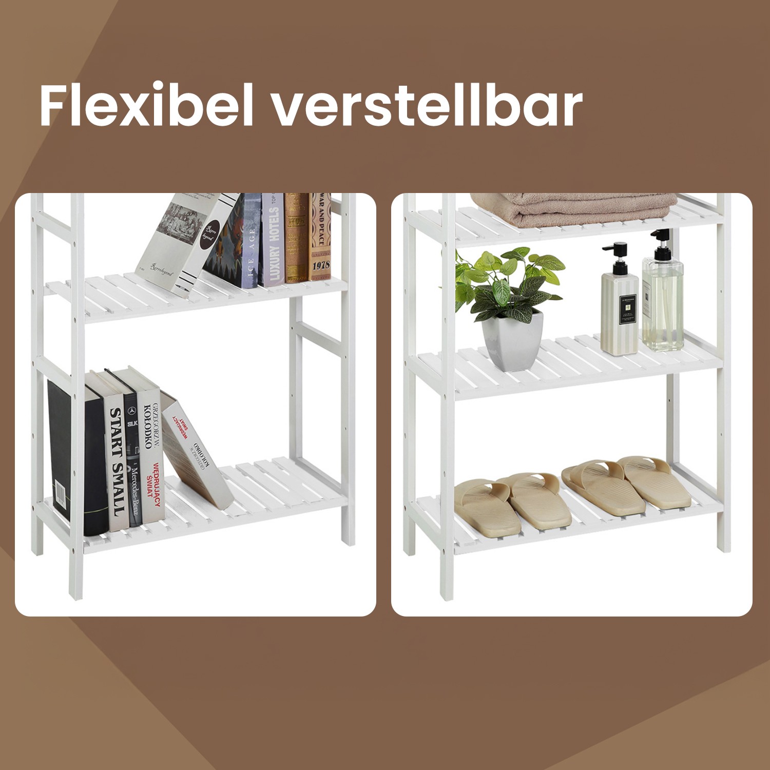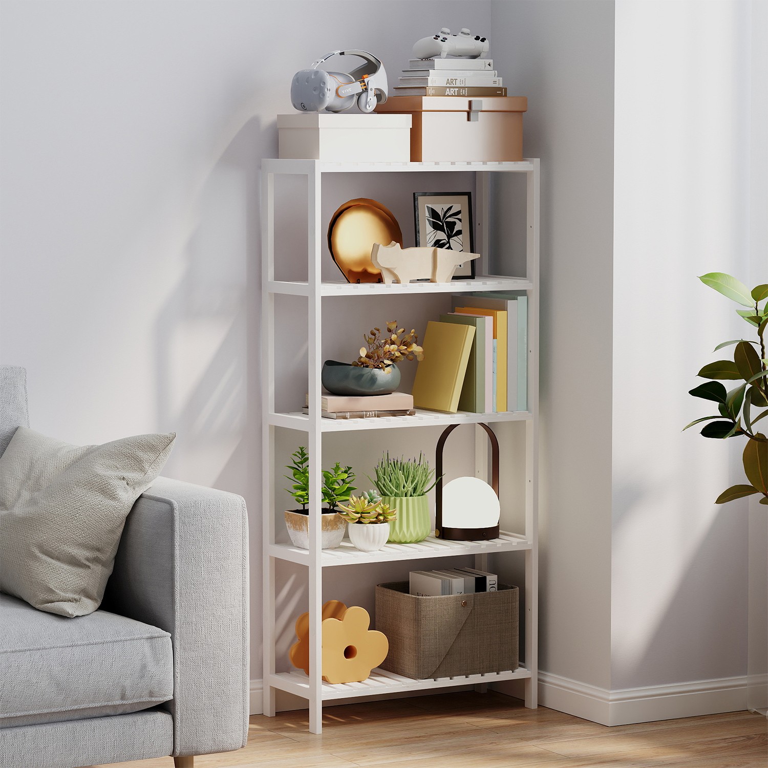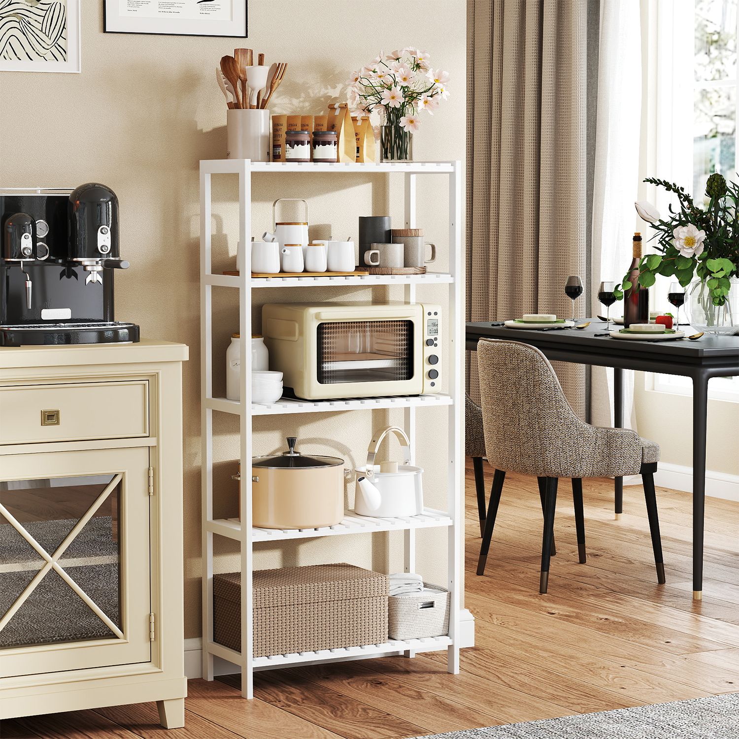 What a stylish highlight: made from natural bamboo, this modern shelf brings a breath of fresh air into your home. Equipped with 5 adjustable shelf levels, it also offers you flexible storage space, while saving a lot of space thanks to its narrow shape. Get this all-purpose shelf and free your home from chaos! You can’t go wrong with this shelf: bamboo is not only a renewable raw material, but also a robust, easy-care, and highly durable material. Place this bamboo shelf wherever you need it, and it will be a great help with storage—in the living room, study, hallway, kitchen, balcony, etc. Product details: Color: White Material: Bamboo Size: 60 x 26 x 130 cm (L x W x H) Weight: 5.76 kg Max. static load capacity per shelf: 10 kg Scope of delivery: 1 x bamboo shelf with 5 levels 1 x anti-tip device 1 x container with accessories 1 x instructions (DE, EN, FR, ES, IT) SONGMICS notes:This product should be secured to the wall with the included anti-tip device to prevent tipping. Please wipe the product with a damp cloth for daily cleaning.