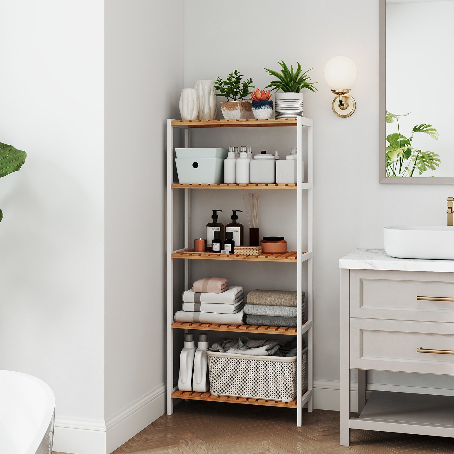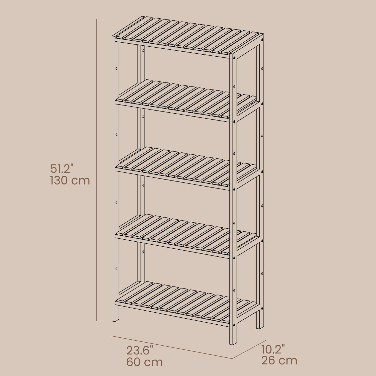 What a stylish highlight: made from natural bamboo, this modern shelf brings a breath of fresh air into your home. Equipped with 5 adjustable shelf levels, it also offers you flexible storage space, while saving a lot of space thanks to its narrow shape. Get this all-purpose shelf and free your home from chaos!You can’t go wrong with this shelf: bamboo is not only a renewable raw material, but also a robust, easy-care, and highly durable material. Place this bamboo shelf wherever you need it and it will be a great help with storage—in the living room, study, hallway, kitchen, balcony, etc. Product details:Color: White-natural Material: Bamboo Size: 60 x 26 x 130 cm (L x W x H) Weight: 5.76 kg Max. static load capacity per shelf: 10 kg Scope of delivery: 1 x bamboo shelf with 5 levels 1 x anti-tip device 1 x container with accessories SONGMICS Notes:This product should be secured to the wall with the included anti-tip device to prevent tipping. Please wipe the product with a damp cloth for daily cleaning.