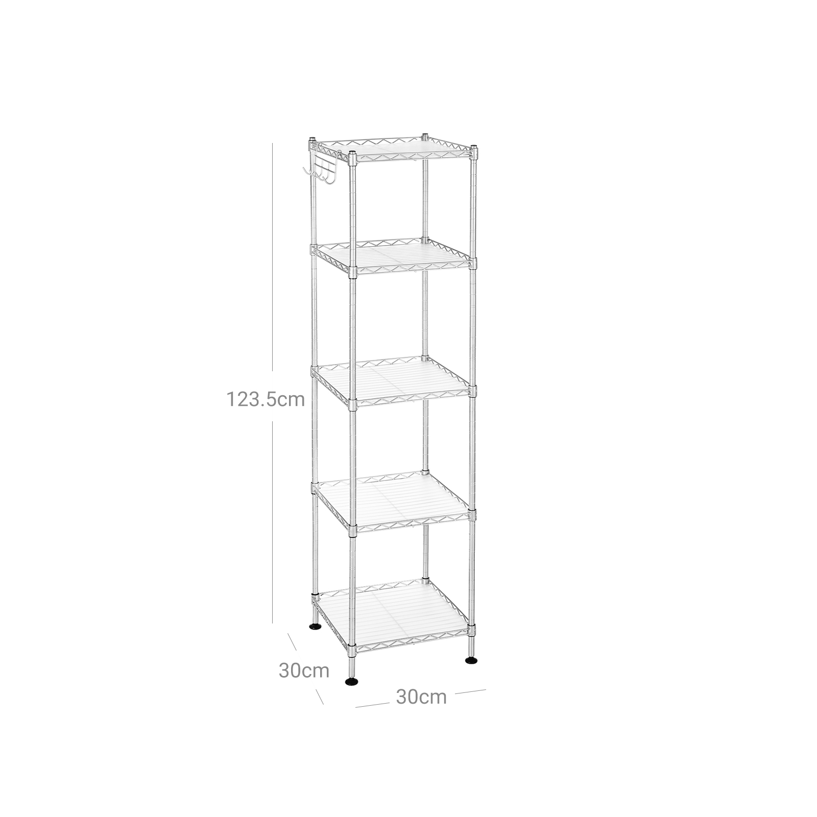 Every room loves it: this 30 x 30 x 123.5 cm storage shelf is space-saving and fits in almost any room: in the living room for potted plants and decorations, in the laundry room for detergent and fabric softener, or in the kitchen for spices and cooking utensils. No tools required: are you all thumbs? No problem! Thanks to the numbered parts and easy-to-follow instructions, you can assemble this bathroom shelf in no time. By the way, no tools or screws are required for assembly. Product details: Color: Silver Material: Powder-coated steel Size: 30 x 30 x 123.5 cm (L x W x H) Weight: 4 kg Max. static load capacity per shelf: 20 kg Scope of delivery: 1 x bathroom shelf 2 x anti-tip devices 1 x instructions (DE, EN, FR, ES, IT) SONGMICS notes: When assembling the plastic clips, the TOP arrow should always point upwards. After assembly, check all clips to ensure that they cannot be moved. Ensure that all clips are properly locked into the recesses of the stand pipes so that the shelves are parallel to your kitchen table. Please secure the product to the wall with the anti-tip device to ensure safe use. The max. load capacity in the text refers to the maximum static weight.