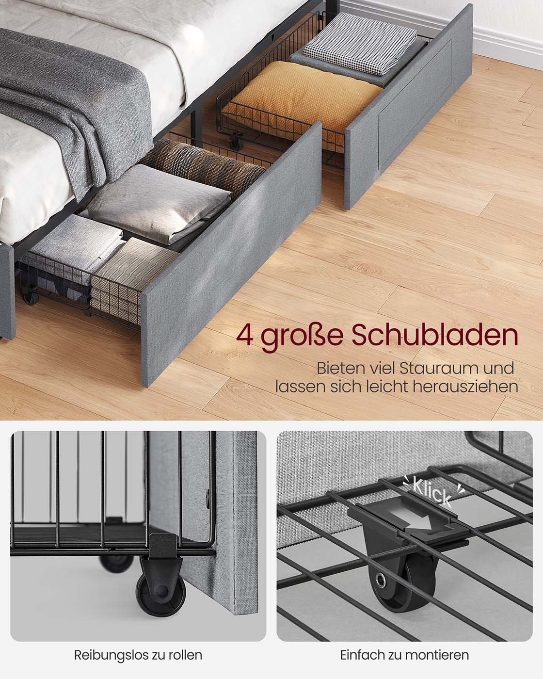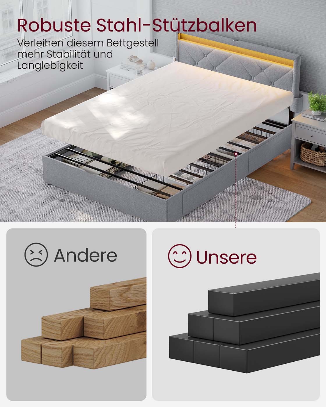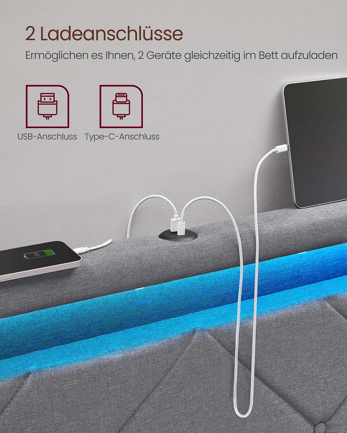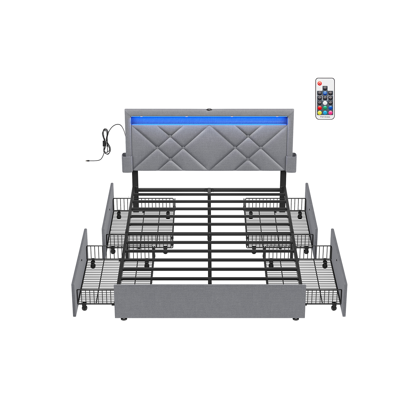 VASAGLE double bed frame, bed frame, 160 x 200 cm, LED, metal bed, 4 drawers, charging station, adjustable upholstered headboard, slate gray-matte black RMB828G02