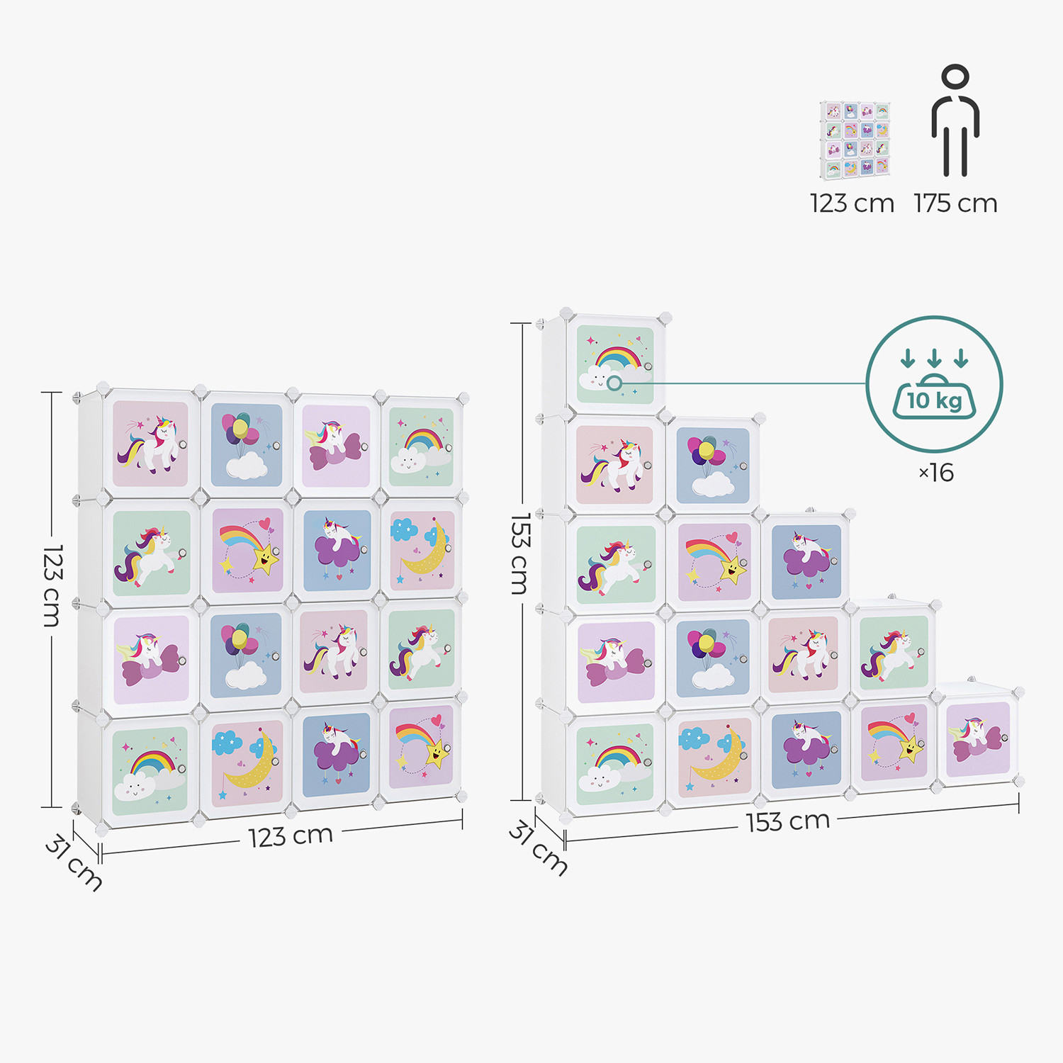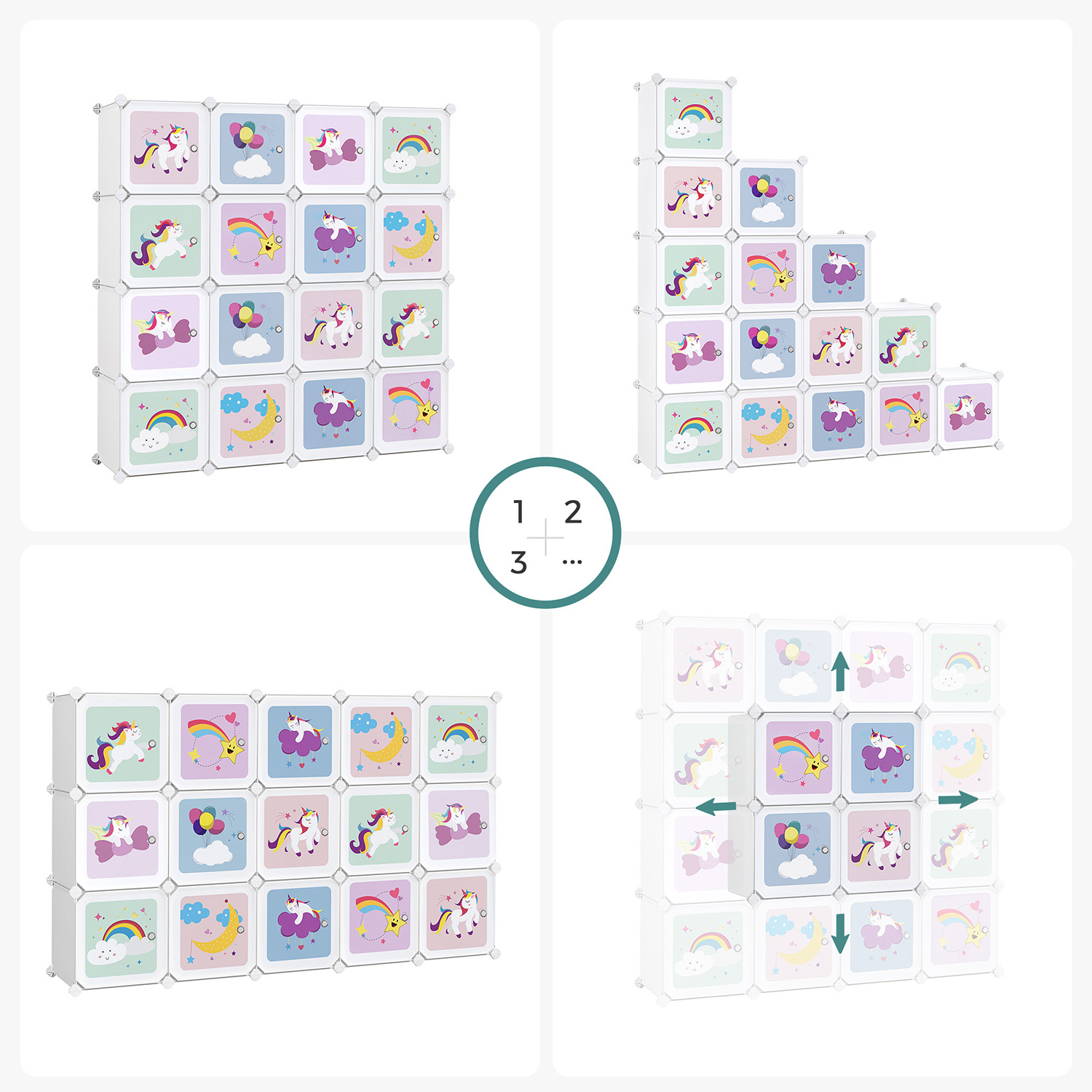 Keep chaos at bay! Never again will you have to deal with the following situation: “Mom, where are my socks?” This cute cube shelf encourages your little ones to tidy up their room themselves. This cabinet provides a place for your children’s socks, clothes, toys, or books. Discover even more possibilities: this plug-in shelf offers a wide range of uses. You can assemble it individually and adapt it to your room. Thanks to the unusual patterns and fresh colors, your children will love this storage cube with unicorn motifs. Product details:- Color: White – Material: PP plastic panels with metal frame, ABS plastic connectors – Size (15 cubes): 153 x 31 x 153 cm (L x W x H) – Size (16 cubes): 123 x 31 x 123 cm (L x W x H) – Size per cube: 30 x 30 x 30 cm (L x W x H) – Weight: 10.5 kg – Max. static load capacity per cube: 10 kg Scope of delivery:- 56 x plastic panels in milk white (30 x 30 cm)- 16 x door panels with pattern (30 x 30 cm)- 52 x ABS plastic connectors in white- 1 x hammer- 2 x anti-tip devices- 1 x instruction manualSONGMICS Notes:- Please attach this product to the wall using the included anti-tip device to ensure safe use. – Not suitable for children under 3 years of age. Children over 3 years of age may only use the product under adult supervision. – Please do not assemble the product if any parts are missing or defective. In this case, please contact us immediately so that we can send you replacement parts.