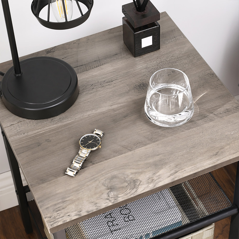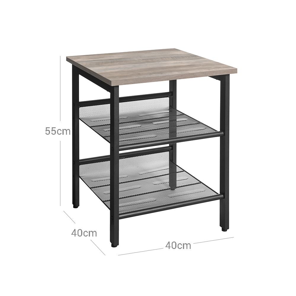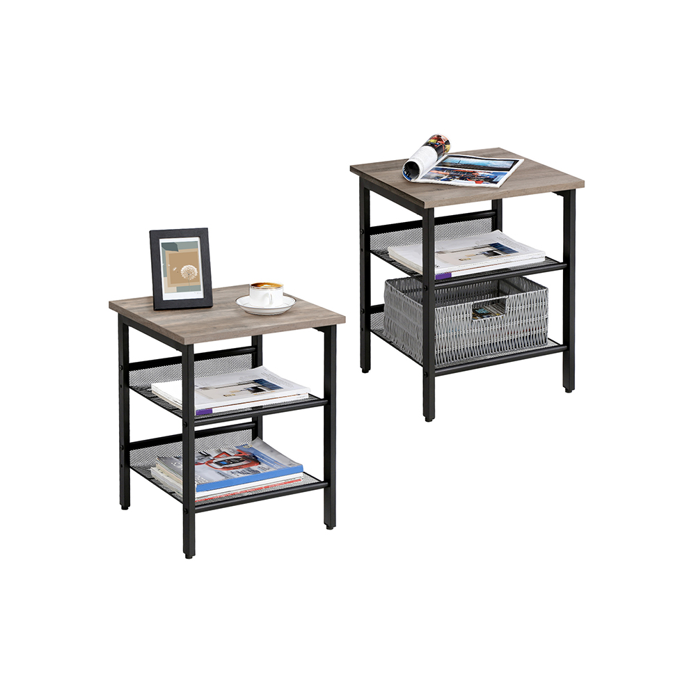 Product details: – Color: Greige-black – Material: Chipboard, steel – Size: 40 x 40 x 50 cm (L x W x H) – Total weight: 8 kg – Max. static load capacity of the table surface: 20 kg – Max. static load capacity per wire shelf: 5 kg Scope of delivery:- 2 x side tables – 1 x accessory pack – 1 x instructions (DE, EN, ES, FR, IT) VASAGLE Notes: – For safety reasons, children are not allowed to climb on or play with the product.