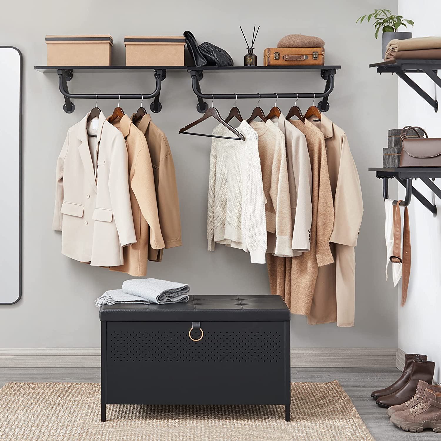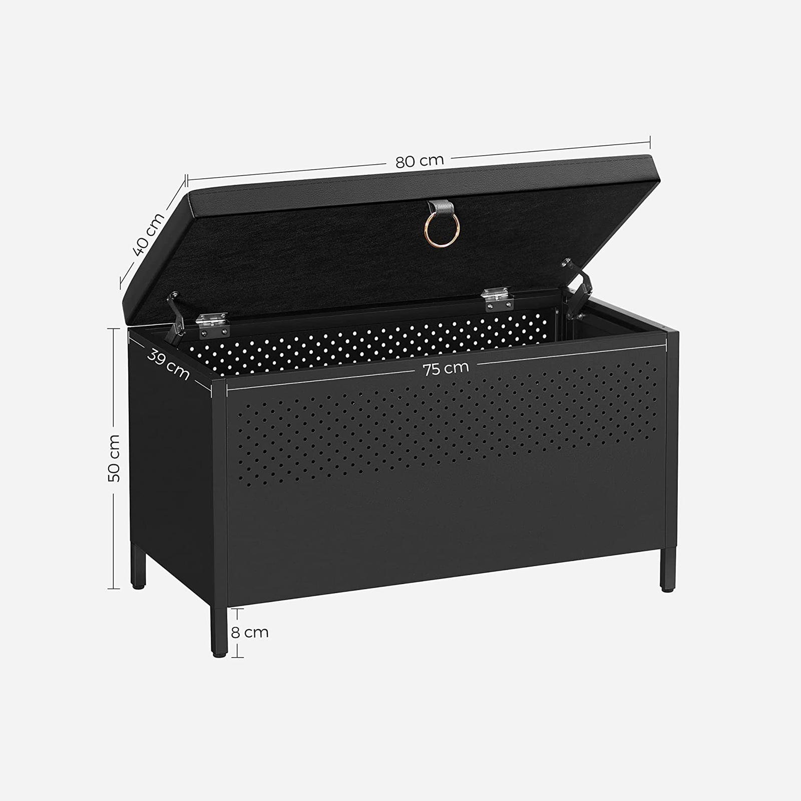 Product details: Color: Matte black Material: Chipboard, steel, PVC, foam Size: 80 x 40 x 50 cm (L x W x H) Weight: 12.3 kg Max. static load capacity of the seat: 130 kg Max. static load capacity of the storage box: 50 kg Scope of delivery: 1 x storage bench with storage space 1 x accessory package 1 x instructions SONGMICS notes:If you decide to install the casters, for safety reasons, do not move the product while sitting on the bench. For safety reasons, children are not allowed to climb on or play with the product. The maximum static load capacity of the seat is 130 kg. Please do not exceed this maximum weight.