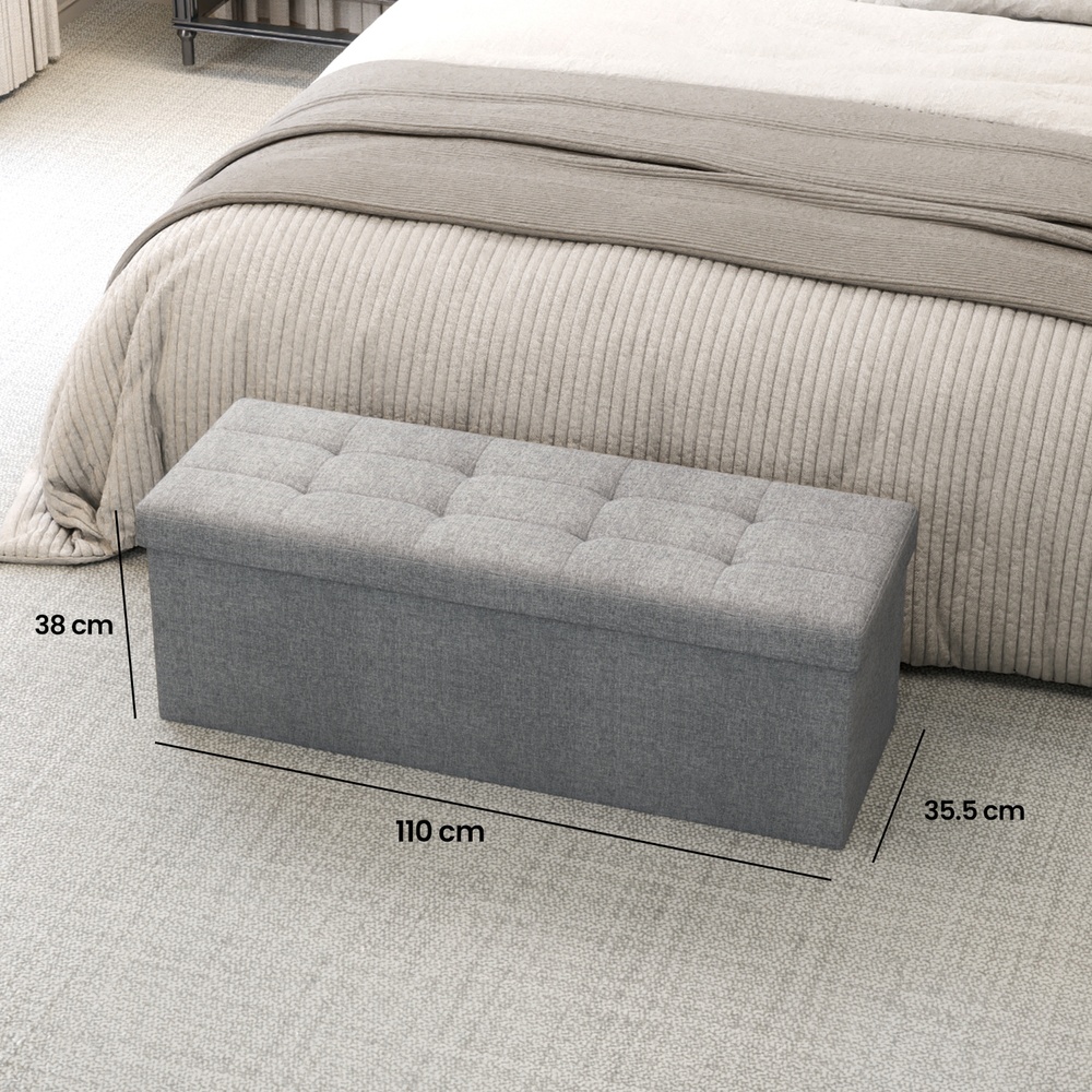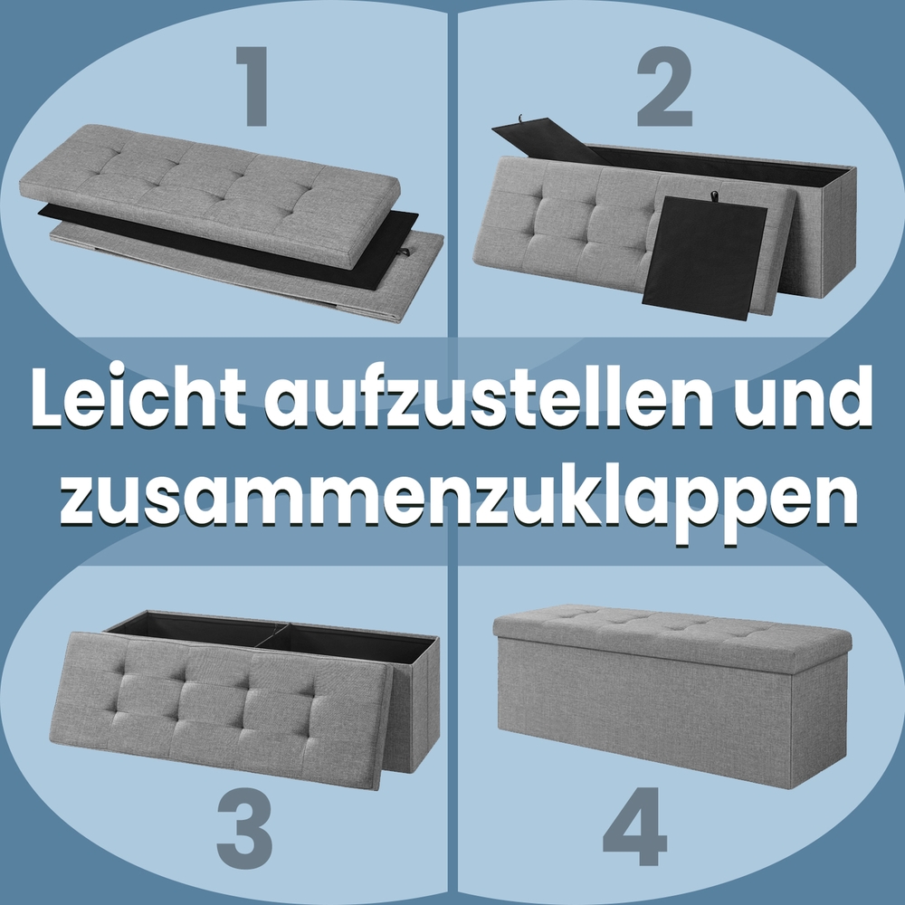 Bench with storage space, sit, store, decorate This storage bench from SONGMICS is the perfect addition to your home furnishings. Thanks to its clever design, the box is suitable for multiple purposes and serves as a practical shoe bench, bed chest, or additional seating in the living room, especially in smaller apartments. Make yourself comfortable on the soft cushion of the bench and run your hand over the pleasant imitation linen cover. Not only is this extremely durable, but the entire construction is made of high-quality MDF, which achieves a maximum static load capacity of 300 kg. Product details: – Color: Light gray – Material: Imitation linen, MDF (medium-density fiberboard), foam – Dimensions (outside): 110 x 38 x 38 cm (W x H x D) – Dimensions (inside): 107 x 33.5 x 34 cm (L x W x H) – Dimensions (folded): 110 x 38 x 7 cm (L x W x H) – Weight: 8.6 kg – Max. static load capacity: 300 kg Scope of delivery: – 1 x storage bench SONGMICS notes: – The bench is not a toy! Use by small children is only permitted under the direct supervision of adults.