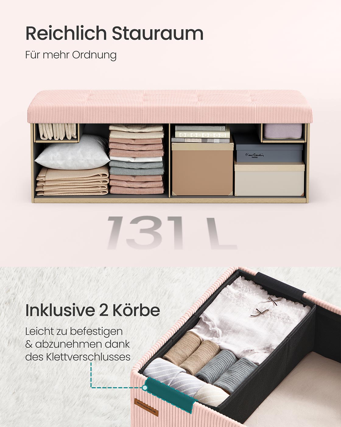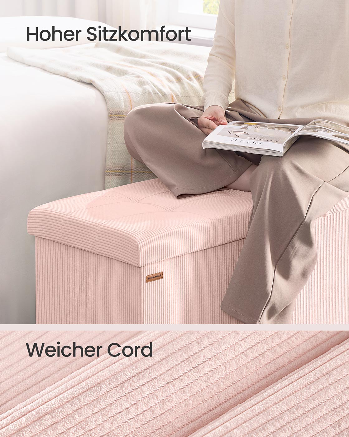 SONGMICS bench with storage space, foldable footstool, 38 x 76 x 38 cm, bed bench, storage box, load capacity up to 300 kg, living room, bedroom, entrance area, pastel pink LSF603R01