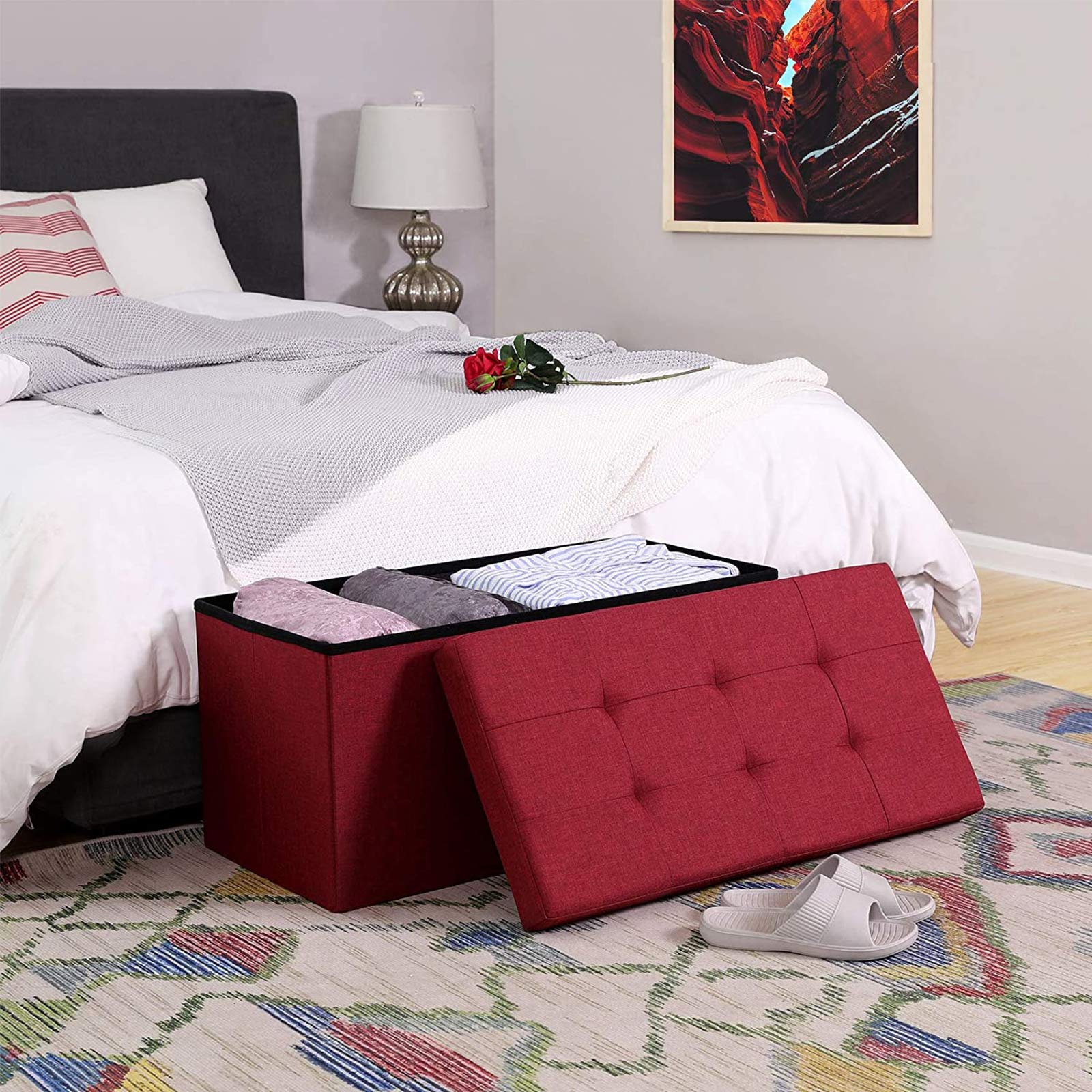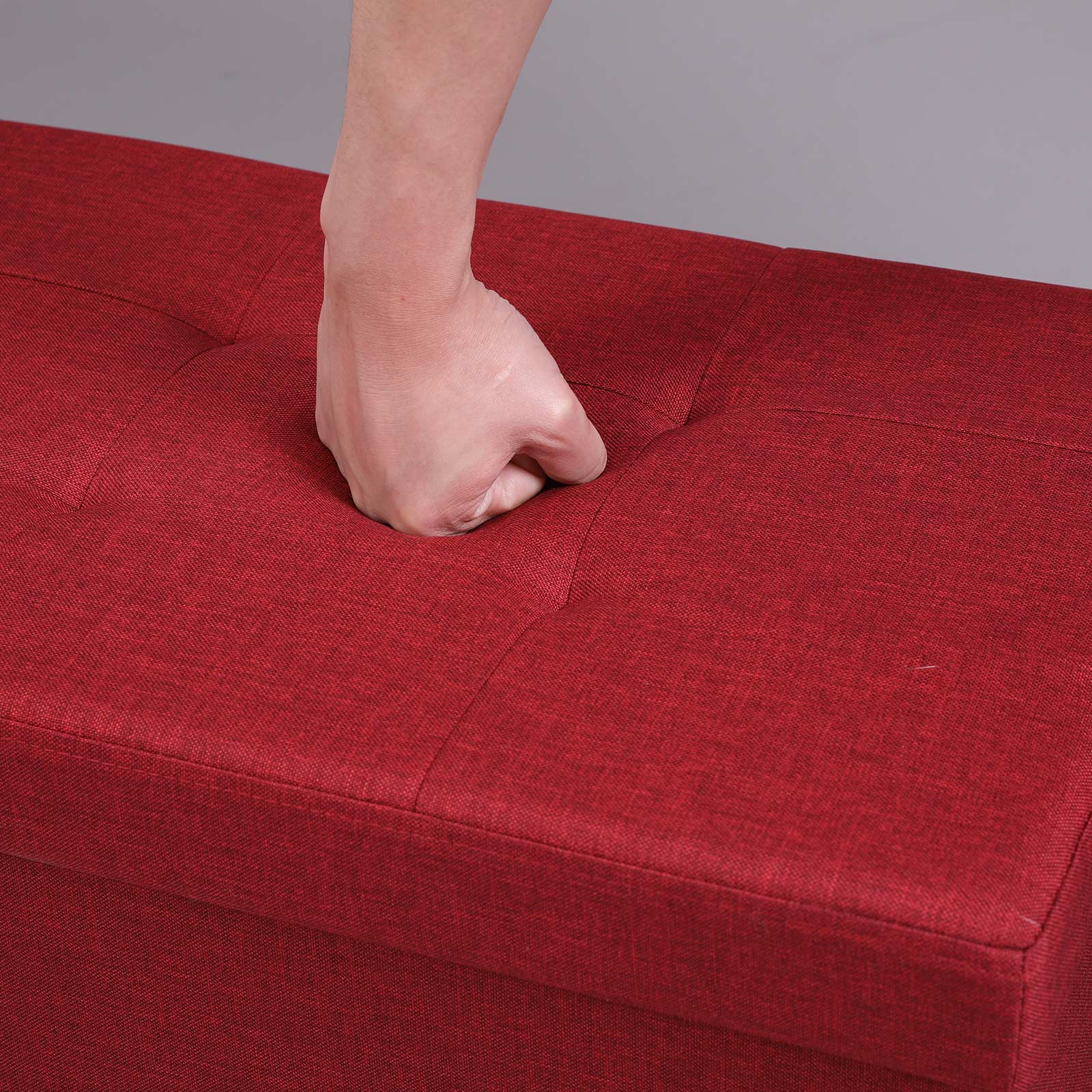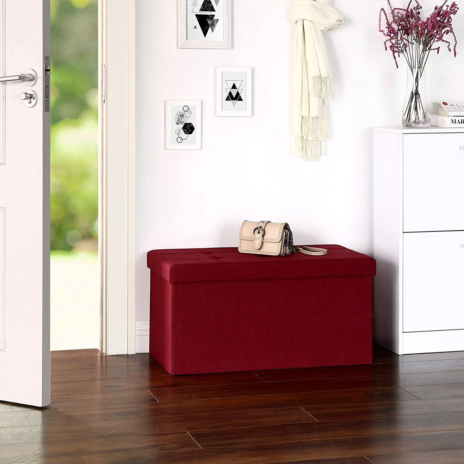 This storage bench from SONGMICS is the perfect addition to your home furnishings. Thanks to its clever design, the box is suitable for multiple purposes and serves as a practical shoe bench, bed storage chest, or additional seating in the living room, especially in smaller apartments. Make yourself comfortable on the soft cushion of the bench and run your hand over the pleasant imitation linen cover. Not only is this extremely durable, but the entire construction is made of high-quality MDF, which achieves a maximum static load capacity of 300 kg. Product details: – Color: Red – Material: Imitation linen, foam, MDF (medium-density fiberboard) – Dimensions (outside): 76 x 38 x 38 cm (L x W x H) – Dimensions (inside): 73 x 33.5 x 34 cm (L x W x H) – Weight: 6.0 kg – Max. static load capacity: 300 kg Scope of delivery: – 1 x storage bench SONGMICS notes: – The bench is not a toy! Use by small children is only permitted under the direct supervision of adults. – Please do not stand on the product or use it as a ladder or climbing aid.