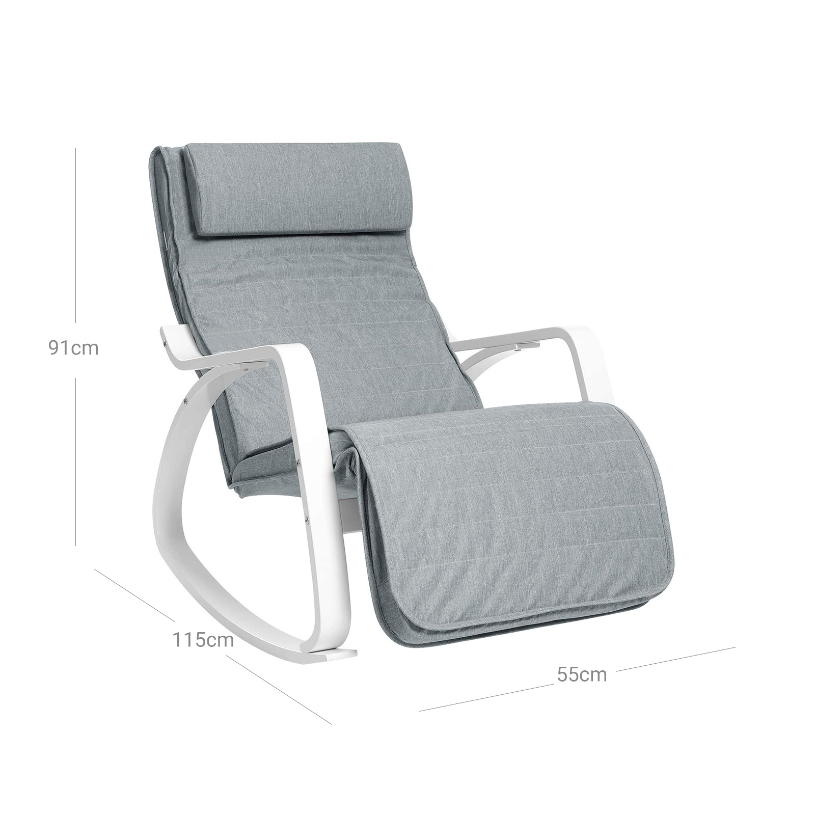 More relaxed than ever before This recliner has a 5-position adjustable footrest and extra soft padding for maximum comfort. Your children will fight over this chair and want to watch funny cartoons on it. In addition, this rocking chair is equipped with a sturdy birch wood frame and reinforced with a metal frame inside, so you can rock back and forth safely. Don’t wait any longer and get this comfortable rocking chair for your home. Time to relax! Product details: – Color: Light gray – Material: Birch wood, metal frame inside, foam padding, faux linen cover – Size: 67 x 115 x 91 cm (L x W x H) – Weight: 9.8 kg – Max. static load capacity: 150 kg Scope of delivery:- 1 x rocking chair – 1 x instructions (DE, EN, IT, FR, ES) SONGMICS Notes: – Please do not tighten the screws immediately during assembly. Only after you have inserted all the screws should you carefully tighten them. – Please do not leave the product outdoors for long periods of time.