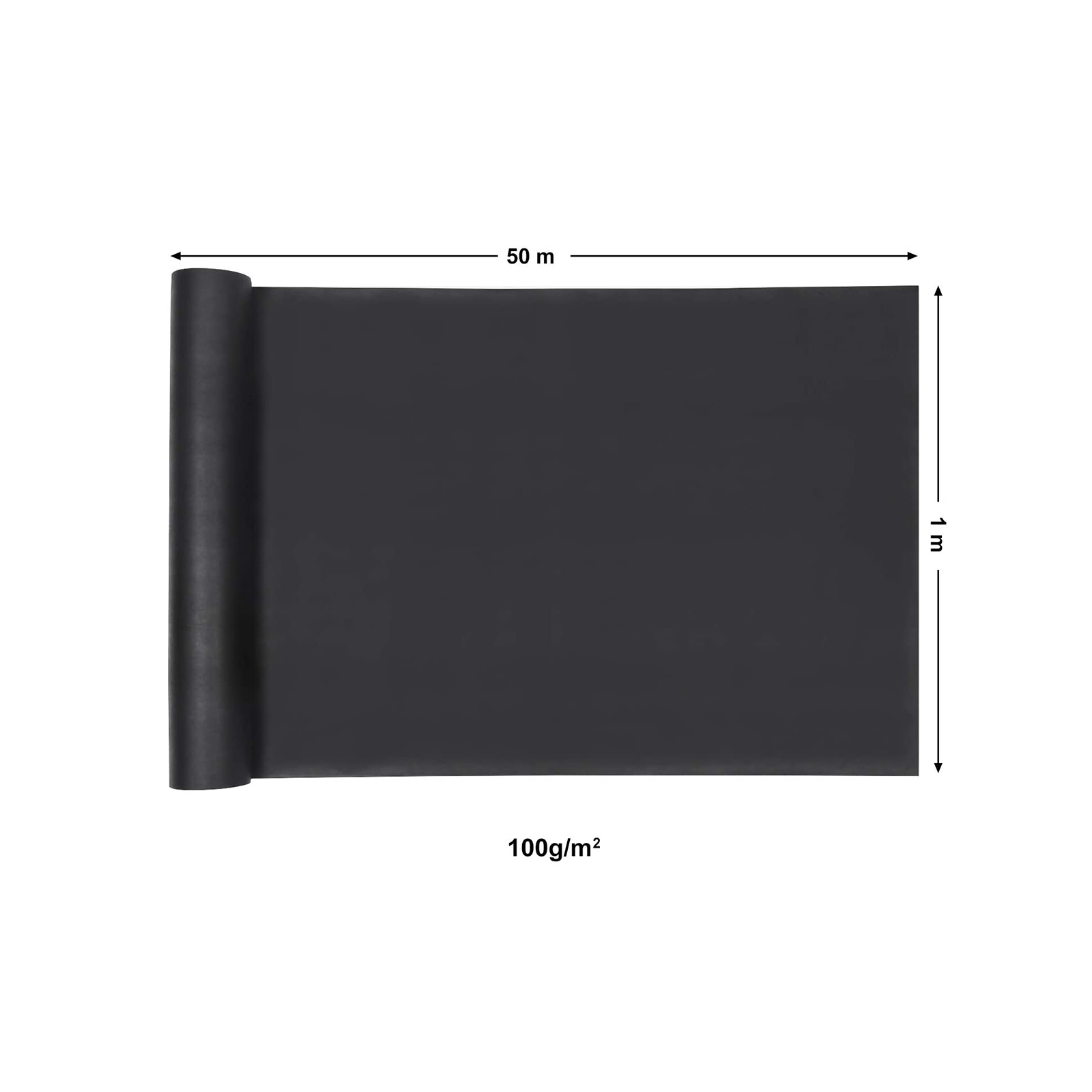 NO MORE DRAMA: Controlling weeds without chemicals does not mean you have to go back to the Stone Age. And you certainly don’t have to spend hours bent over your flower beds pulling weeds. This weed barrier fabric is your advanced ally in the fight against pesky plants. Lay this 100 g/m² PP film with UV stabilizer over your soil before planting flowers or vegetables. The fabric blocks the sun’s rays, which weeds need to sprout from the ground. Now you can finally stop worrying about those unwanted pests! THE SOIL STAYS NICELY MOIST: The garden fabric doesn’t just keep weeds at bay. The fabric is also breathable and water-permeable, allowing rain to flow through without any problems. The fabric also regulates moisture in the soil, allowing your plants to sprout healthily and vigorously. Product details: Color: Black Material: 100 g/m² PP (polypropylene), UV stabilizer Size: 1 m x 50 m (W x L) Weight: 6 kg Scope of delivery: 1 x garden fabric 10 x ground anchors