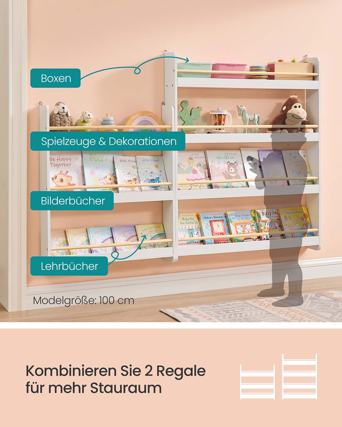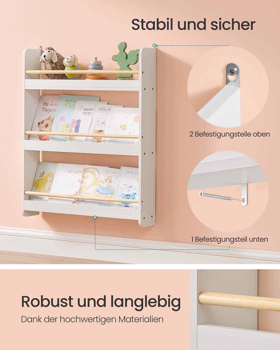 SONGMICS Children’s Bookshelf, Children’s Shelf with 3 Levels, Toy Shelf, Wall Shelf, for Children’s Rooms, Playrooms, White-Natural Color GKR013W02