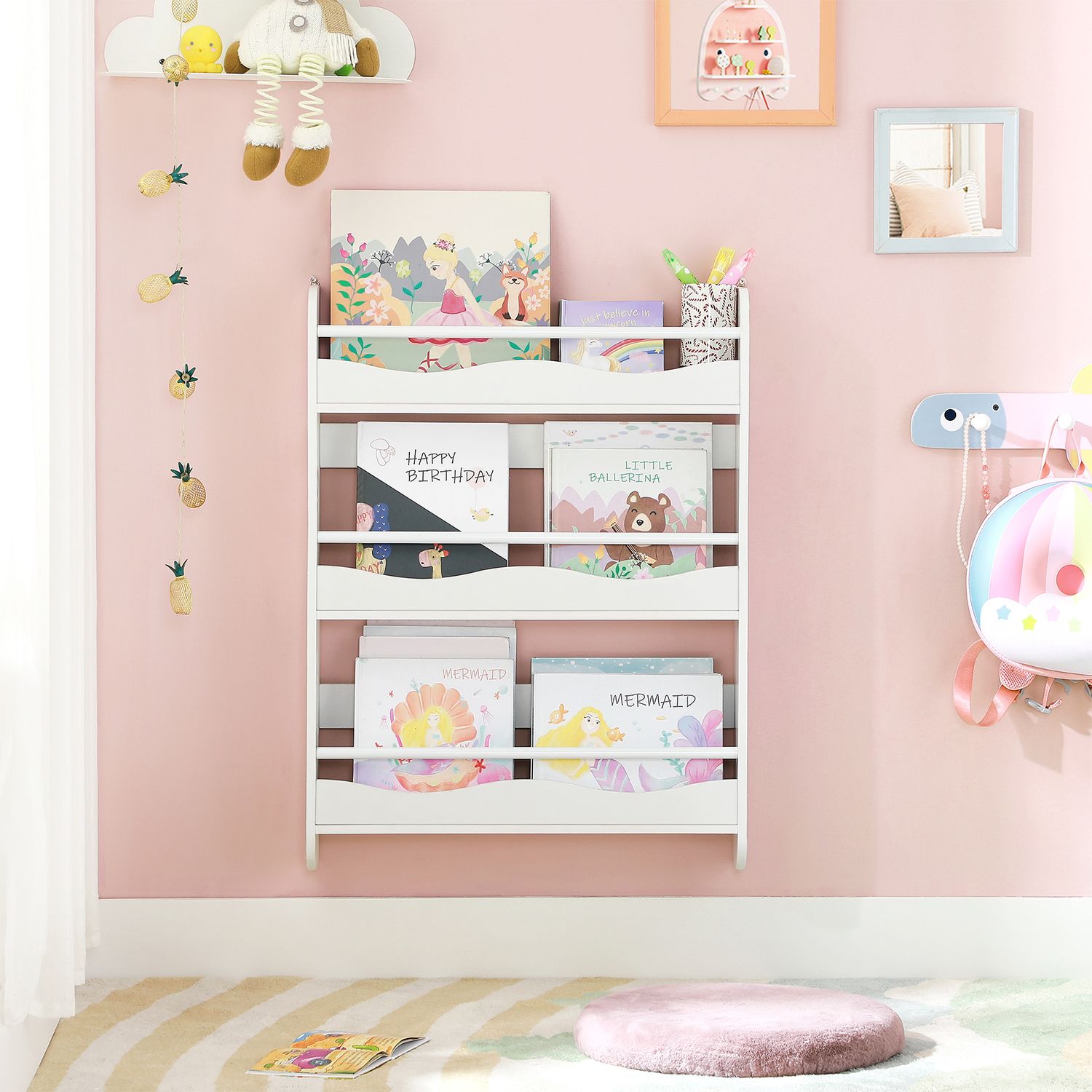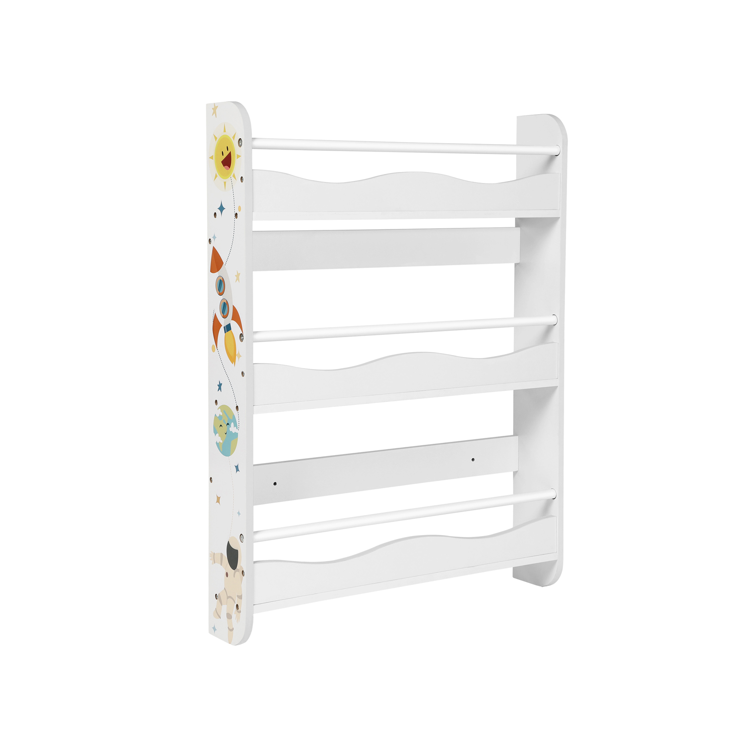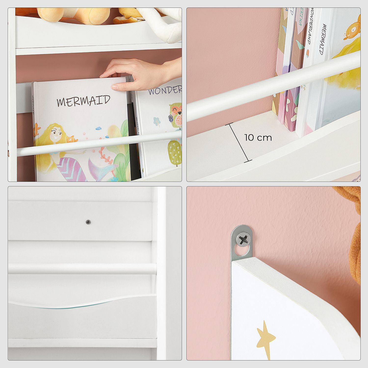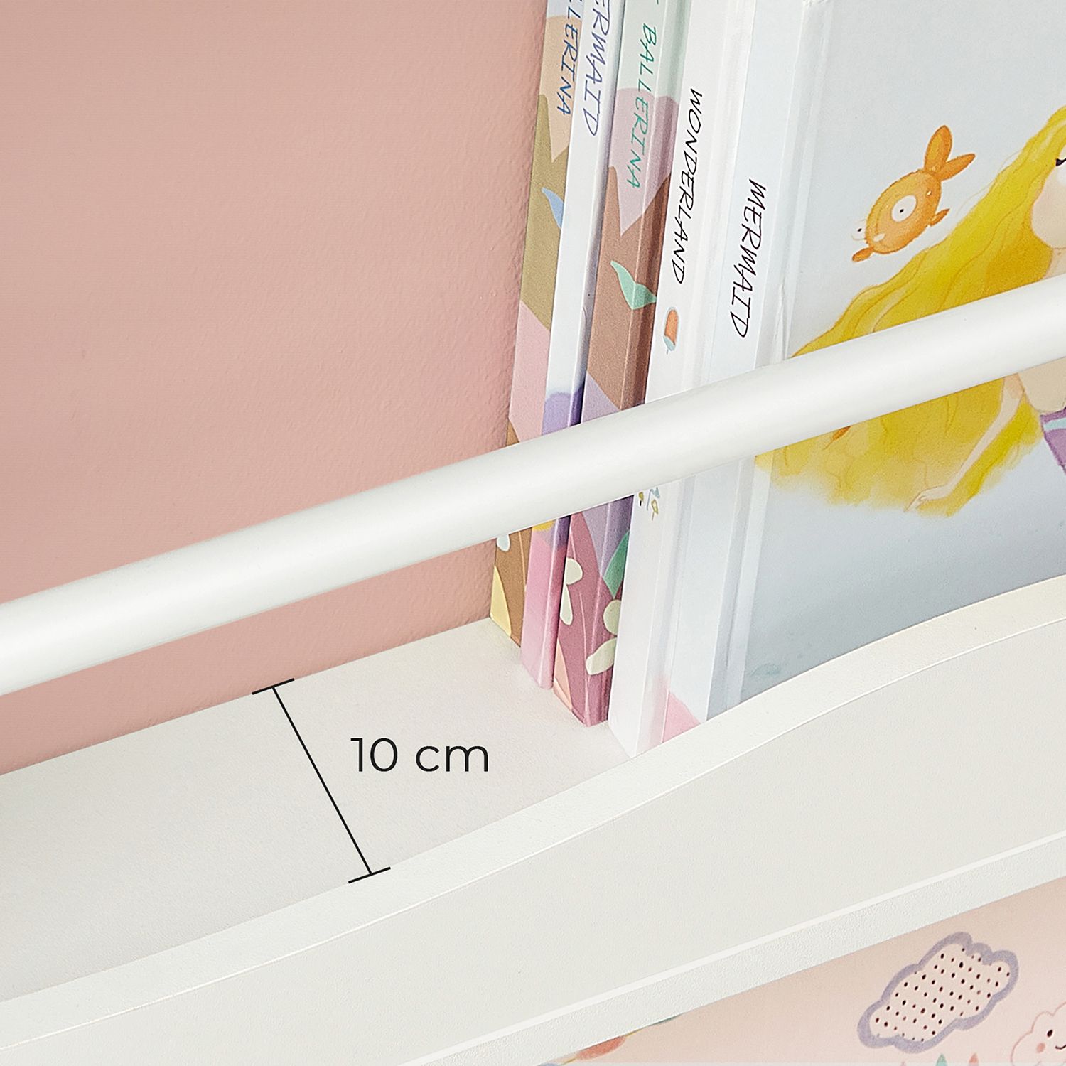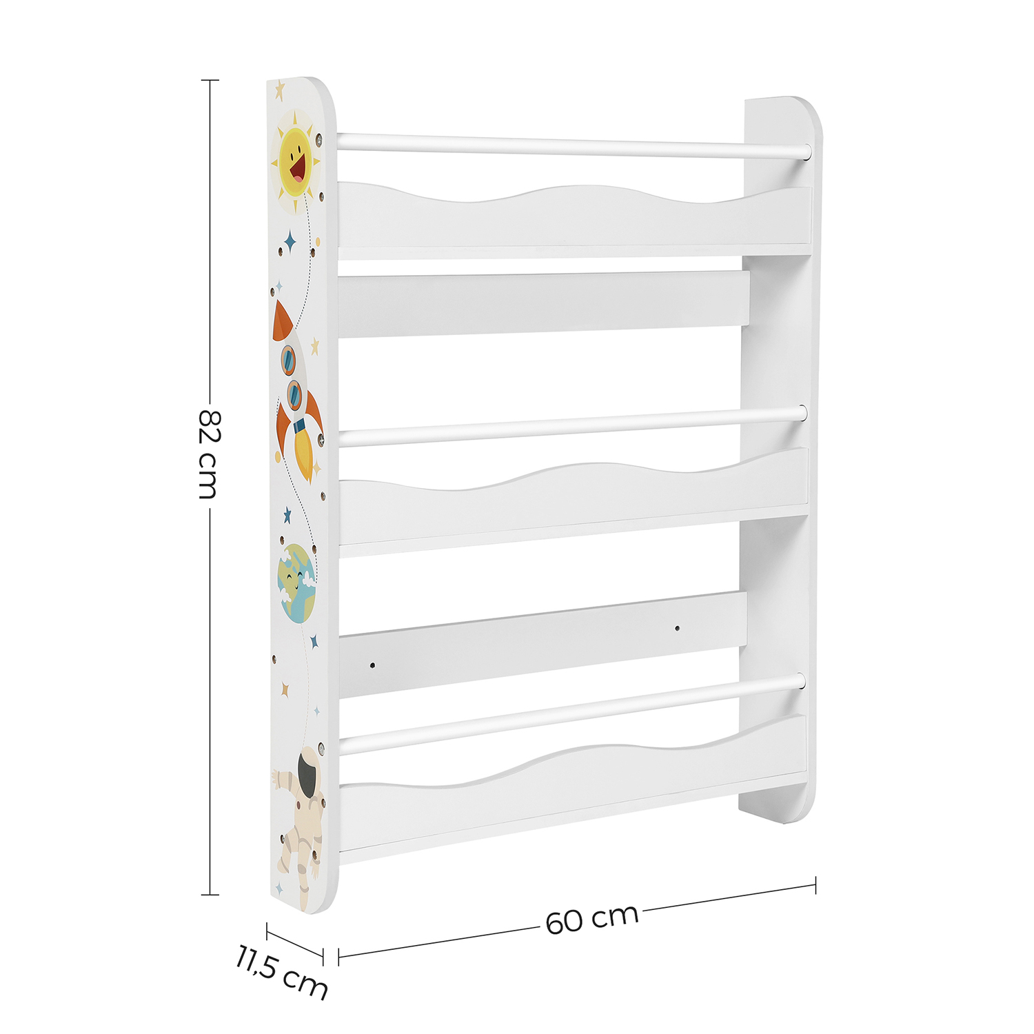 Books on the wall: No space for your children’s favorite books? This wall-mounted bookshelf is the perfect and safe home for them. With its open design and additional bars between the side panels, your children can easily access their books at a glance. And you don’t have to worry about books falling down. Unlimited exploration: The space motifs can encourage your children’s spirit of discovery, strengthen their interest in the universe, and stimulate their creativity. With a depth of 11.5 cm, the 3 shelves are ready for interesting stories while saving space in the children’s room, playroom, or classroom. Product details:- Color: White – Material: MDF (medium-density fiberboard), metal – Size: 60 x 11.5 x 82 cm (L x W x H) – Weight: 5.4 kg Scope of delivery: – 1 x bookshelf – 1 x accessory package – 1 x instructions