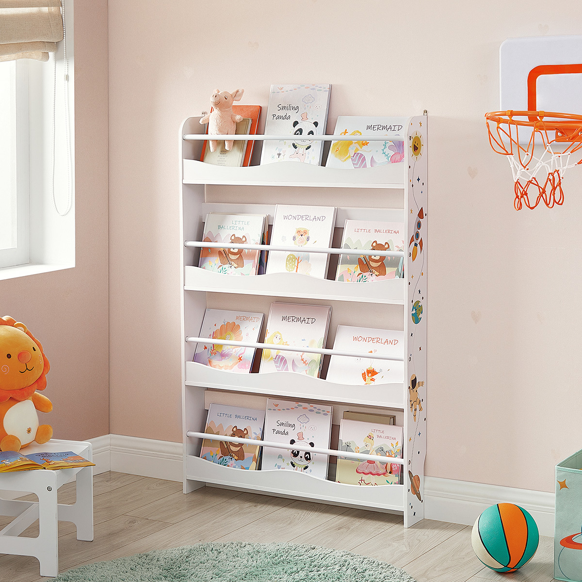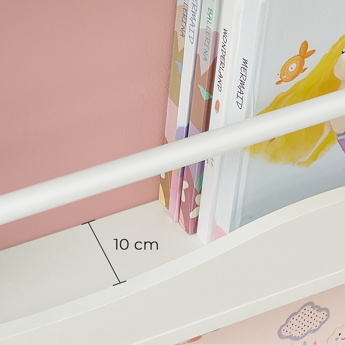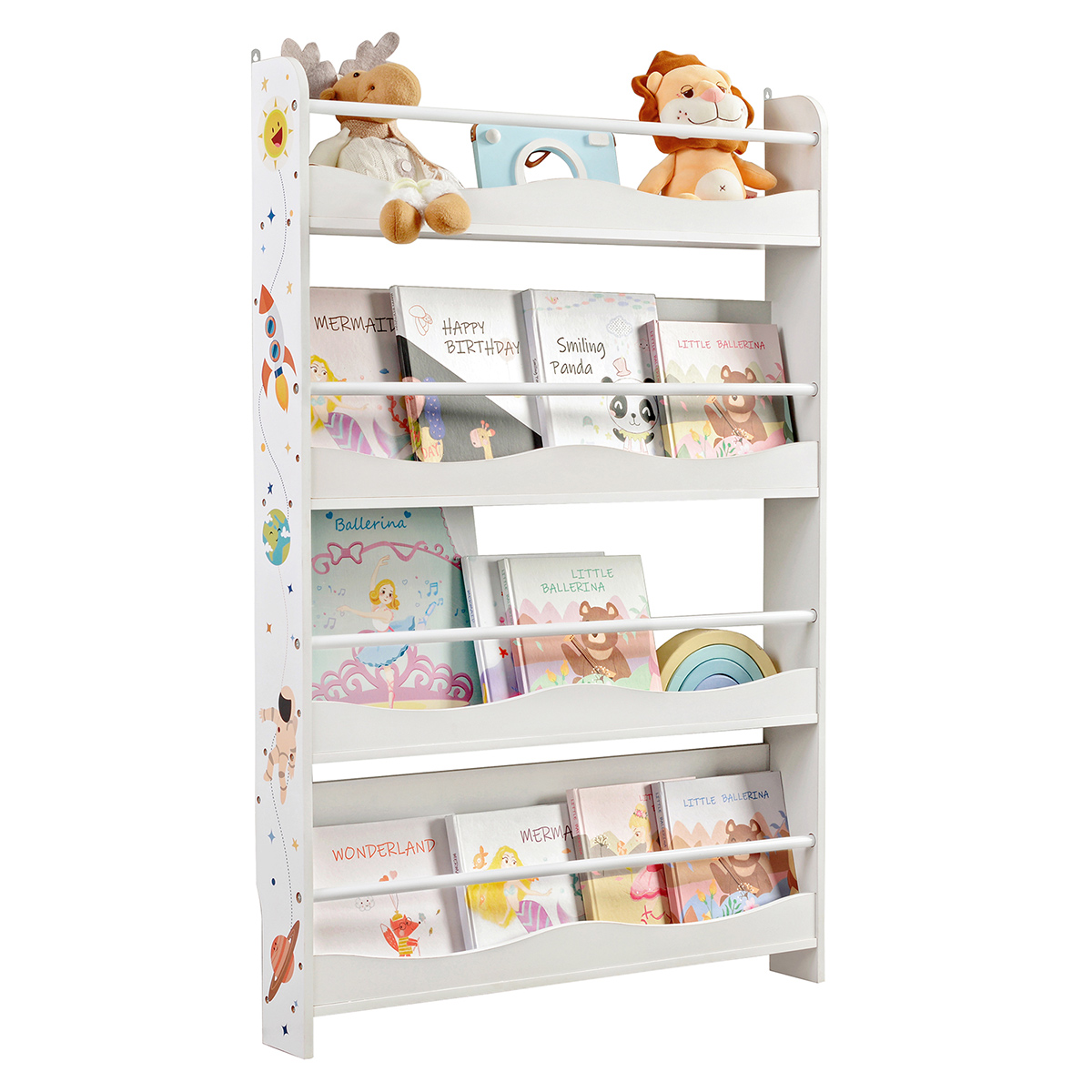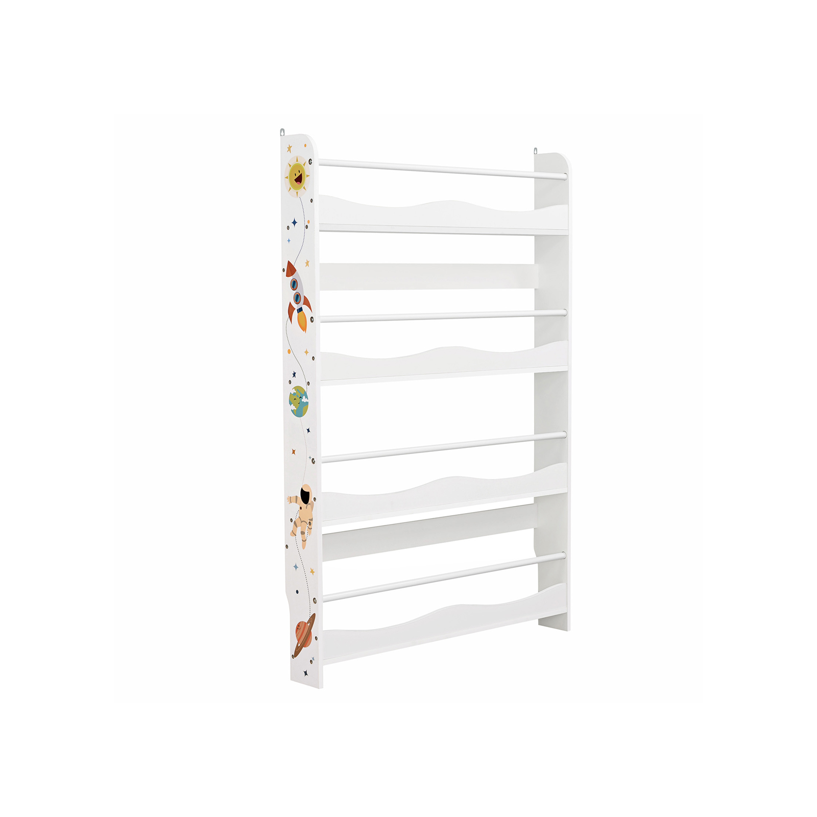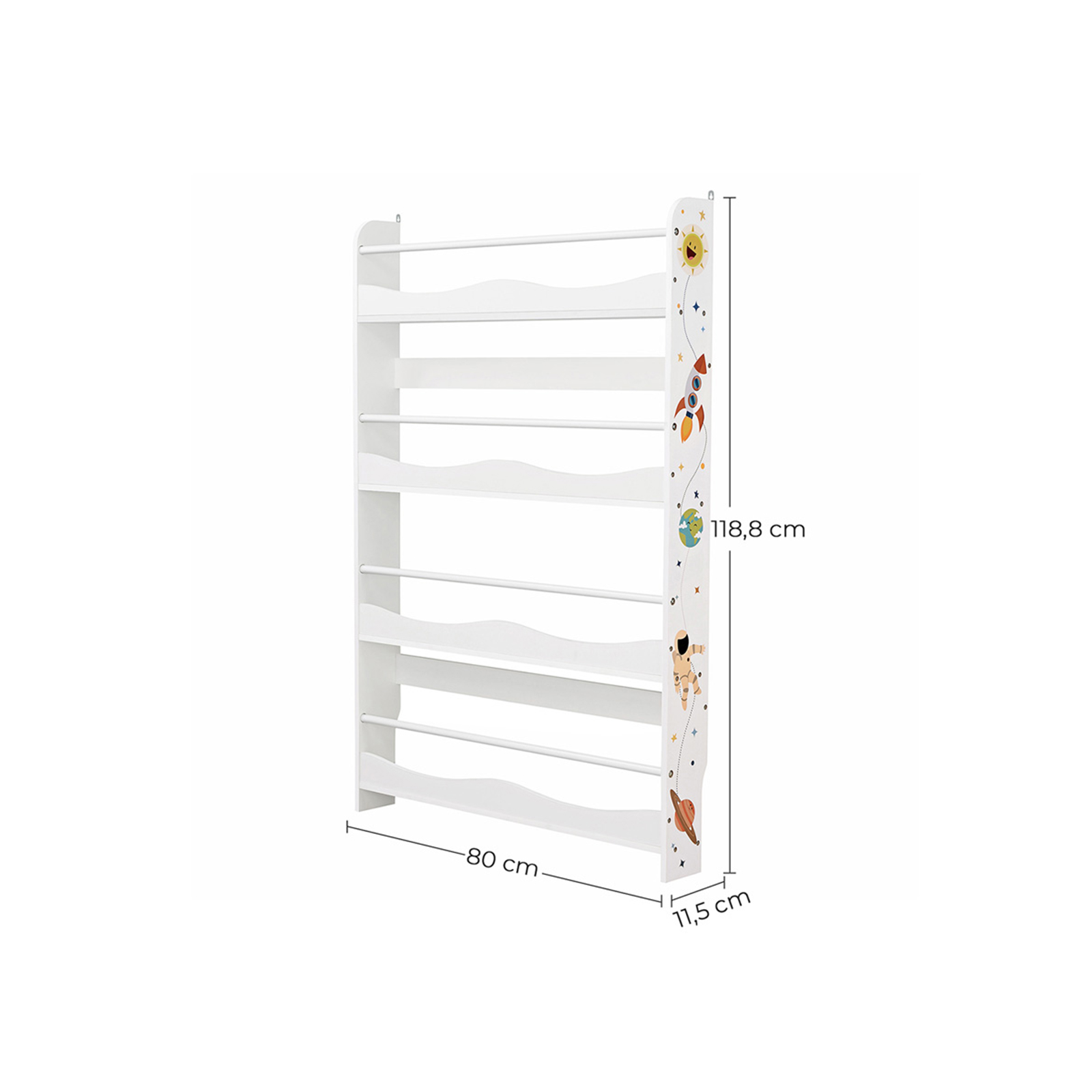 Books on the wall No space for your children’s favorite books? This wall-mounted bookcase is the perfect and safe home for them. With its open design and additional bars between the side panels, your children can easily access their books at a glance. And you don’t have to worry about books falling down. Unlimited exploration The space motifs can encourage your children’s spirit of discovery, strengthen their interest in the universe, and stimulate their creativity. With a depth of 11.5 cm, the 4 shelves are ready for interesting stories while saving space in the nursery, playroom, or classroom. Product details: – Color: White – Material: MDF (medium-density fiberboard), metal – Size: 80 x 11.5 x 118.8 cm (L x W x H) – Weight: 8.4 kg Scope of delivery: – 1 x bookshelf – 1 x accessory pack – 1 x instructions (DE, EN, FR, ES, IT) SONGMICS notes: – Please wipe the product with a damp cloth for daily cleaning.