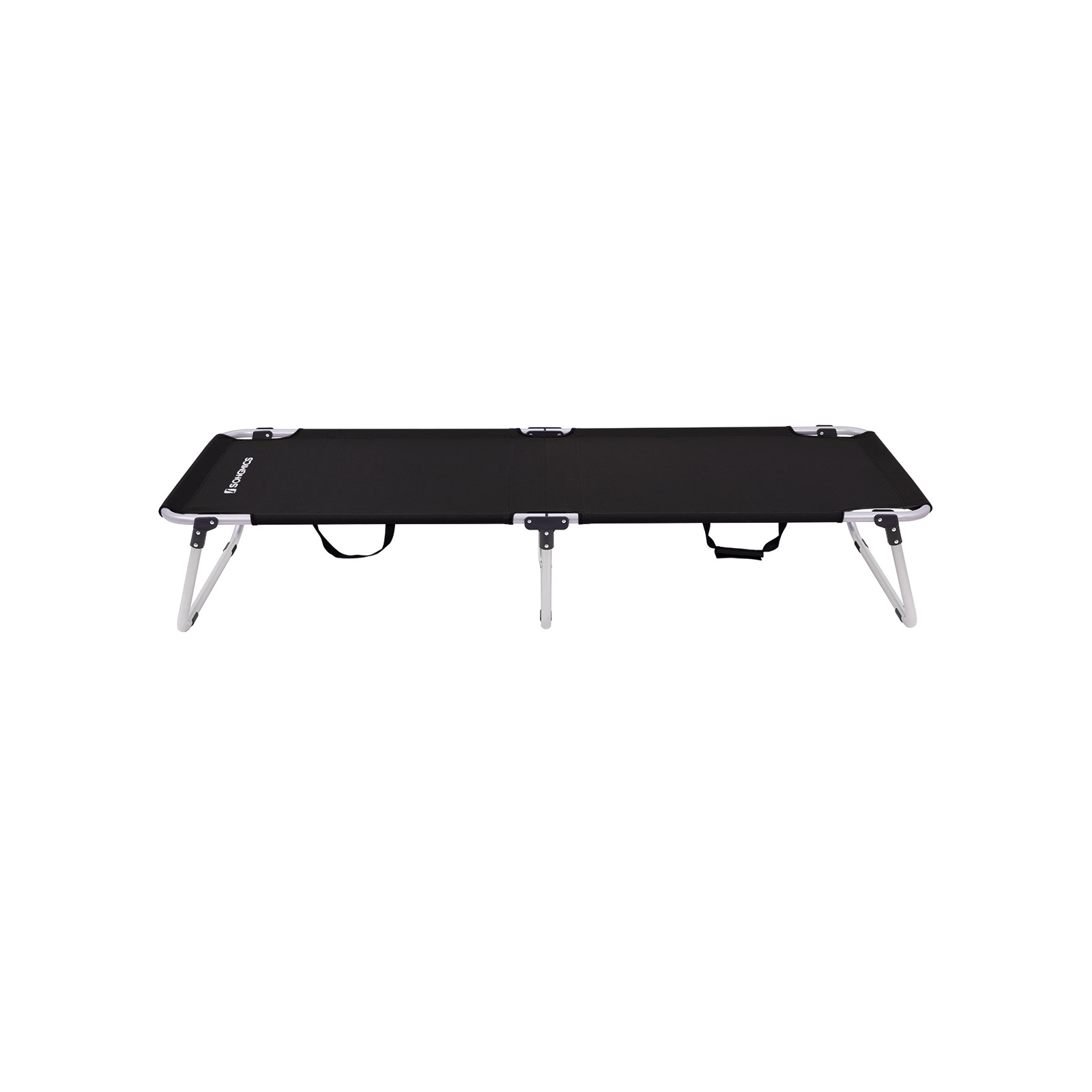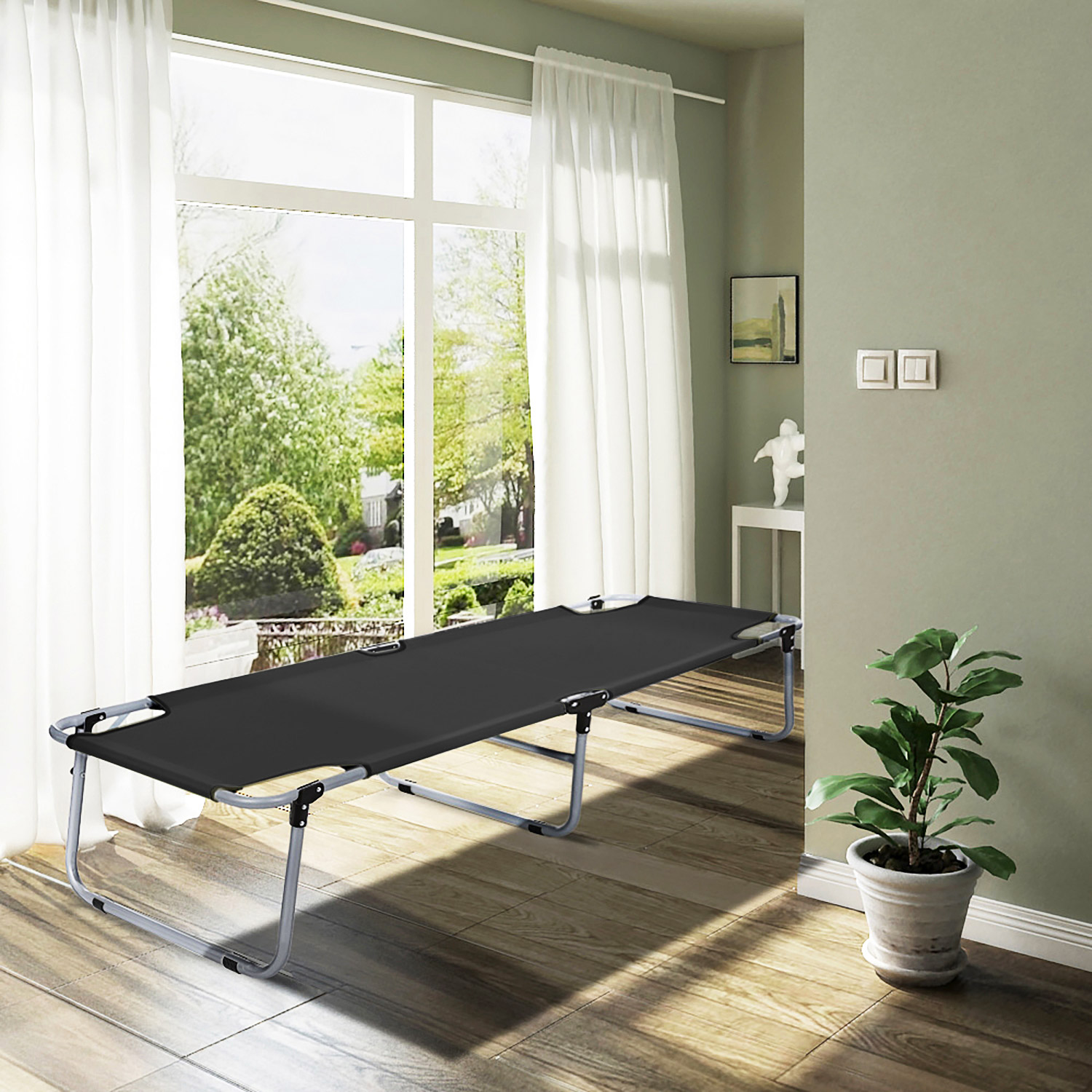 Want to sleep comfortably after hours of hiking? Need an extra bed when your family or friends come to visit? This folding bed is here to help. Made of sturdy iron and durable 600D Oxford fabric, this camp bed is characterized by its high load capacity (up to 260 kg) and long service life. Lie down on this bed with peace of mind and relax your body. Since this camping bed is foldable, you don’t have to worry about transportation. When not in use, simply fold the bed and place it in the trunk of your car. Product details: Color: Black Material: Iron frame, Oxford fabric, PP (polypropylene) Overall size: 190 x 63 x 36 cm (L x W x H) Folded size: 95 x 63 x 11 cm (L x W x H) Weight: 7.4 kg Max. static load capacity: 260 kg Scope of delivery: 1 x camping bed 1 x instructions (DE, EN, FR, ES, IT) SONGMICS notes: The product is more stable when placed against a wall.The product must not come into contact with sharp objects. Please be careful when folding it up to avoid trapping your hands. The lying surface of the product is not removable. Wipe the surface with a damp cloth or use a brush to clean the product. If necessary, you can spread a blanket on the bed to increase comfort.