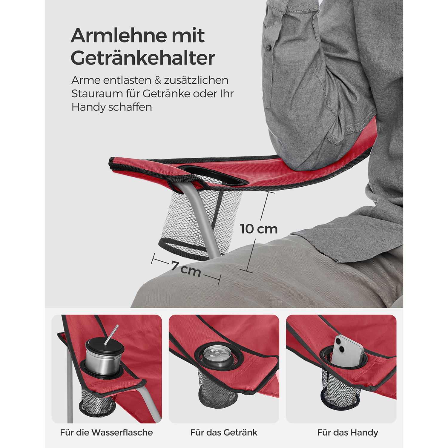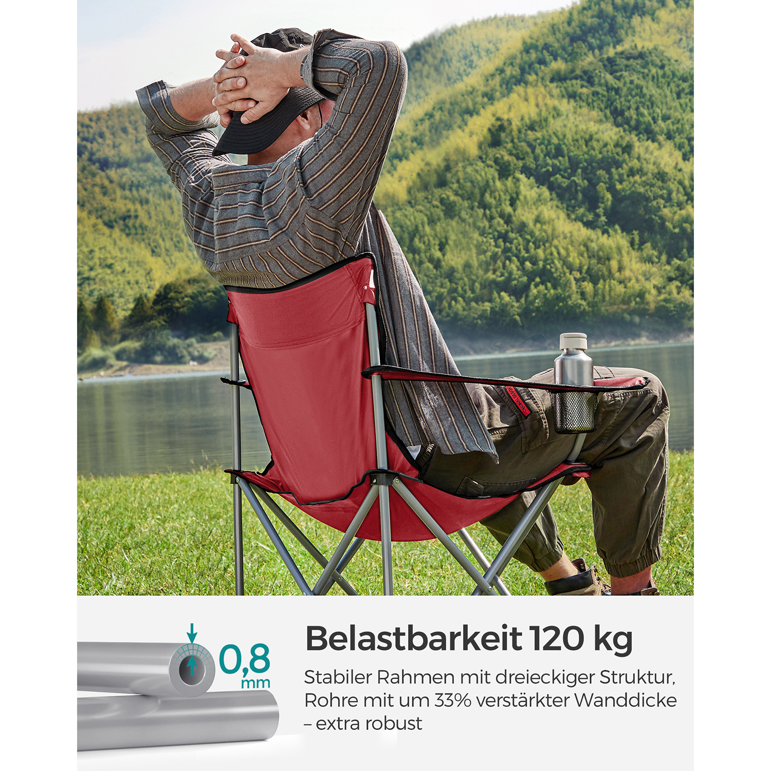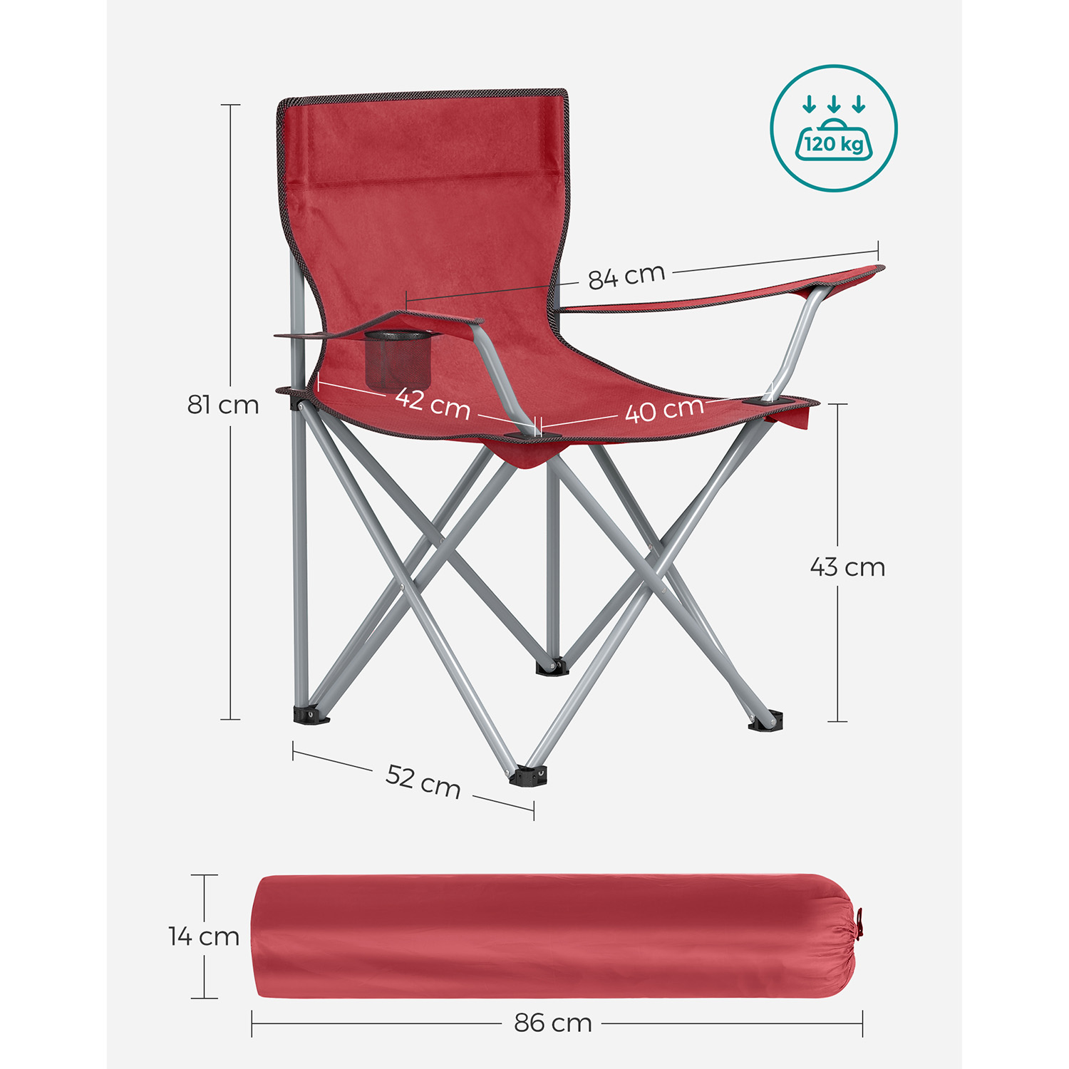 Product details: Color: Red Material: Iron frame, 600D Oxford fabric Overall size: 84 x 52 x 81 cm (L x W x H) Package size: 86 x 25 x 14 cm Weight per chair: 2.5 kg Max. static load capacity per chair: 120 kg Scope of delivery: 2 x camping chair 2 x transport bag SONGMICS notes: The maximum load capacity per camping chair is 120 kg. Please do not exceed this maximum weight. Please unfold the camping chair completely before use. Protect the product from rain; do not expose the camping chair to strong sunlight for long periods of time.