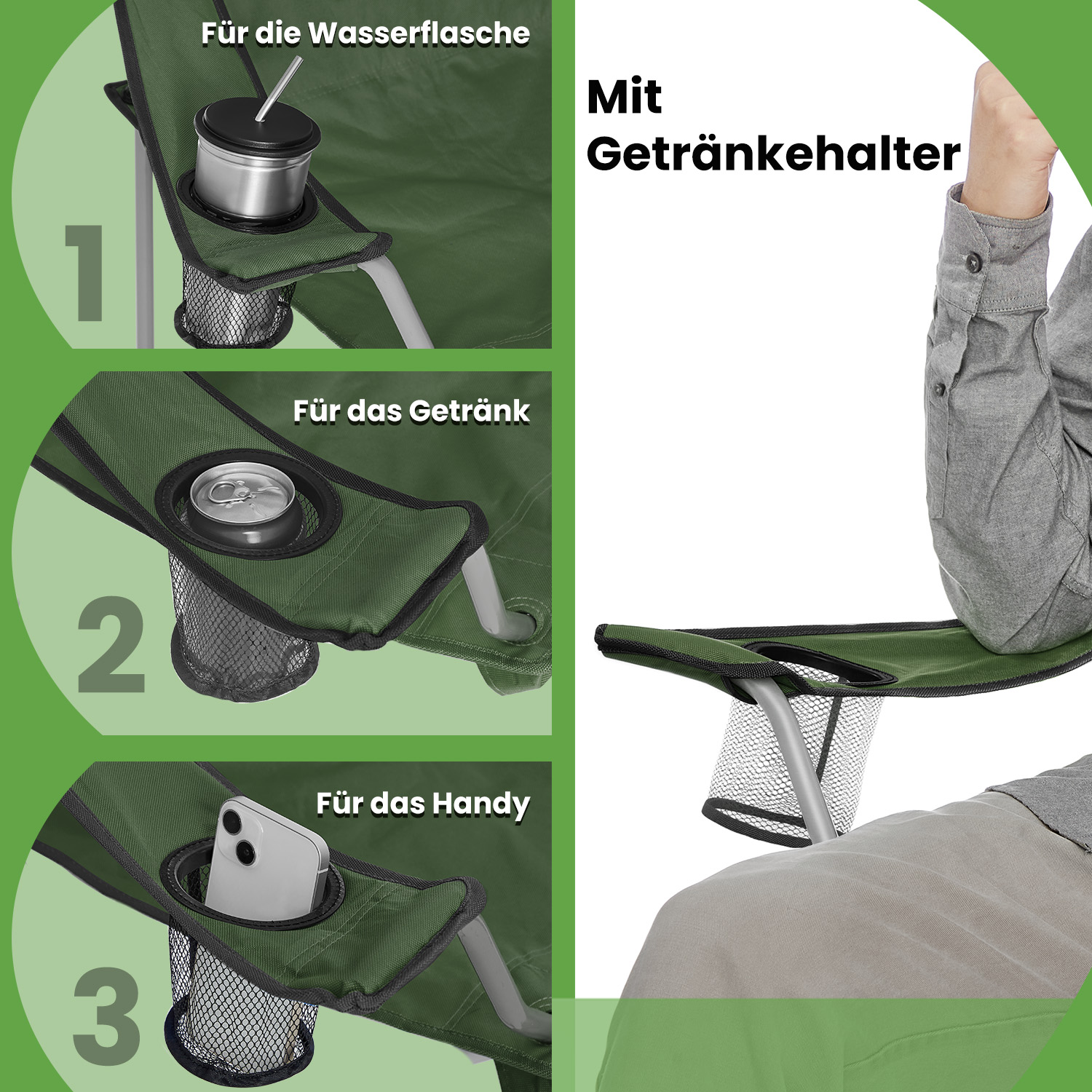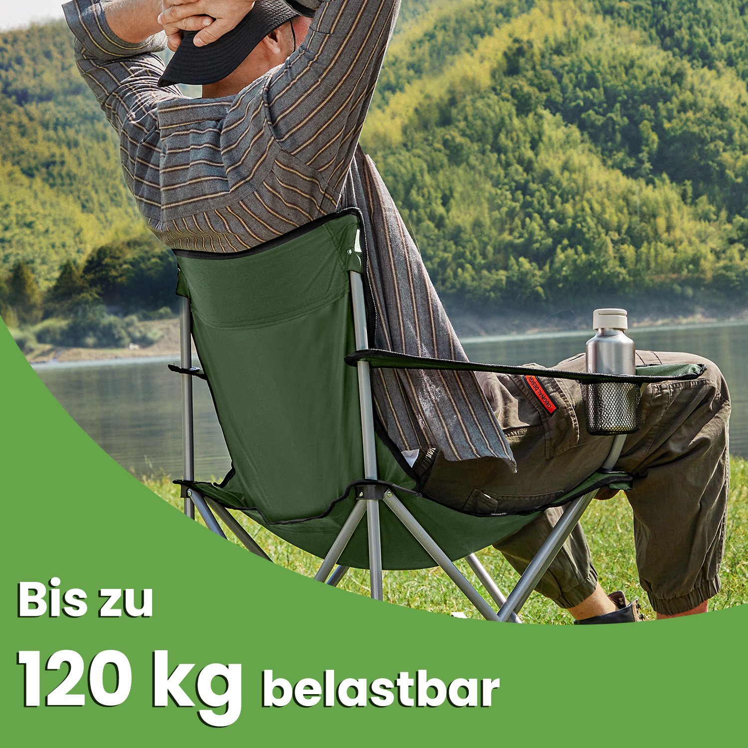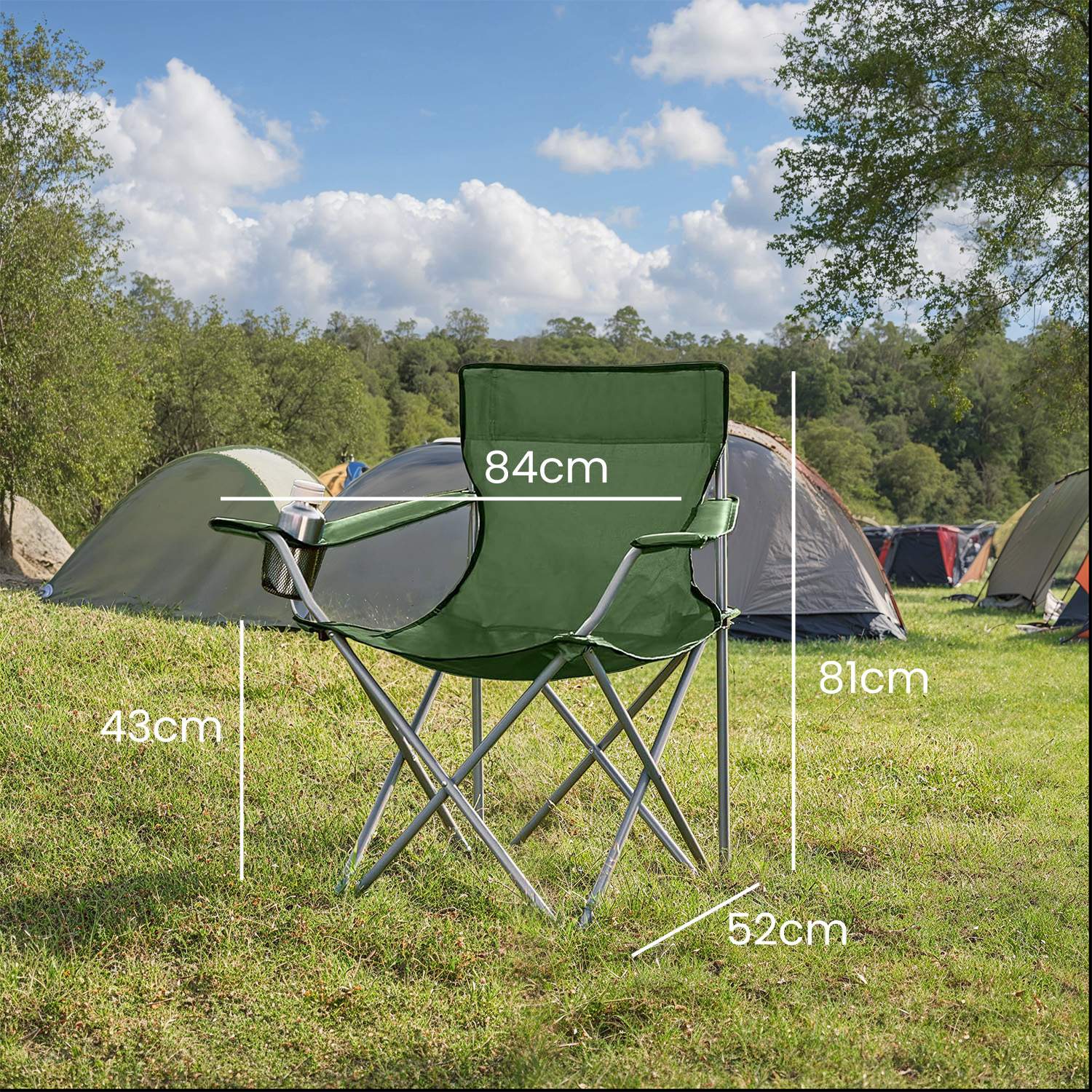 Escape the stresses of working life and immerse yourself in nature. SONGMICS has developed a series of camping chairs to offer you comfort even when outdoors. Sit down on a camping chair and relax your body and soul. Comfort in your hand luggage After a long day full of activities, you and your loved one will surely want to sit down on these outdoor chairs, which have a drink holder and practical armrests, and relax. Are you planning a trip and the destination is far away from the campsite? These chairs weigh only 2.5 kg each. Simply fold them up and take them with you! Wherever you want to go This folding chair set is hard to beat in terms of versatility. It is perfect for camping trips. However, if you are a passionate angler, you can also take it with you to the river or the sea. These folding chairs are also ideal if you want to have a picnic in the park with your family.Product details: Color: Green Material: Metal frame, 600D Oxford fabric Overall size: 84 x 52 x 81 cm (L x W x H) Package size: 86 x 25 x 14 cm Weight per chair: 2.5 kg Max. static load capacity per chair: 120 kgScope of delivery:2 x camping chair2 x transport bagSONGMICS notes:The maximum load capacity per camping chair is 120 kg. Please do not exceed this maximum weight.Please unfold the camping chair completely before use.Protect the product from rain; do not expose the camping chair to strong sunlight for long periods of time.