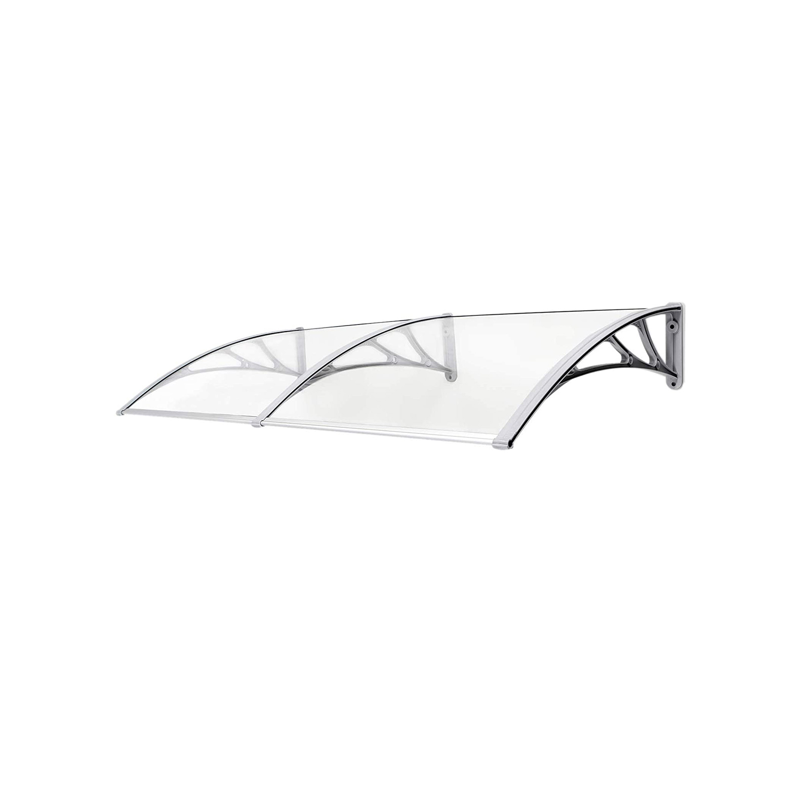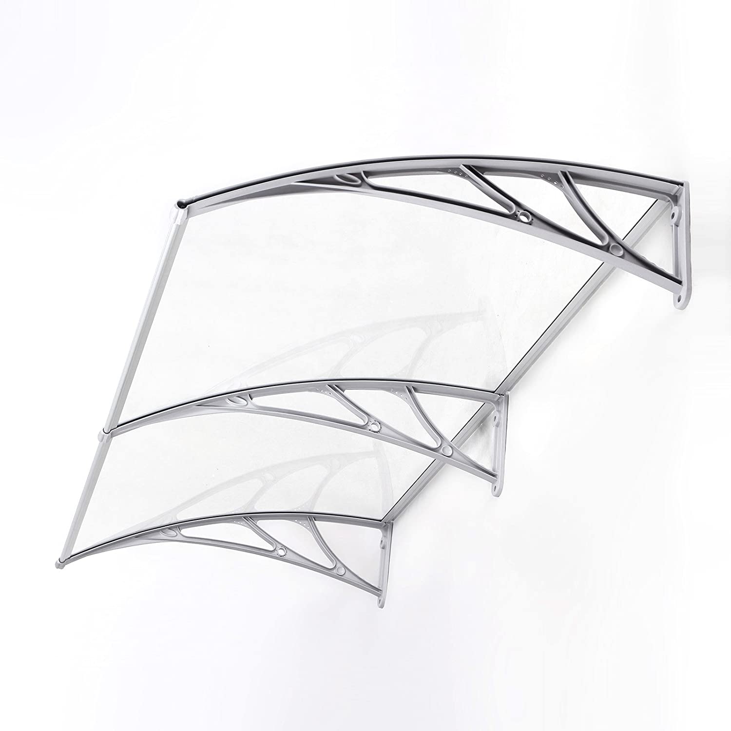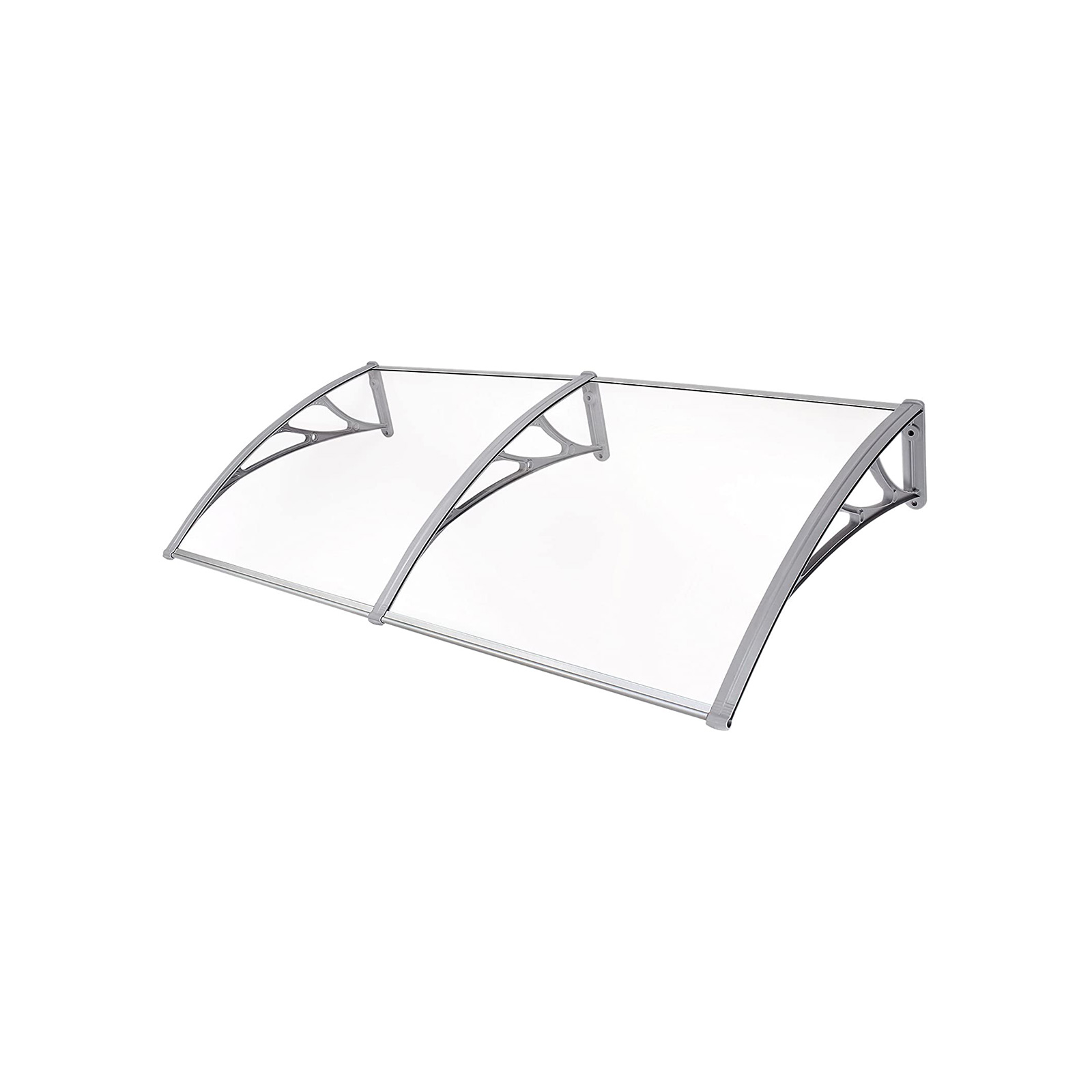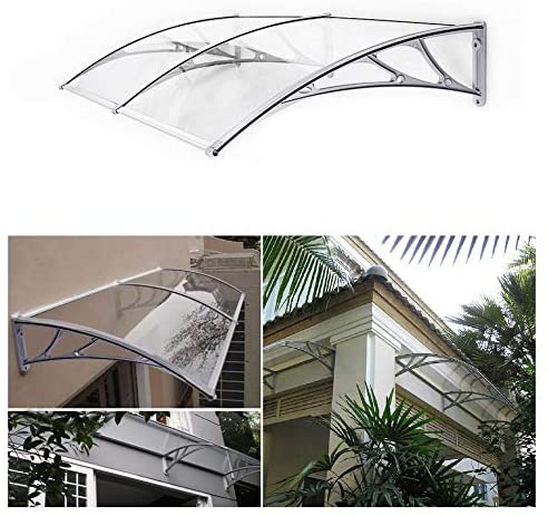 Beat the rain! Shopping bag in one hand, umbrella in the other – how are you supposed to open the front door now? You’ll be well protected under this high-quality polycarbonate canopy, which is installed above your front door. So close your umbrella and enter your home dry and relaxed! Let the light in! Thanks to its curved design, this canopy is also suitable for installation above windows. Snow and rain slide to the ground without accumulating on the roof or window sill. Nevertheless, this canopy does not darken your rooms, as the panes allow plenty of light to pass through. Product details:- Color: Transparent gray- Material: Polycarbonate panes, PPO plastic brackets, aluminum front and rear edges- Product dimensions: 195 x 96 x 33.5 cm (L x W x H)- Thickness of polycarbonate panes: 5 mm- Weight: 6.2 kgScope of delivery:- 1 x canopy (2 polycarbonate panels measuring 98 x 93 cm, 3 wall brackets, and 4 aluminum edges) – 1 x accessory pack – 1 x instructions (DE, EN, FR, IT, ES)