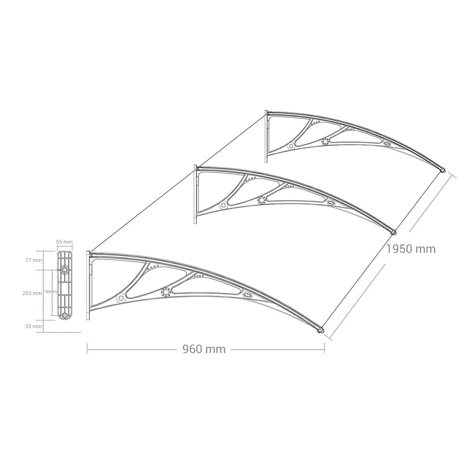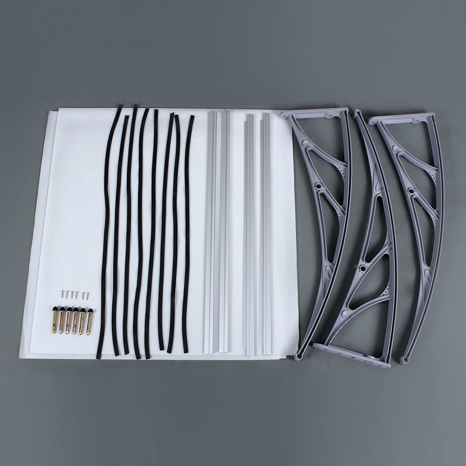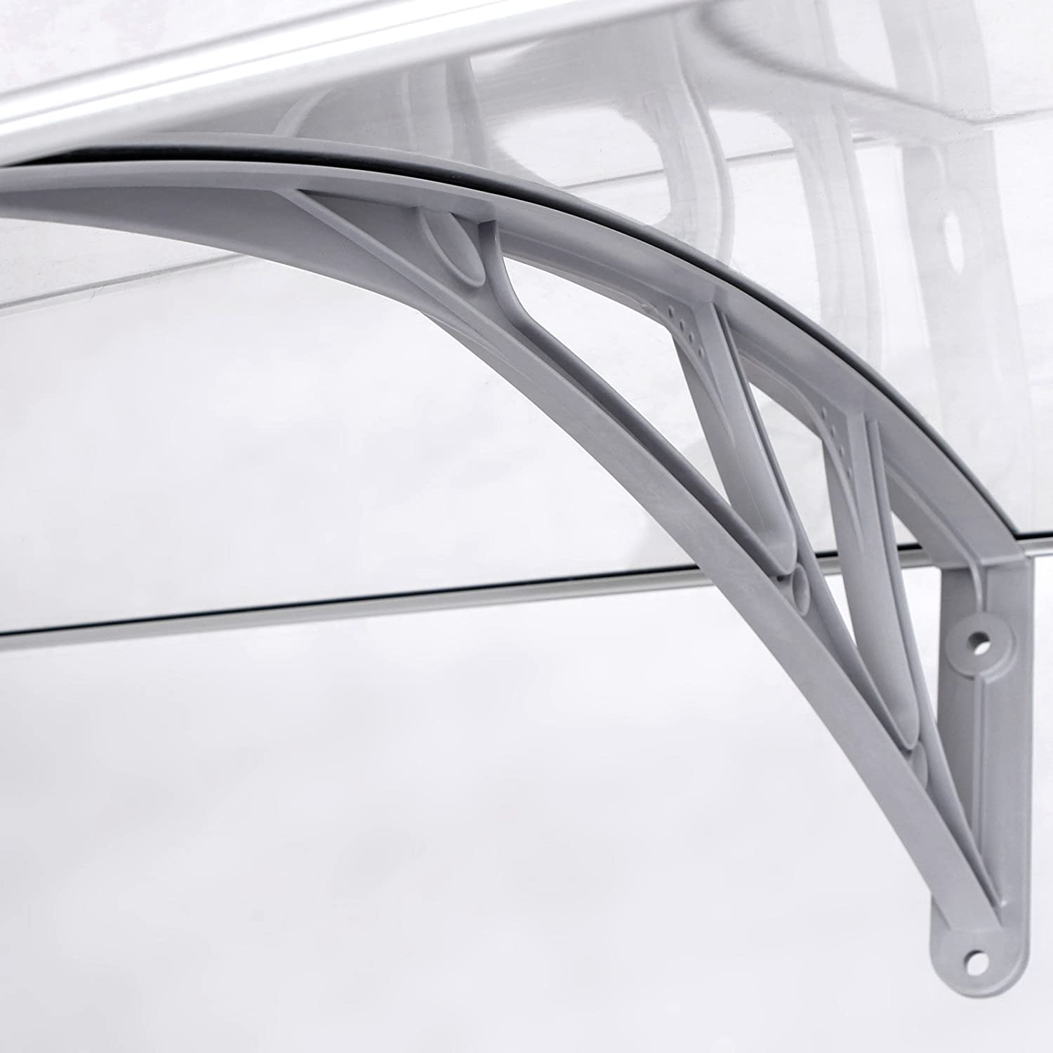 Beat the rain! Shopping bag in one hand, umbrella in the other – how are you supposed to open the front door now? You’ll be well protected under this high-quality polycarbonate canopy, which is installed above your front door. So close your umbrella and enter your home dry and relaxed! Let the light in! Thanks to its curved design, this canopy is also suitable for installation above windows. Snow and rain slide to the ground without accumulating on the roof or window sill. Nevertheless, this canopy does not darken your rooms, as the panes allow plenty of light to pass through. Product details:- Color: Transparent gray- Material: Polycarbonate panes, PPO plastic brackets, aluminum front and rear edges- Product dimensions: 195 x 96 x 33.5 cm (L x W x H)- Thickness of polycarbonate panes: 5 mm- Weight: 6.2 kgScope of delivery:- 1 x canopy (2 polycarbonate panels measuring 98 x 93 cm, 3 wall brackets, and 4 aluminum edges) – 1 x accessory pack – 1 x instructions (DE, EN, FR, IT, ES)
