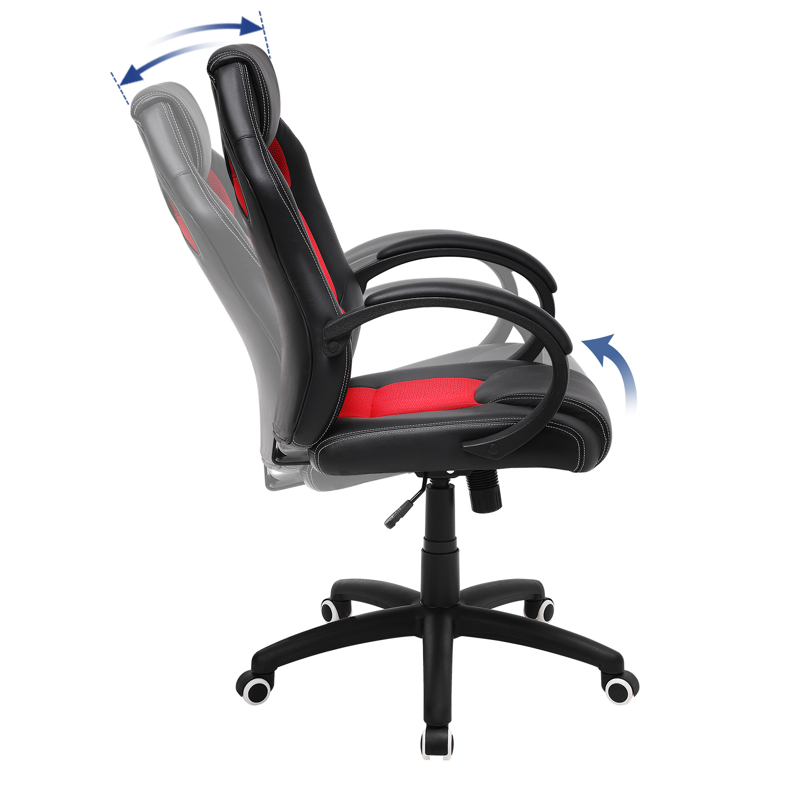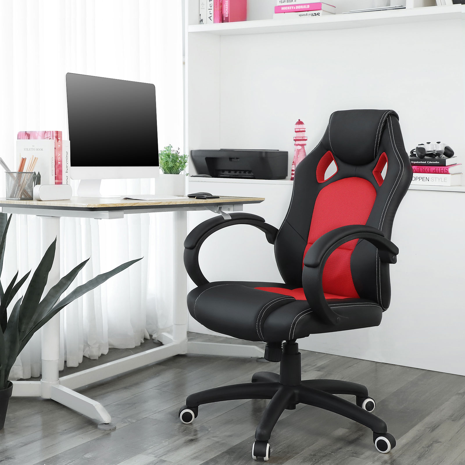 Description: – Songmics is always customer-oriented and is committed to providing high-quality products at a good price/performance ratio. The stylishly designed Songmics office chair combines functionality and comfort with pleasure! – With high-quality materials and improved accessories, the Songmics office chair is truly comfortable, practical, and durable. An absolute eye-catcher in your room! Note: – When assembling the support part, please note that the side marked “Front” should face forward. – Grasp the rear right lever and pull it toward you. You can then adjust the seat height continuously by applying or releasing pressure on the chair while holding the lever until the desired seat height is reached. Pulling the lever outward activates the rocking function. The backrest is then not fixed in place and supports the back in every movement, moving dynamically with it. Press the lever inwards again to deactivate the rocking function. The backrest can then be locked in place again. – When the rocking function is activated, the seat and backrest move together when you lean back. The angle of the backrest cannot be adjusted separately from the seat. Product details: – Total height: approx. 111-121 cm – Backrest height: approx. 73 cm – Seat height: approx. 45-55 cm – Chair width: 66.5 cm – Armrest height: 69-79 cm – Material: PU + foam + steel + nylon – Color: black-red Scope of delivery: – 1 x office chair with footrest – 1 x instructions (German, English, French, Italian, Spanish) – 1 x hardware bag