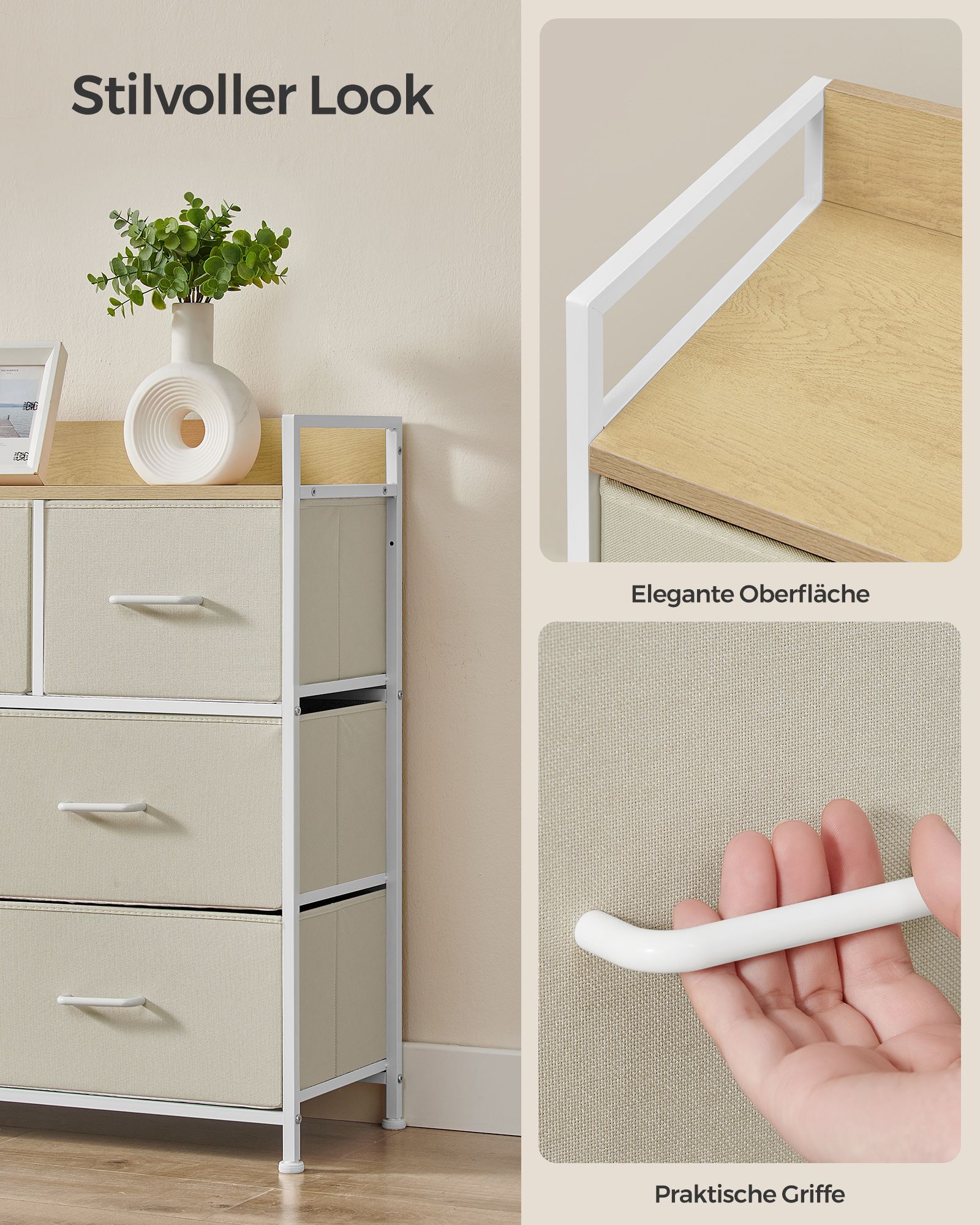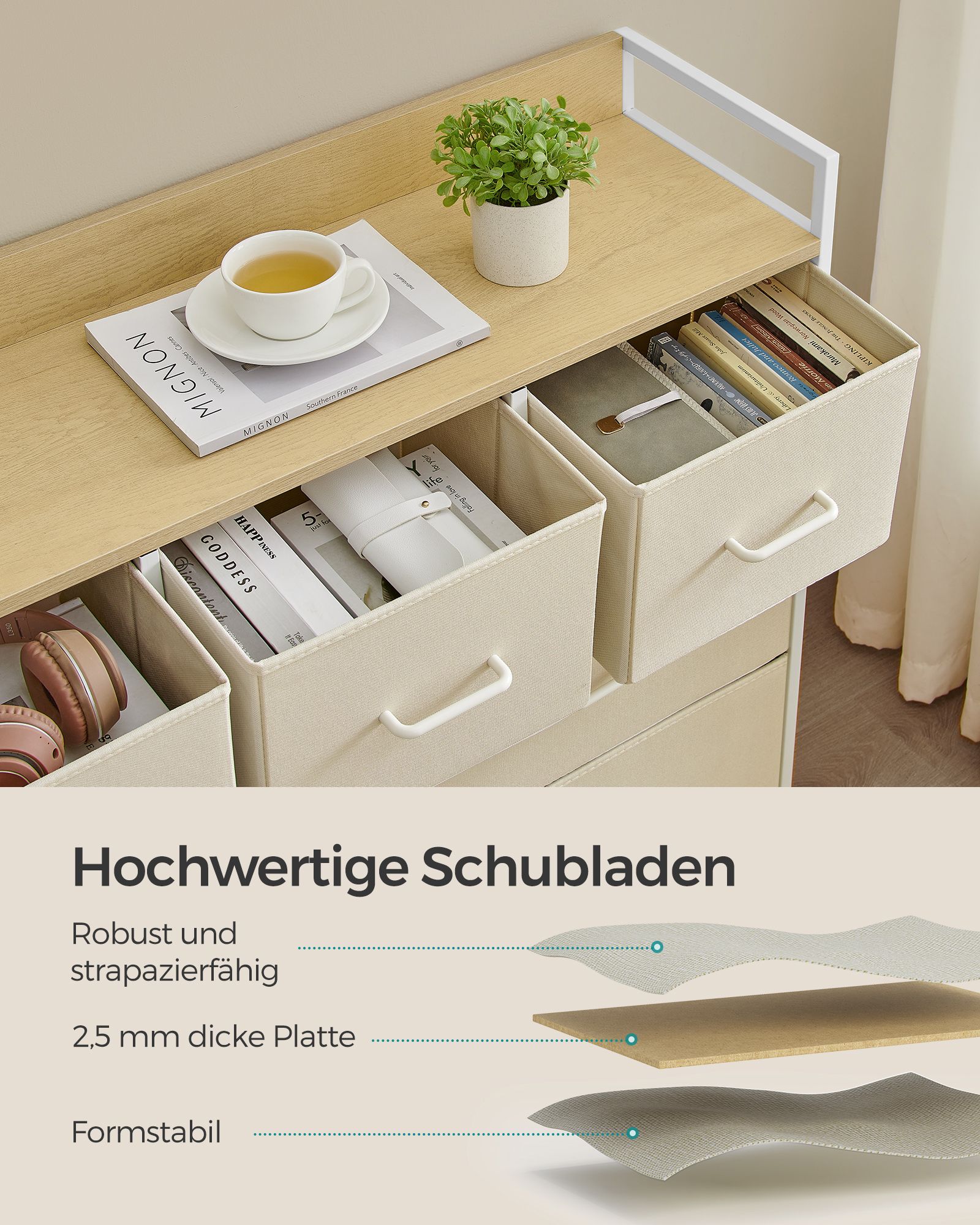 Material: chipboard, steel, fabric drawer fronts
