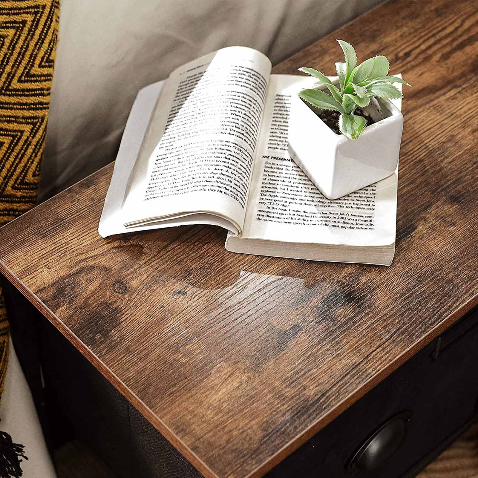 With great attention to detail: Don’t worry if you have children, because the design of this nightstand is child-friendly. The included anti-tip device ensures a safe environment for your family, and the fabric drawers prevent little hands from getting caught when your little ones want to put their clothes away themselves. Easy assembly: Thanks to the simple design and included assembly accessories, you won’t have to spend your entire Sunday afternoon putting it together. Just follow the easy-to-understand instructions and you’ll have this side table assembled in no time. Product details: Color: Vintage brown-black Material: MDF (medium-density fiberboard), metal, front of drawers made of faux suede, bottom made of Oxford fabric, non-woven fabric Size: 80 x 30 x 70 cm (L x W x H) Weight: 8.4 kg Max. static load capacity of the surface: 15 kg Max. static load capacity per drawer: 3 kg Scope of delivery: 1 x chest of drawers 12 x labels 1 x Allen key 1 x accessory pack SONGMICS Notes:Please do not fill the drawers with heavy items. Wipe the product with a damp cloth for daily cleaning. If the product has a “new” smell after unpacking, please place it in a well-ventilated area for a short time.