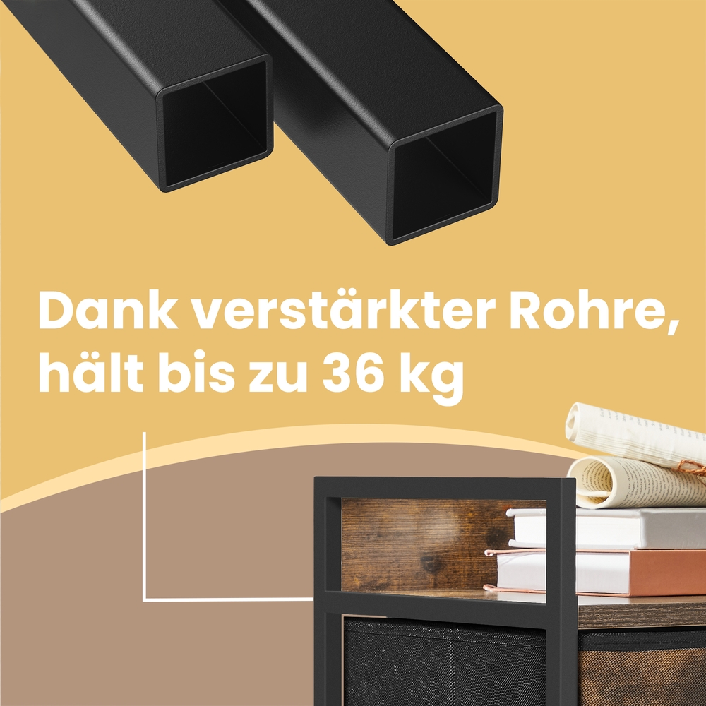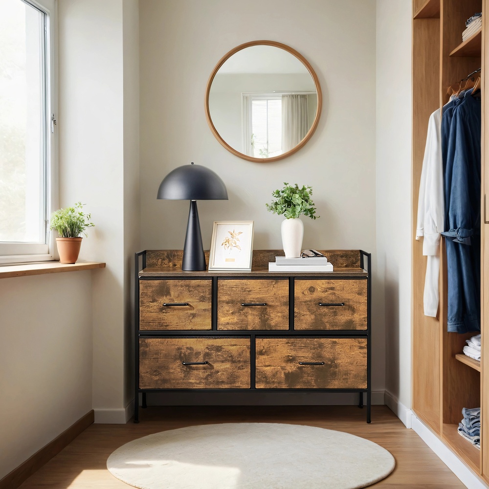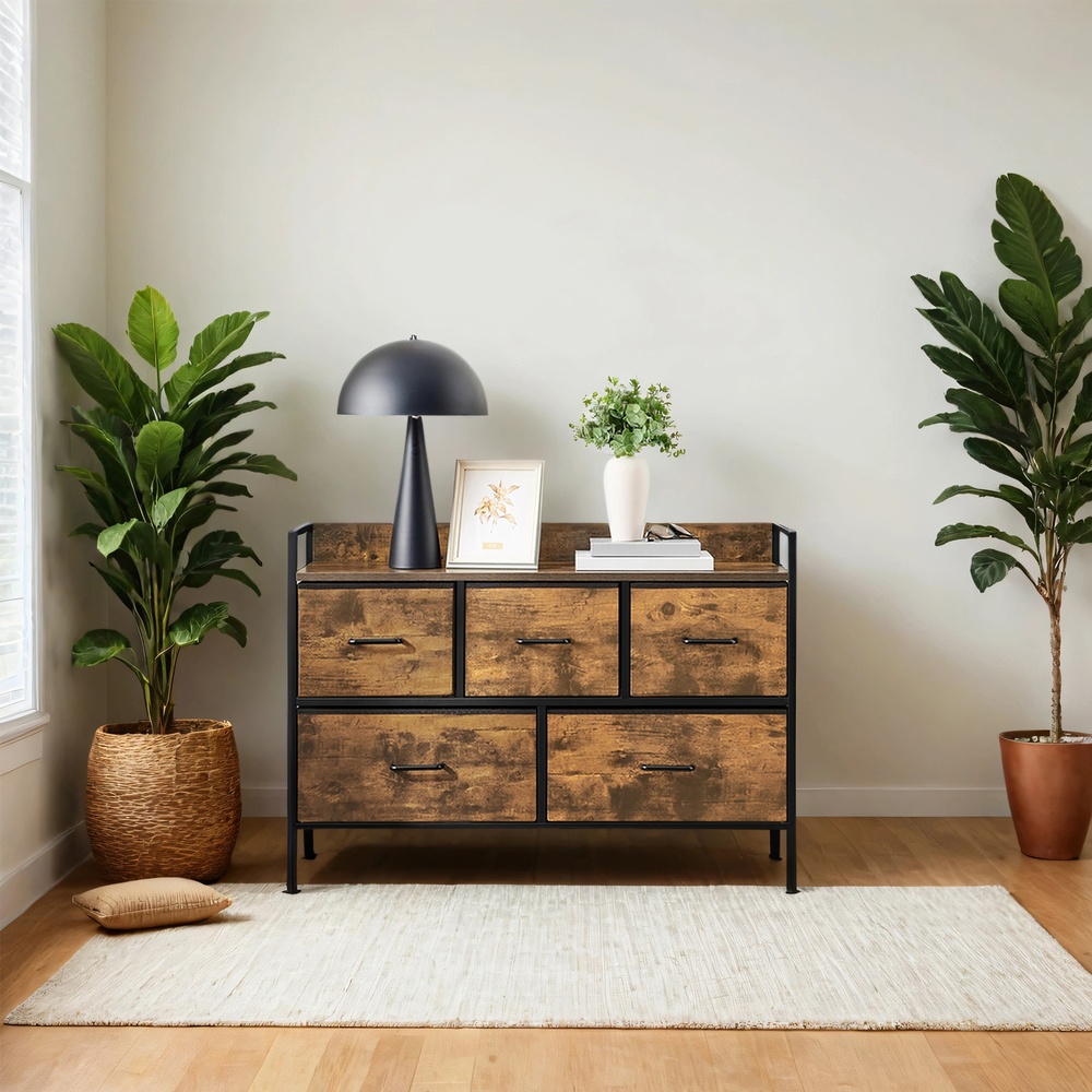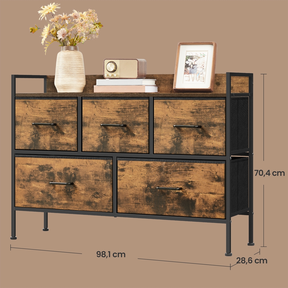 SONGMICS chest of drawers, cabinet, 5 fabric drawers with handles, metal frame, industrial design, vintage brown-ink black LTS135B01
