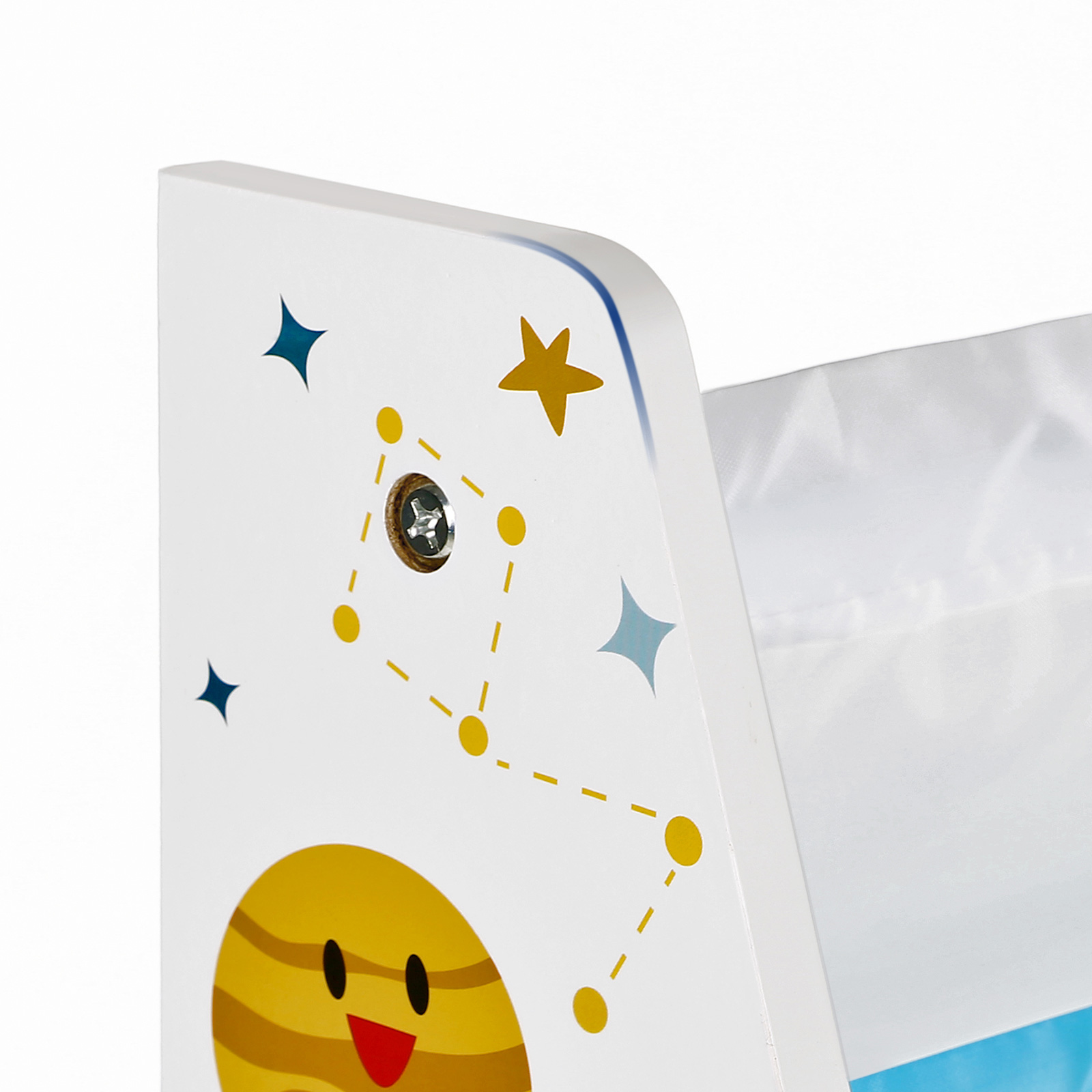 Product details: Color: White shelf; book slots in white, blue, and gray Material: Pressboard, textile composite, colorful paper stickers Size: 62.5 x 28 x 60 cm (L x W x H) Weight: 2.5 kg Scope of delivery: 2 x shelf board 1 x fabric panel 6 x rod 1 x container with accessories 1 x instructions (DE, EN, FR, ES, IT) SONGMICS Notes:Please clean the product with a damp cloth and then leave it to air dry. The fabric panel can be washed under water.
