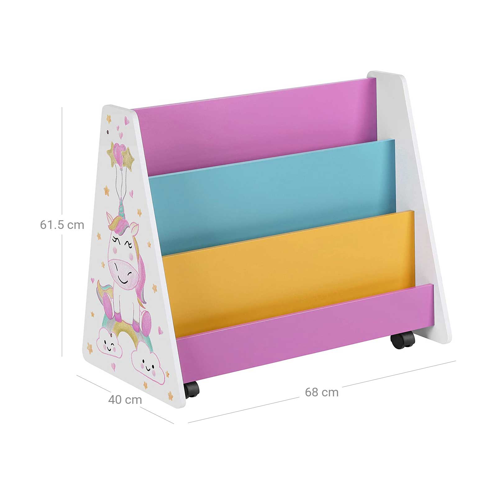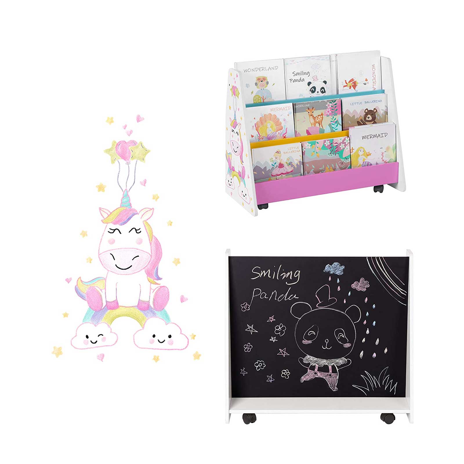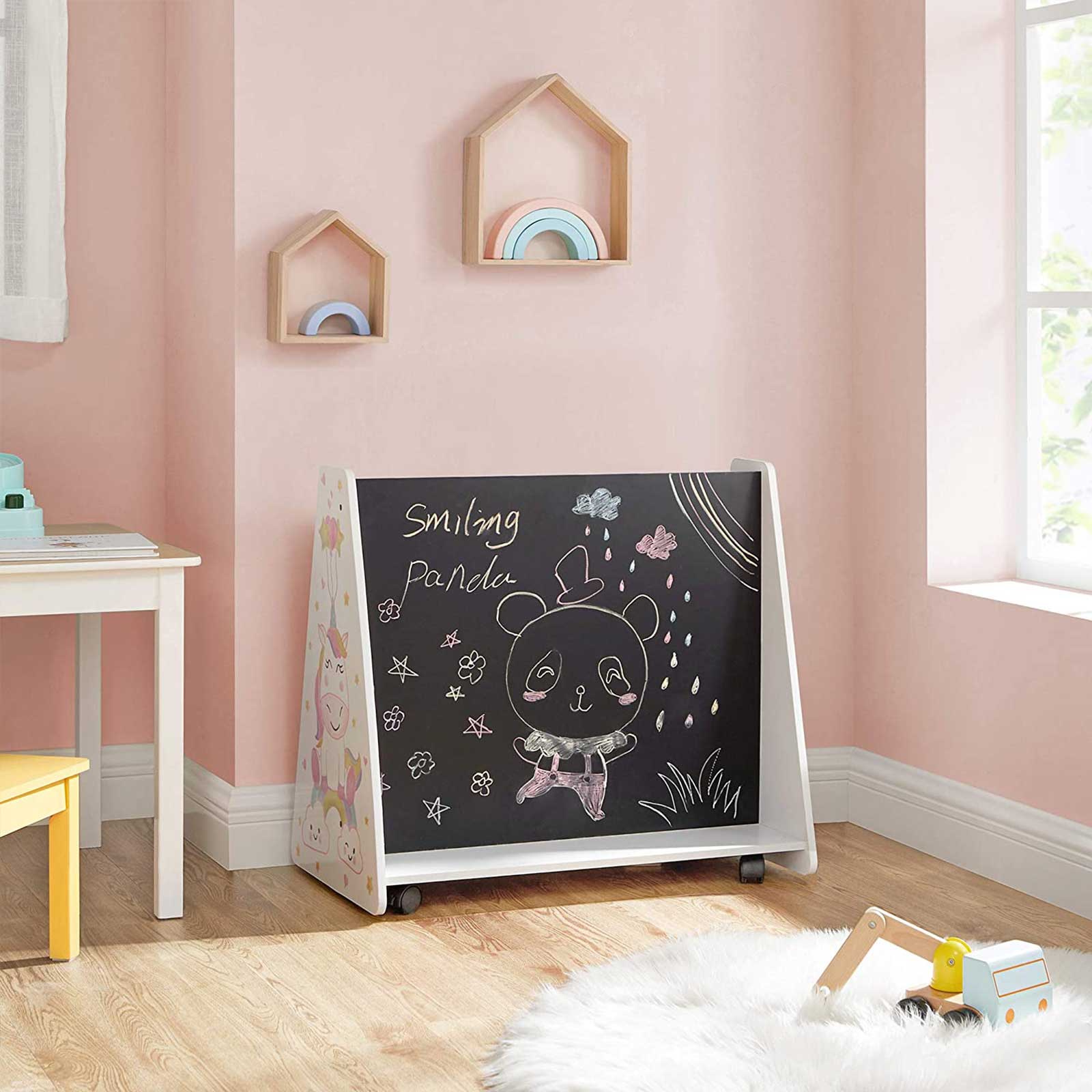 Reading, painting, and dreaming A bookshelf with a blackboard on the back – a combination that unleashes your children’s hidden potential! They can immerse themselves in the worlds of picture books for hours. And when they’ve read everything, they can retell or continue their favorite story with chalk in hand. If you have several children in the house, everyone will find something to do here. Always enough attention for the childrenColorful dividers, unicorn decorations, practical casters, and rounded corners… With these child-friendly elements, this SONGMICS bookshelf creates a relaxed and cozy atmosphere for reading and painting. Product details:- Color: white, blue, pink, yellow, and black- Material: MDF (medium-density fiberboard), chipboard- Size: 68 x 40 x 61.5 cm (L x W x H)- Weight: 12.2 kgScope of delivery:- 1 x bookshelf- 1 x accessory pack- 1 x instructions (DE, EN, FR, ES, IT)SONGMICS notes:- The product is not washable – clean it with a damp cloth and place it in a dry environment. – If the product has a “new” smell after unpacking, please place it in a well-ventilated area for a short time.