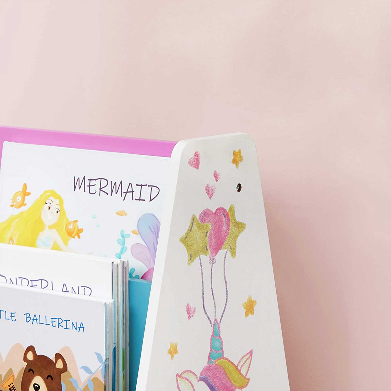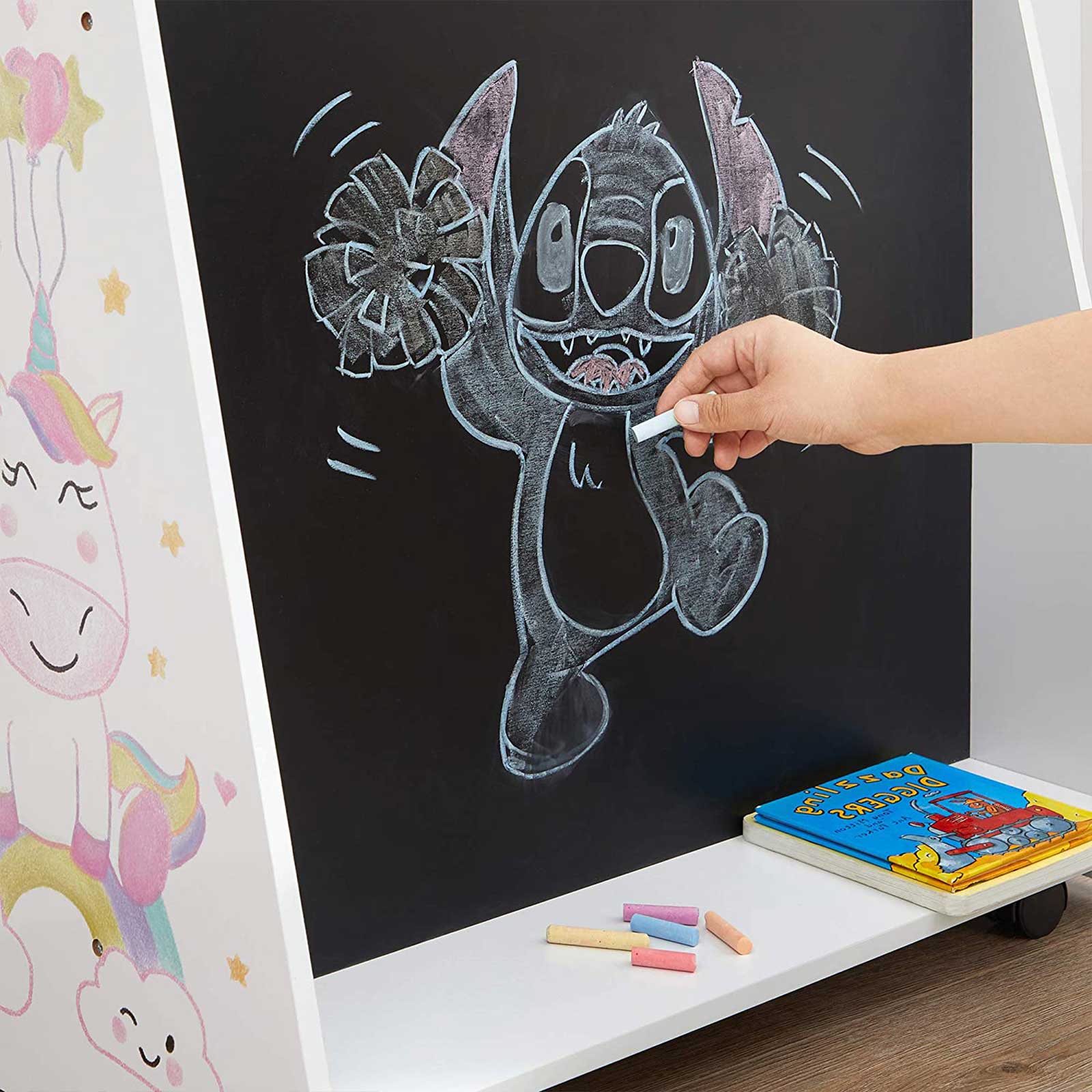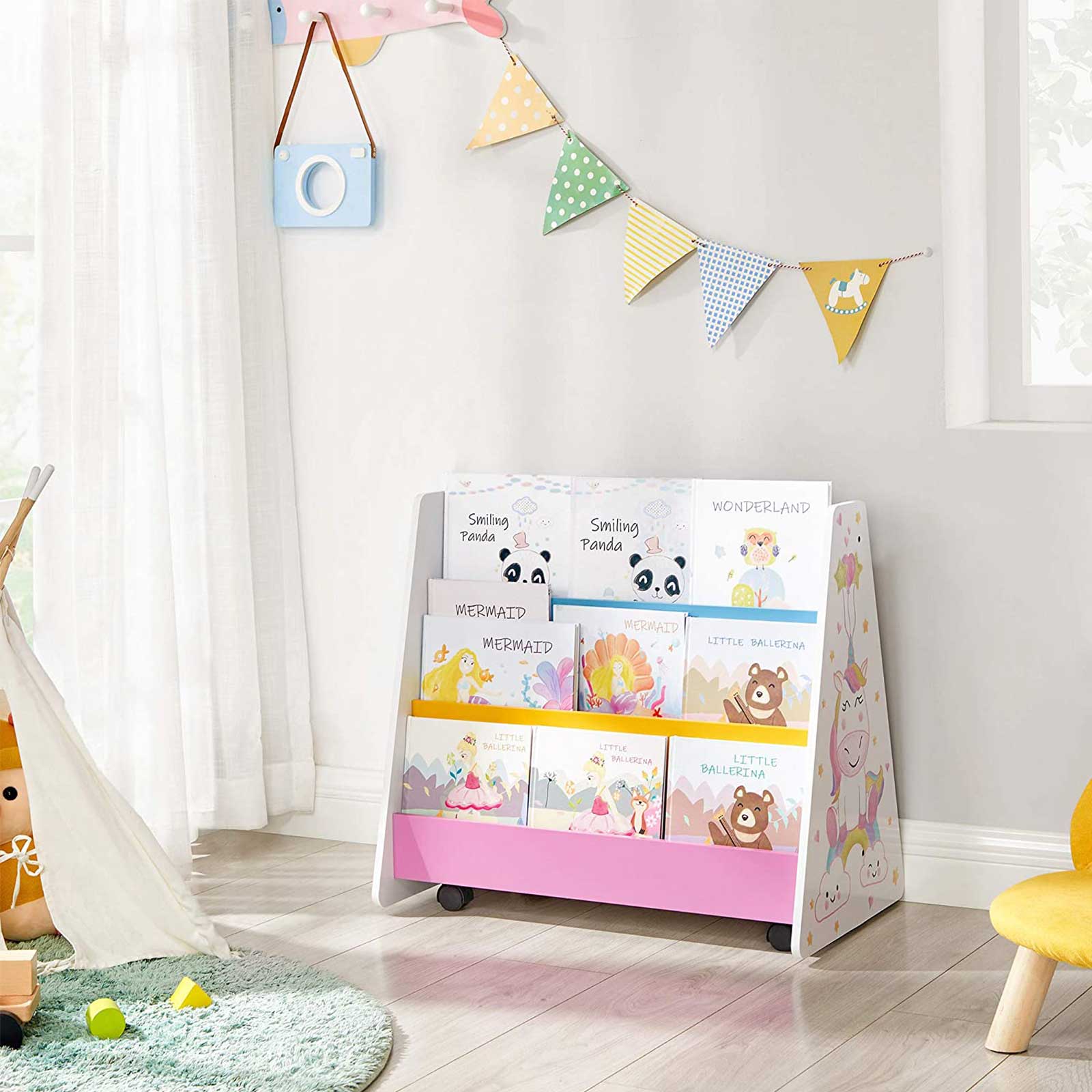Reading, painting, and dreaming A bookshelf with a blackboard on the back – a combination that unleashes your children’s hidden potential! They can immerse themselves in the worlds of picture books for hours. And when they’ve read everything, they can retell or continue their favorite story with chalk in hand. If you have several children in the house, everyone will find something to do here. Always enough attention for the childrenColorful dividers, unicorn decorations, practical casters, and rounded corners… With these child-friendly elements, this SONGMICS bookshelf creates a relaxed and cozy atmosphere for reading and painting. Product details:- Color: white, blue, pink, yellow, and black- Material: MDF (medium-density fiberboard), chipboard- Size: 68 x 40 x 61.5 cm (L x W x H)- Weight: 12.2 kgScope of delivery:- 1 x bookshelf- 1 x accessory pack- 1 x instructions (DE, EN, FR, ES, IT)SONGMICS notes:- The product is not washable – clean it with a damp cloth and place it in a dry environment. – If the product has a “new” smell after unpacking, please place it in a well-ventilated area for a short time.