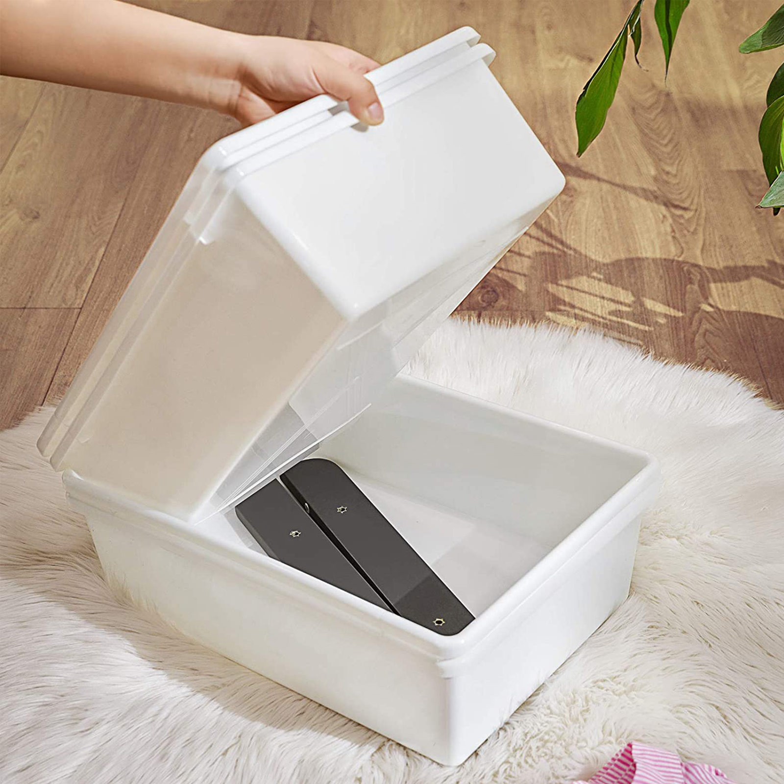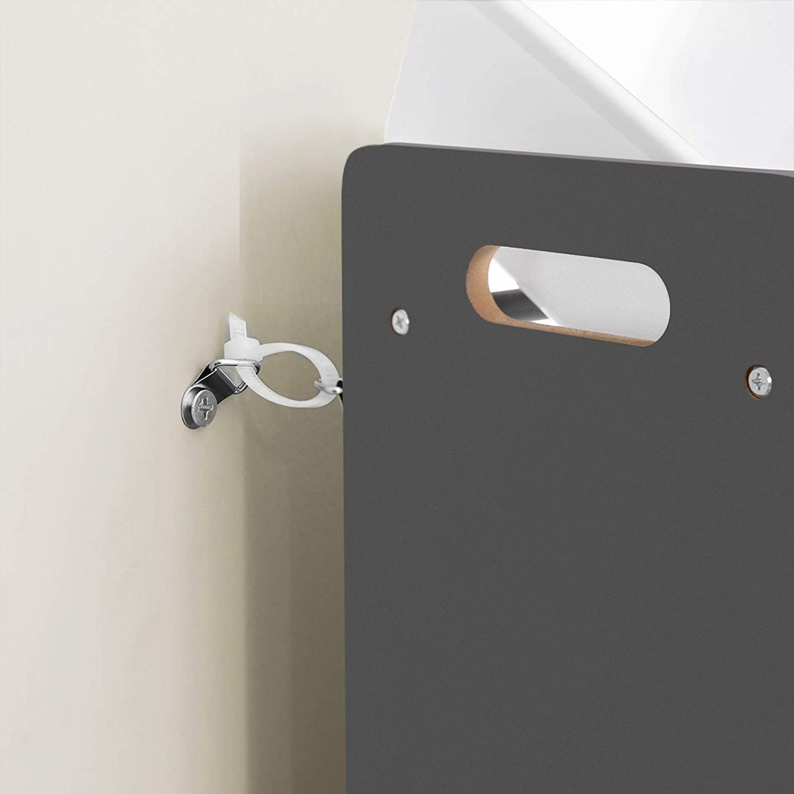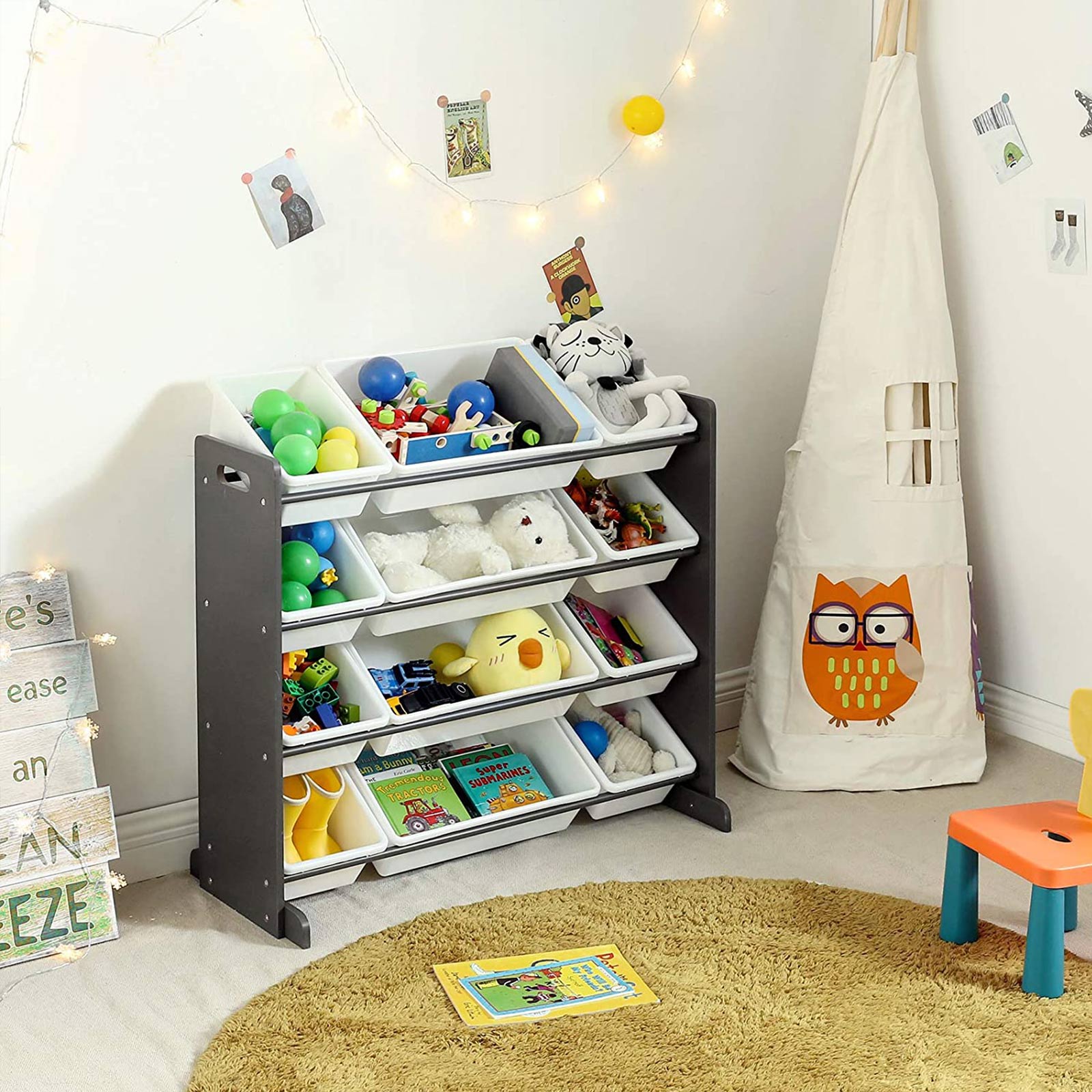 Product details: Color: Dark gray-white Material: MDF (medium-density fiberboard), PP plastic Size: 86 x 26.5 x 78 cm (L x W x H) Weight: 8 kg Scope of delivery: 1 x shelf 12 x storage box 1 x anti-tip device 1 x instructions (DE, EN, FR, ES, IT) SONGMICS Notes: Please only clean the plastic boxes under running water. Clean the rest of the product with a damp cloth and then place it in a dry environment. Note: Part B is attached to plastic box E.