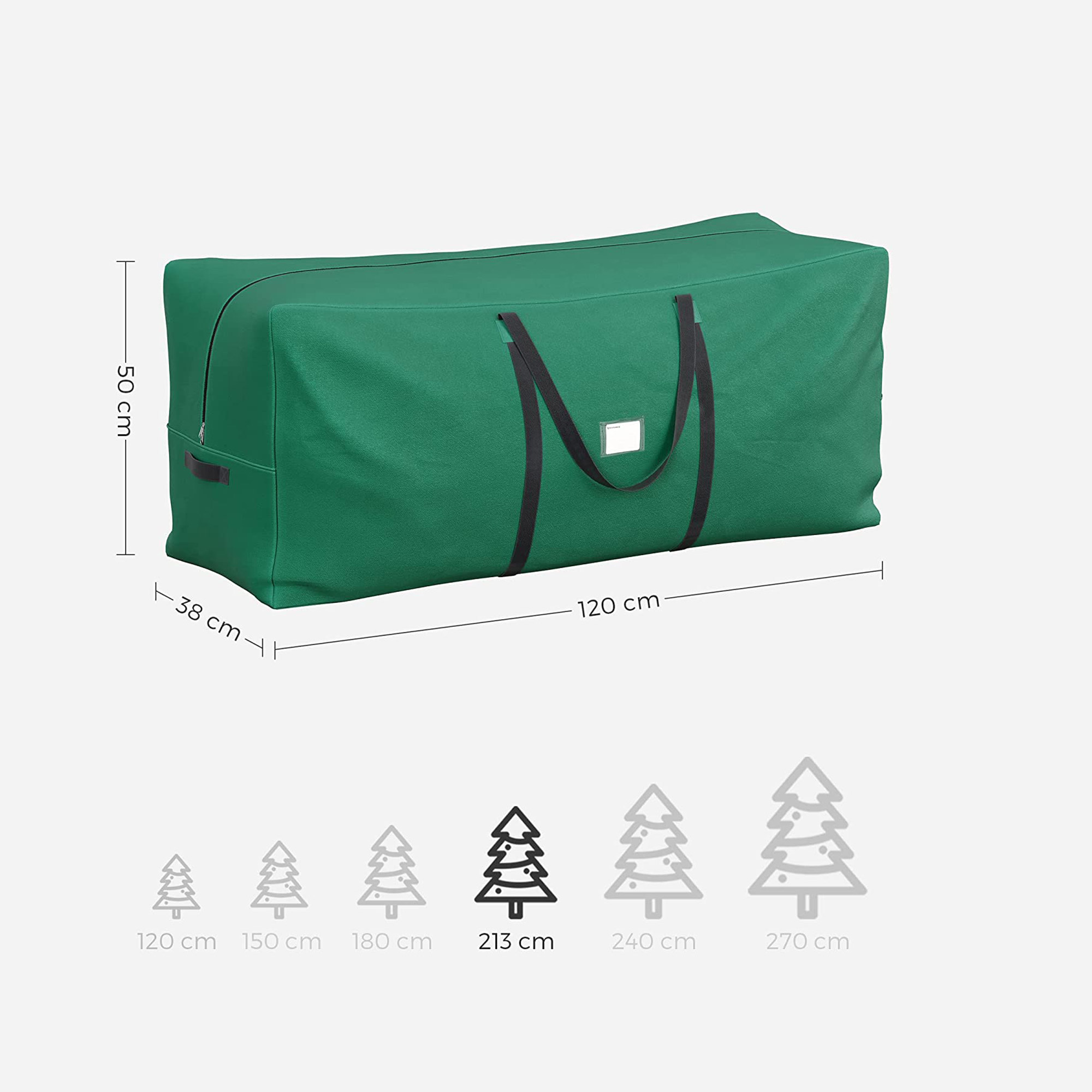 A bag for your Christmas tree: Even though your artificial Christmas tree spends 330 days of the year in the basement, it will always be there for you. So keep it safe and let it know that it is important to you, both at Christmas and throughout the rest of the year. Made from 600D Oxford fabric, this bag from SONGMICS is sturdy, durable, moisture-resistant, and easy to clean. When you take your tree out of the bag next year, it will still look like you just bought it. Where to put this storage bag? In the garage, under the bed, or on top of the wardrobe… The compact bag helps you save space in your home. It also features a high-quality zipper that protects your belongings from dust. What’s more, the two reinforced large handles and two smaller handles make it easy to transport anywhere. Product details:- Color: Green – Material: 600D Oxford fabric – Size: 120 x 38 x 50 cm (L x W x H) – Wide handle: 3.5 cm – For trees with a height of up to: 210 cm – Weight: 1 kg Scope of delivery: – 1 x storage bag SONGMICs notes:- Do not store heavy or sharp objects in the product. – The product may have a slight odor when unpacked. In this case, please place it in a well-ventilated area. The odor will disappear after a short time. – The product can be cleaned directly with water.