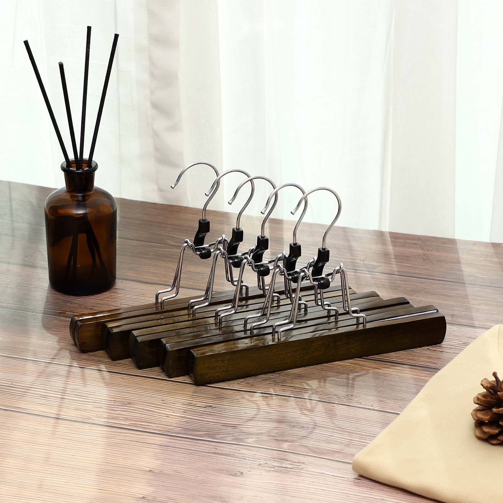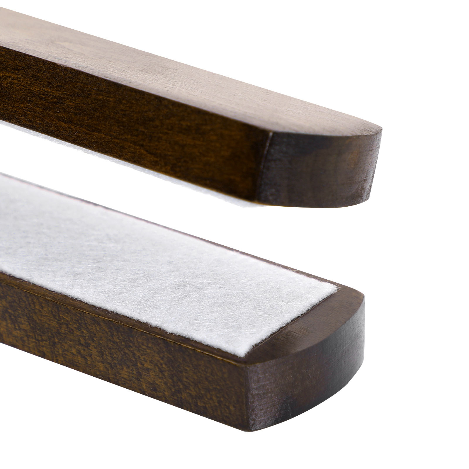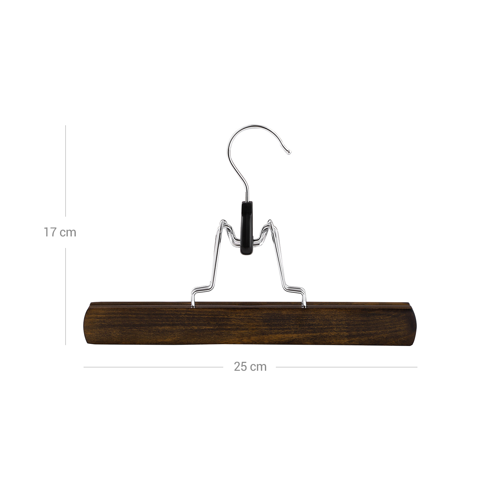 Wide clamping jaws with felt Thanks to this clever design, you can hang your pants and skirts without them slipping and without leaving annoying marks on them. 360° rotatable hook This chrome-plated hook is sturdy, shiny, and rotates 360°. The metal construction ensures stability and long-lasting beauty. Hang these hangers in your wardrobe, on the towel rack or clothes rack to keep your room tidy. Natural wood Made from natural solid wood, these trouser hangers are sturdy, durable and long-lasting. They are also strong enough to hang heavy jeans or other heavy garments. Product details: – Color: Dark walnut – Material: Solid wood (Schima Superba), felt, ABS plastic, chrome-plated hook – Size per hanger: 25 x 2.2 x 17 cm (L x W x H) – Weight: 1.5 kg – Max. static load capacity per hanger: 3 kg Scope of delivery: – 12 x SONGMICS skirt hangers Notes: – Please do not use the hangers for long periods of time in environments with high temperatures or high humidity to avoid damage such as paint peeling. – Please do not hang wet clothes on the hangers. – Please wipe the hangers with a damp cloth to clean them.
