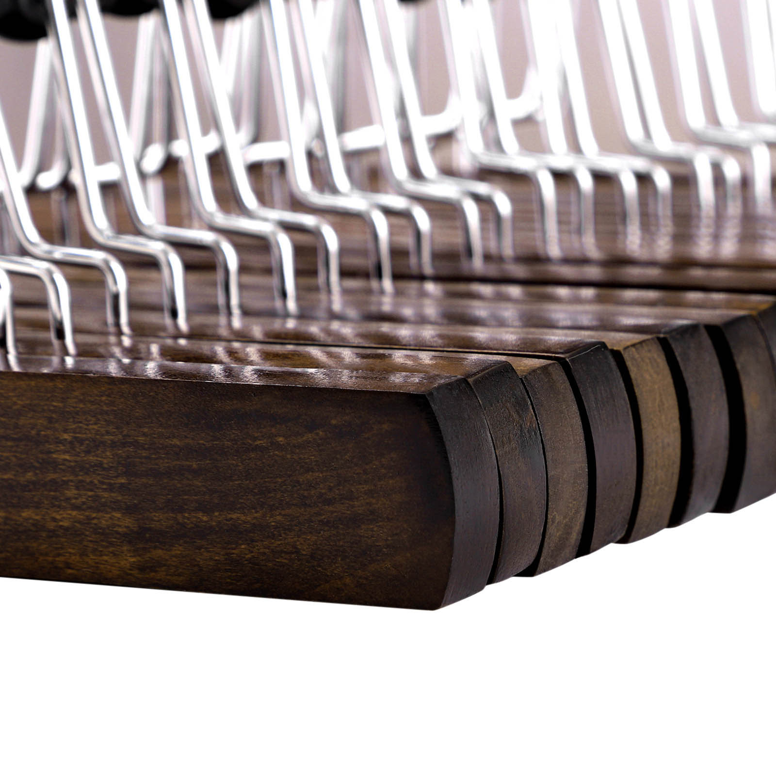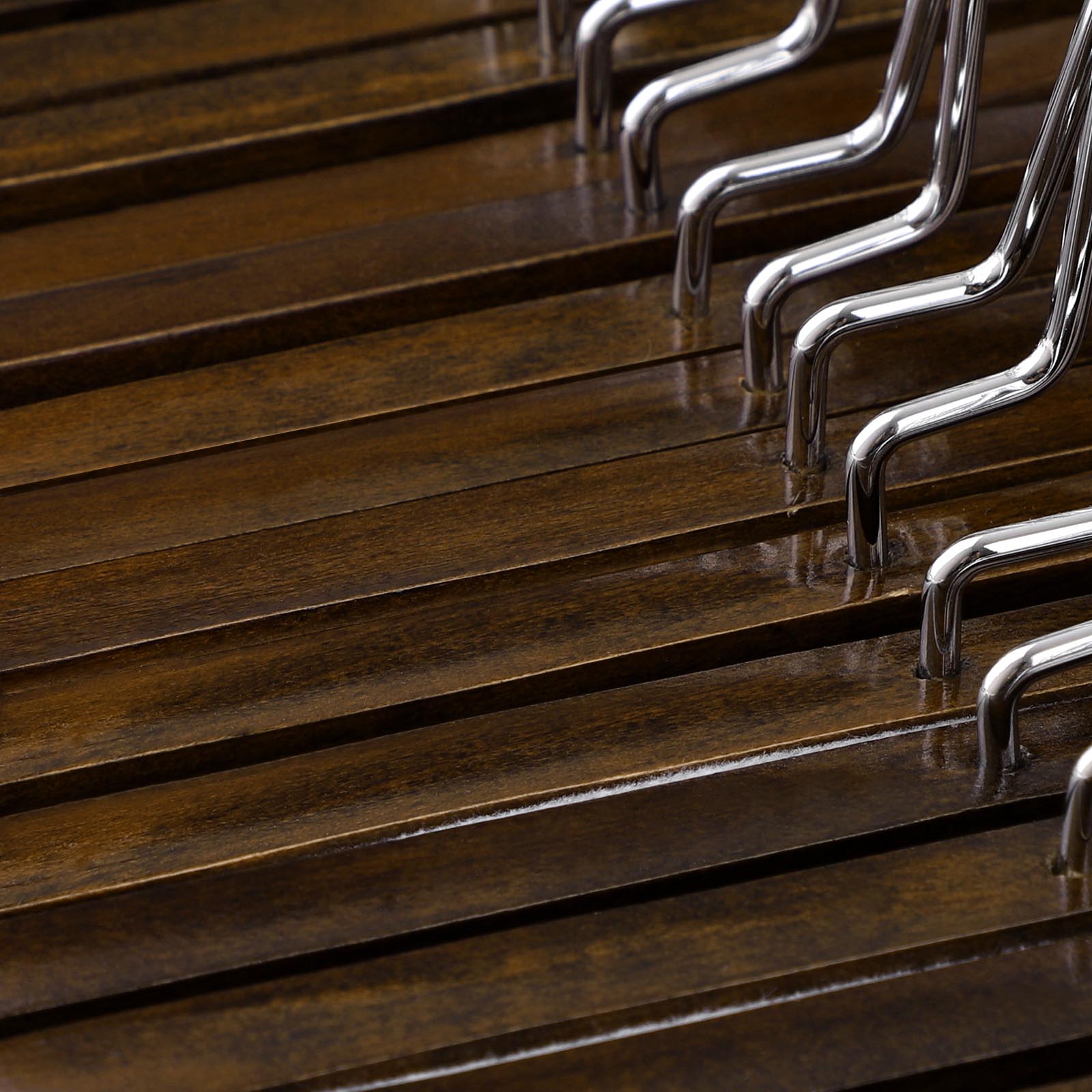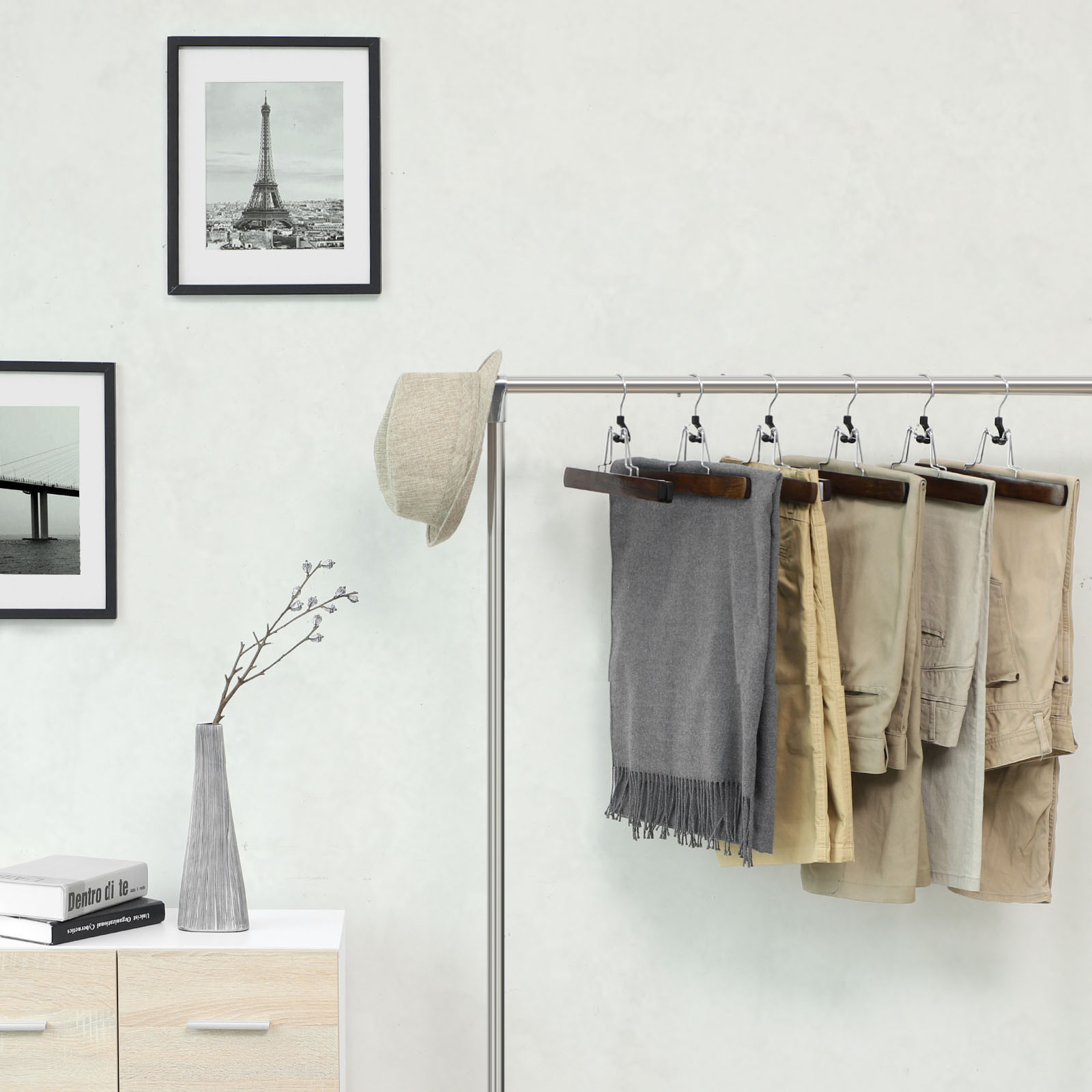 Wide clamping jaws with felt Thanks to this clever design, you can hang your pants and skirts without them slipping and without leaving annoying marks on them. 360° rotatable hook This chrome-plated hook is sturdy, shiny, and rotates 360°. The metal construction ensures stability and long-lasting beauty. Hang these hangers in your wardrobe, on the towel rack or clothes rack to keep your room tidy. Natural wood Made from natural solid wood, these trouser hangers are sturdy, durable and long-lasting. They are also strong enough to hang heavy jeans or other heavy garments. Product details: – Color: Dark walnut – Material: Solid wood (Schima Superba), felt, ABS plastic, chrome-plated hook – Size per hanger: 25 x 2.2 x 17 cm (L x W x H) – Weight: 1.5 kg – Max. static load capacity per hanger: 3 kg Scope of delivery: – 12 x SONGMICS skirt hangers Notes: – Please do not use the hangers for long periods of time in environments with high temperatures or high humidity to avoid damage such as paint peeling. – Please do not hang wet clothes on the hangers. – Please wipe the hangers with a damp cloth to clean them.