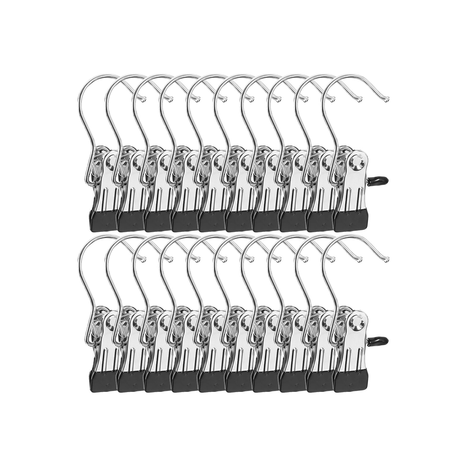 SONGMICS chrome-plated metal clip hooks – practical and robust, making your everyday life easier. Keep your socks, hats, underwear, ties, gloves, boots, towels, etc. tidy. Not only clothes, skirts, blouses, shirts, jackets, and suits can be hung up. The SONGMICS clamp hooks also provide a place for small everyday items such as scarves, socks, and the like, whether for storage or drying laundry, safely and neatly! You can also use these clamps to hang up boots to free up floor space. Everything hangs neatly in a row and the boot shafts are no longer creased. The clips are rubberized and will not damage the leather. And thanks to their compact design, they fit in any hallway/doorway or closet! The Songmics hanger with clip is sure to be your family’s “efficient assistant.”Product details: Material: chrome-plated metal with PVC coating Color: silver Dimensions: 10.5 x 4.5 cm (H x W) Gross weight: 0.445 kg Scope of delivery: 20 x clip hooks Note: Please avoid placing the clip hooks in rooms with high humidity and temperature. To clean, simply wipe the surface with a slightly damp cloth.