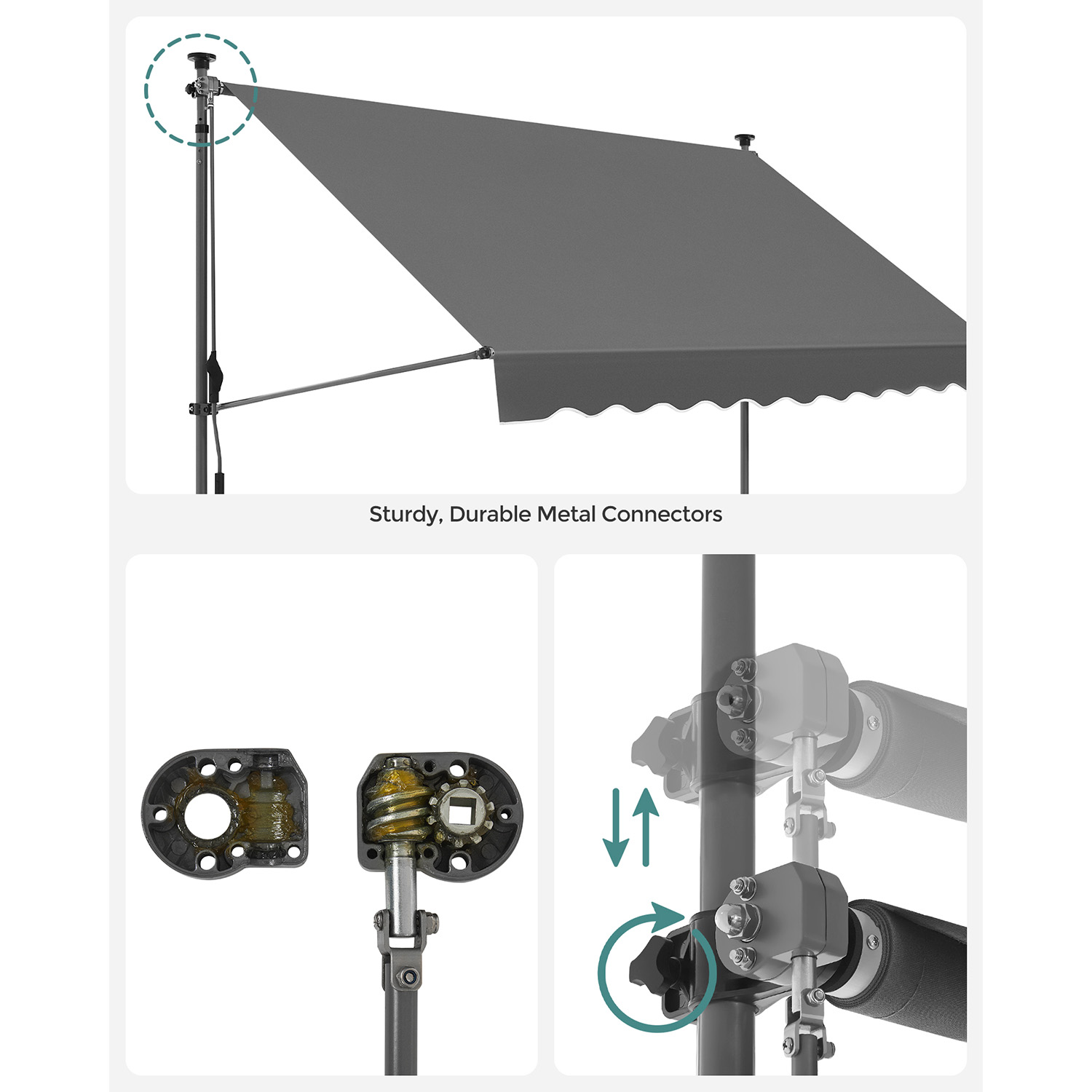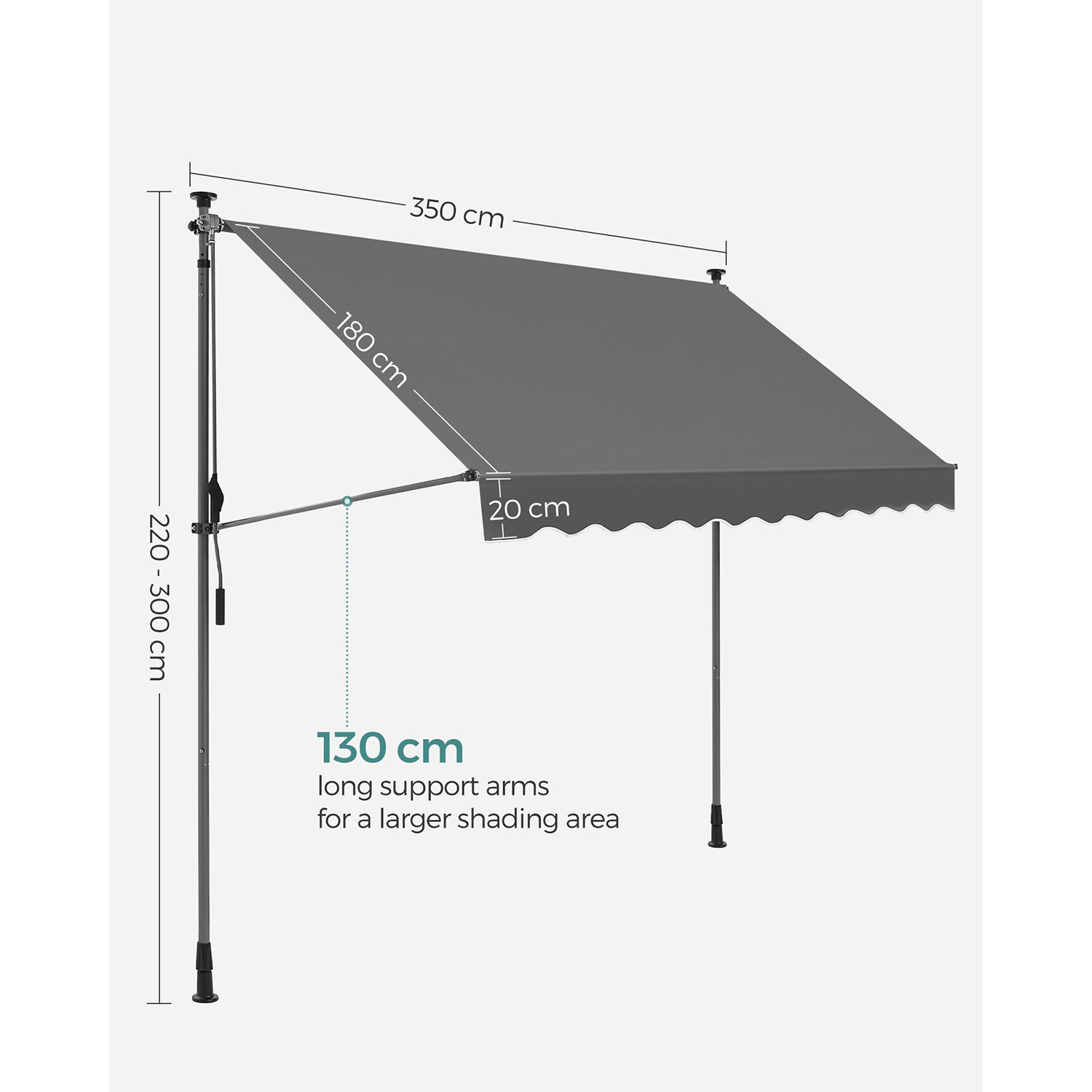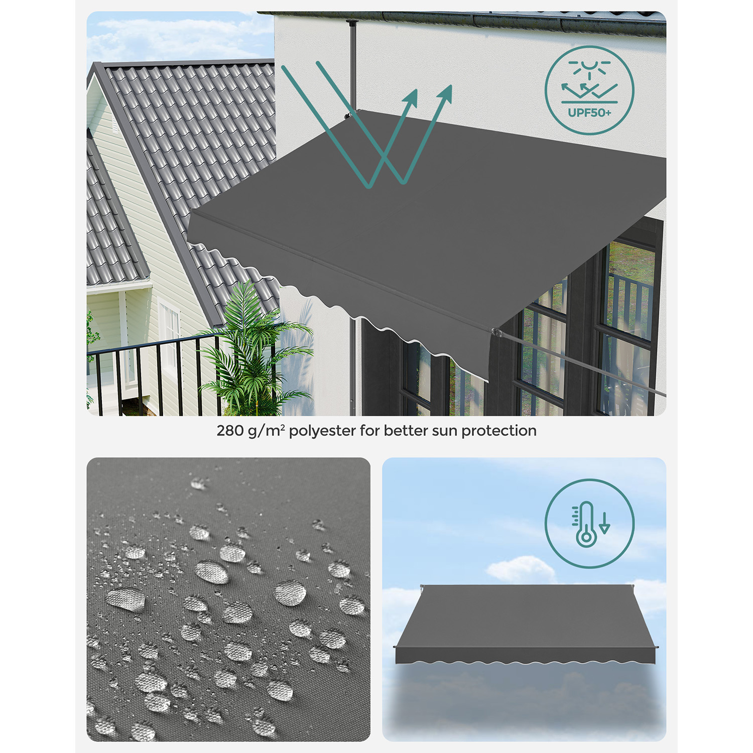 Enjoy the summer without complicated installation: Would you like an awning without having to drill holes? Then this balcony awning from SONGMICS is just right for you. No drilling or screws required – all you have to do is set up the frame and adjust the height of the poles and the awning so that the poles are firmly clamped between the floor and ceiling.Adjustable and protected: The high-quality fabric of the awning not only protects you from UV rays, but also from rain. With the crank, you can adjust the angle and width of the awning, whether on the balcony, terrace, or outdoors, it offers you complete protection. Product details: Color: Anthracite Material: Powder-coated steel poles, aluminum (fabric roller: Ø 38 mm), 280 g/m² polyester, PU coating Size: 350 x 130 cm (L x W) Height: 2.2-3 m Weight: 11.3 kg Scope of delivery: 1 x clamp awning 1 x instructions SONGMICs notes: Assembly should be carried out by 2 people. Please check that the support poles are secure after assembly. Do not use the product in strong wind, rain, or snowfall. Retract the awning immediately in the event of a change in weather, as otherwise damage may occur. Please do not continue turning the crank after the awning fabric has been fully extended. The fabric should be wiped clean with a soft cloth dampened with water or mild detergent.