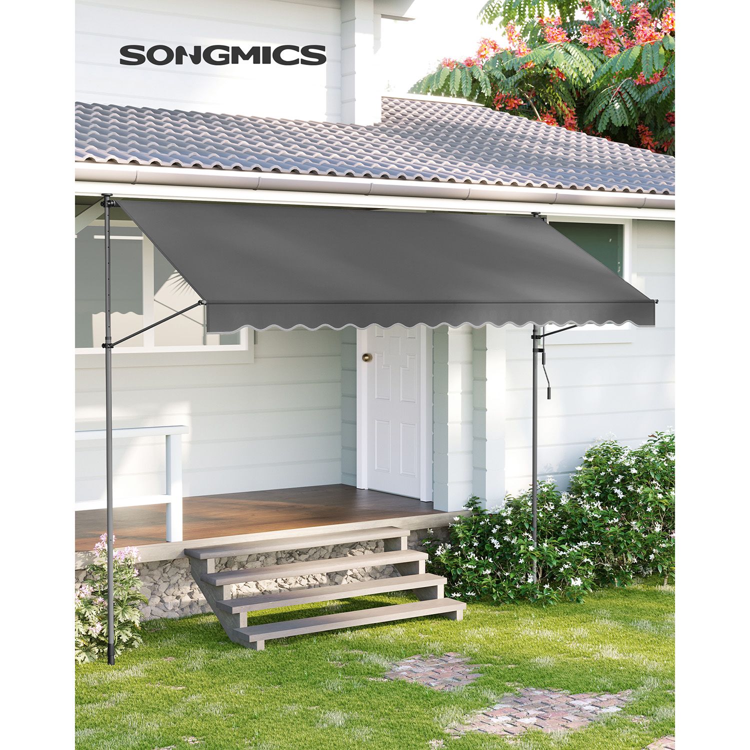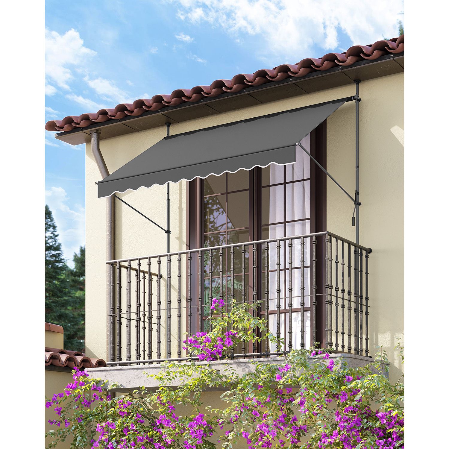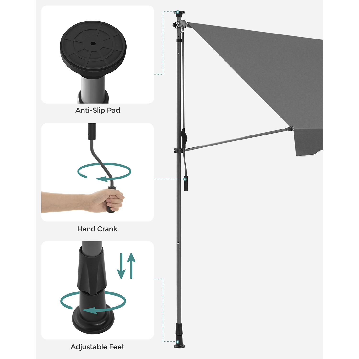 Enjoy the summer without complicated installation: Would you like an awning without having to drill holes? Then this balcony awning from SONGMICS is just right for you. No drilling or screws required – all you have to do is set up the frame and adjust the height of the poles and the awning so that the poles are firmly clamped between the floor and ceiling.Adjustable and protected: The high-quality fabric of the awning not only protects you from UV rays, but also from rain. With the crank, you can adjust the angle and width of the awning, whether on the balcony, terrace, or outdoors, it offers you complete protection. Product details: Color: Anthracite Material: Powder-coated steel poles, aluminum (fabric roller: Ø 38 mm), 280 g/m² polyester, PU coating Size: 350 x 130 cm (L x W) Height: 2.2-3 m Weight: 11.3 kg Scope of delivery: 1 x clamp awning 1 x instructions SONGMICs notes: Assembly should be carried out by 2 people. Please check that the support poles are secure after assembly. Do not use the product in strong wind, rain, or snowfall. Retract the awning immediately in the event of a change in weather, as otherwise damage may occur. Please do not continue turning the crank after the awning fabric has been fully extended. The fabric should be wiped clean with a soft cloth dampened with water or mild detergent.