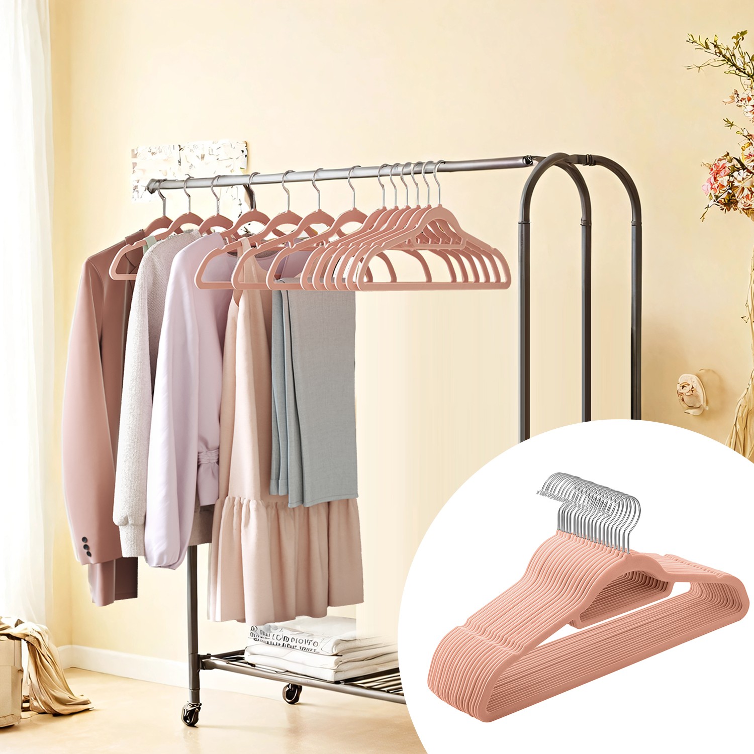 The Songmics coat hanger with flocked surface offers you a non-slip, space-saving, and durable solution for hanging clothes. To meet a variety of needs, this hanger is designed to be multifunctional, allowing you to hang not only coats or tops securely, but also find space for your pants and ties. Notes: – Before use, please use a hair dryer to blow away any surface fluff (surface fluff may be present in the packaging bags or on the hangers; this is normal, so please do not worry). – Please avoid leaving the hangers in rooms with high humidity and high temperatures for long periods of time. – Please avoid hanging wet laundry on the hangers. Product details: – Material: ABS (plastic) + velvet – Color: light pink – Dimensions: 45 x 24 x 0.6 cm (W x H x D) – Hook height: 8 cm – Hook opening: 5.4 cm Scope of delivery: – 20 x hangers with trouser bar