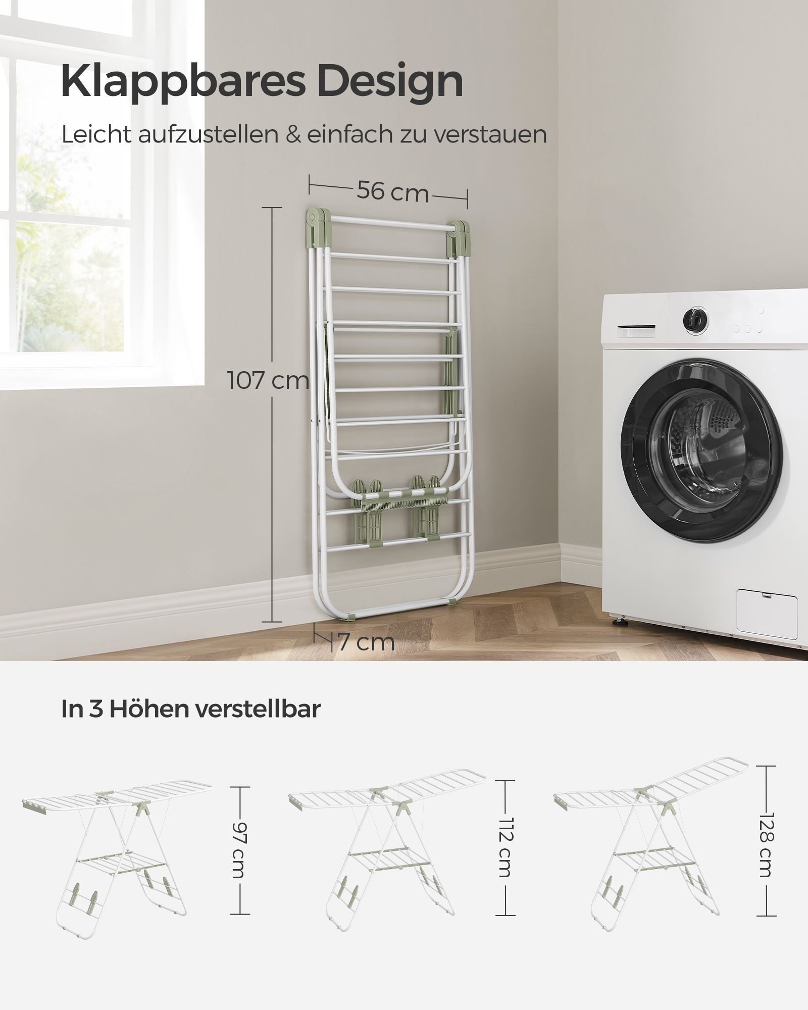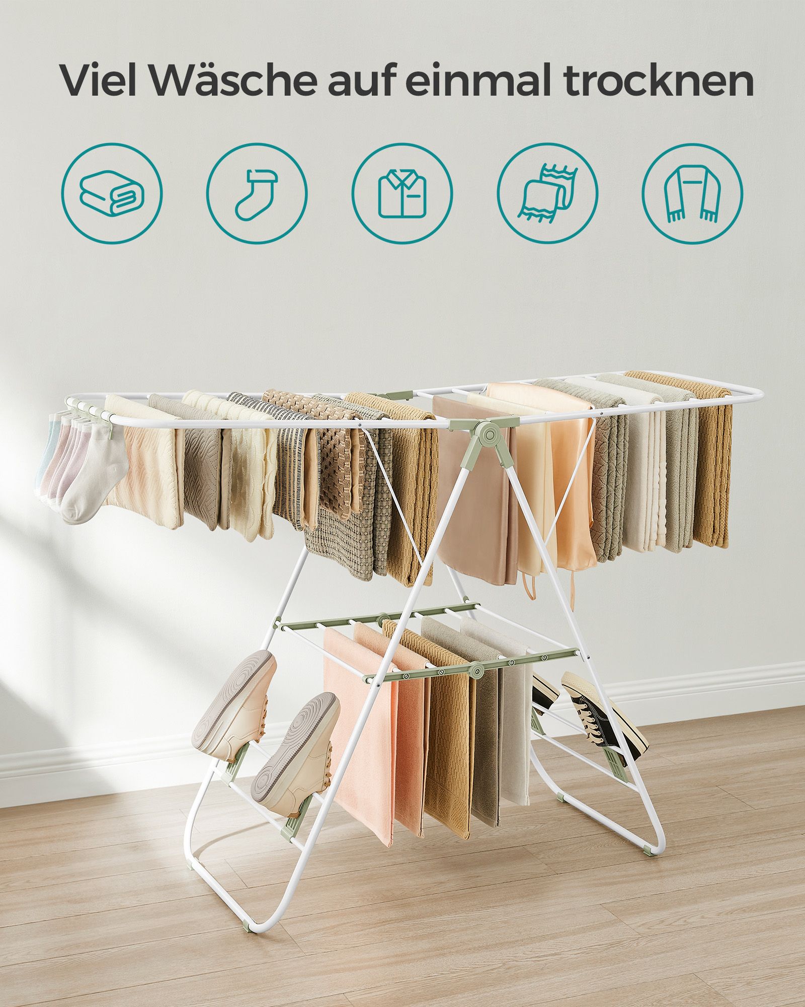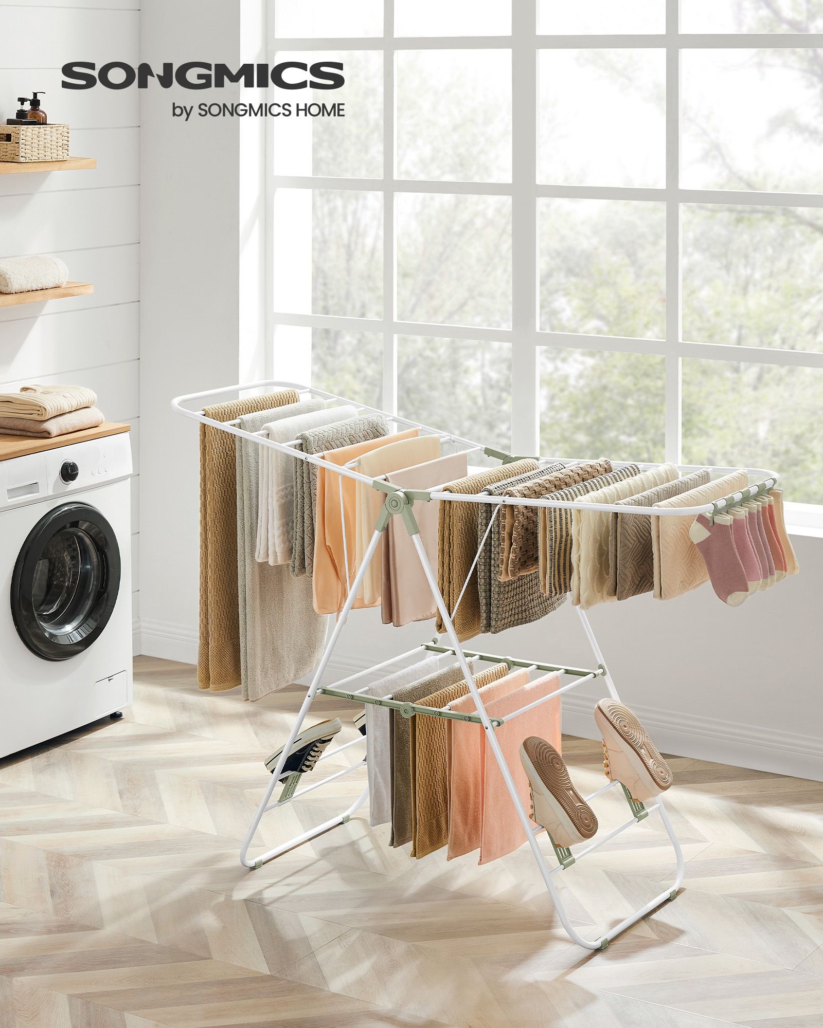 SONGMICS foldable clothes horse, free-standing dryer, clothes rack, clothes dryer, wing clothes horse, 16 m drying length, stainless steel, silver LLR502