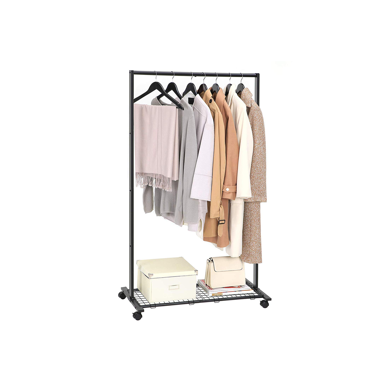 Ready-made clothes rail for messy piles of clothes: Are you looking for a clever solution for messy piles of clothes? Perfect, you’ve found it! This stylish clothes rack offers plenty of space for your everyday clothes while taking up very little room. You can also store your shoes, bags, storage boxes, etc. on the mesh shelf at the bottom. Really strong! This coat rack is made of premium iron pipes that are joined together with screws. Whether you want to hang up long coats or heavy jackets, this clothes rail can easily support their weight. Would you like to protect some delicate garments from a packed wardrobe, or is your clothing collection growing incessantly? Then welcome this chic clothes rack from SONGMICS into your home! Product details: Color: Black Material: Iron pipe Size: 82.5 x 40.5 x 148.5 cm (L x W x H) Weight: 4.1 kg Max. static load capacity of the clothes rail: 25 kg Max. static load capacity of the shelf: 15 kg Scope of delivery: 1 x clothes rack 1 x instructions (DE, EN, ES, FR, IT) SONGMICS notes:The max. load capacity in the text refers to the maximum static weight.