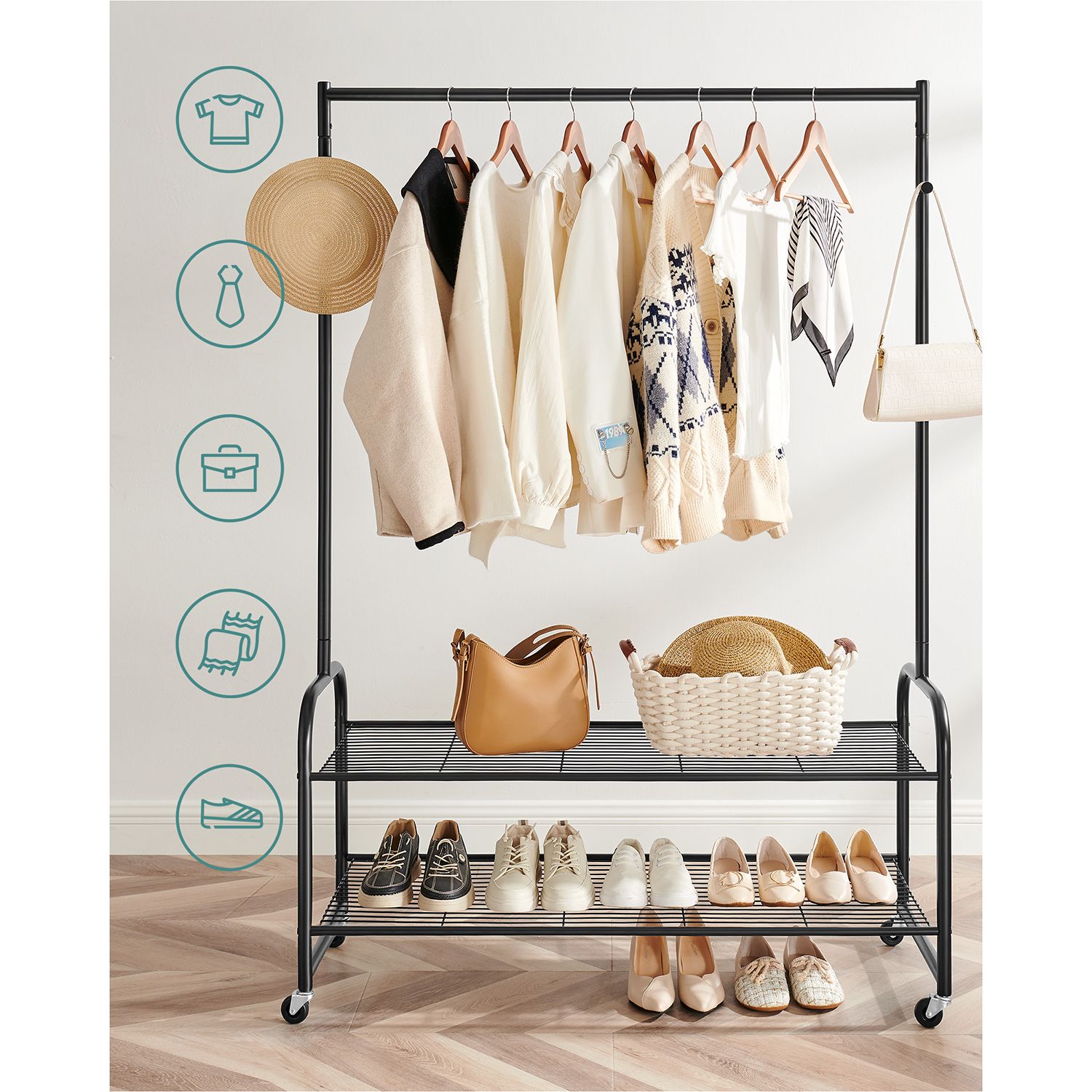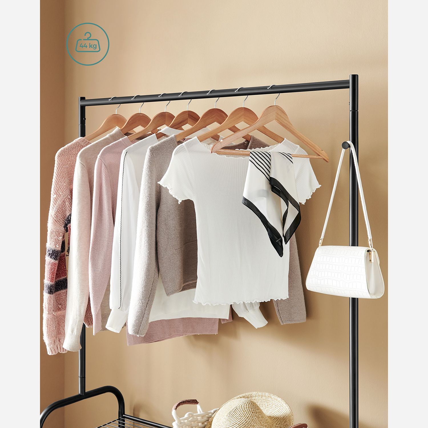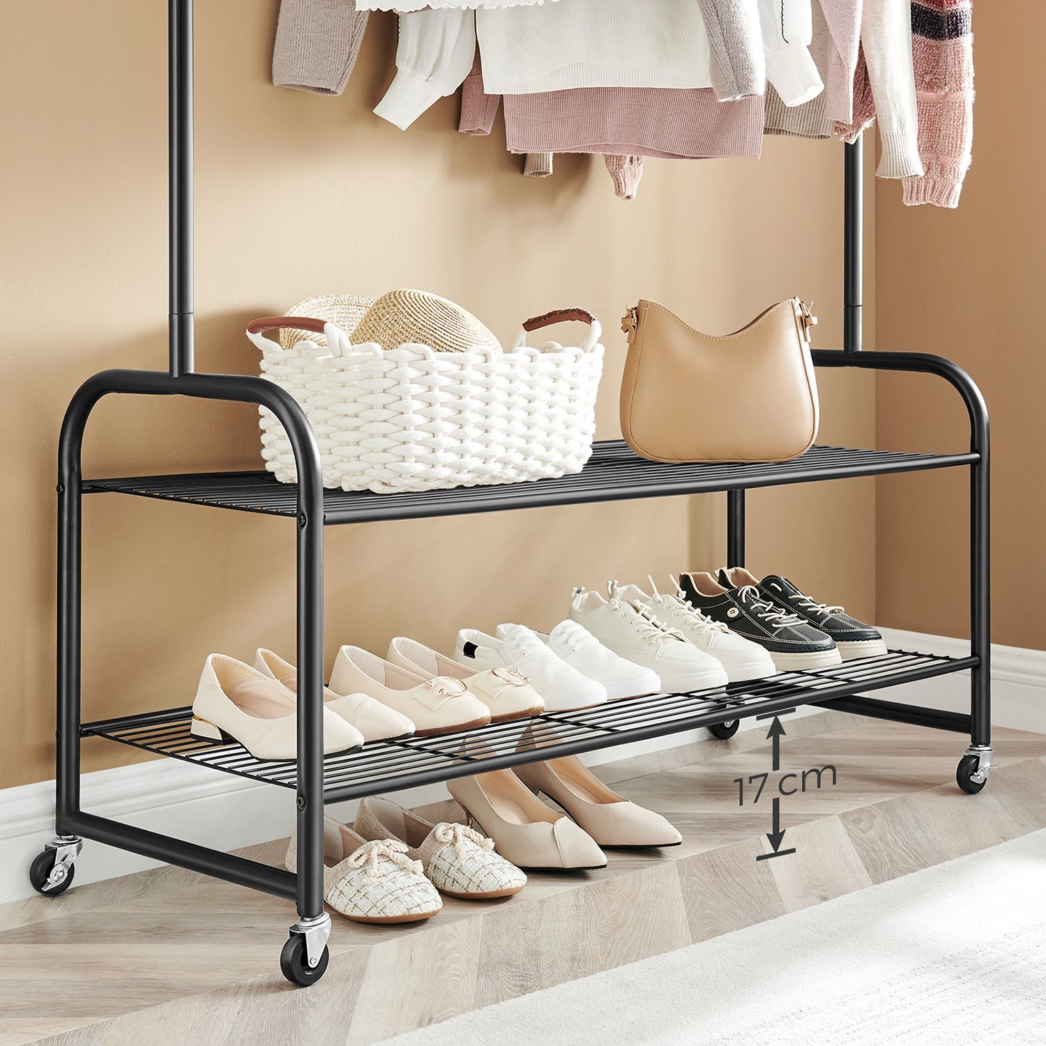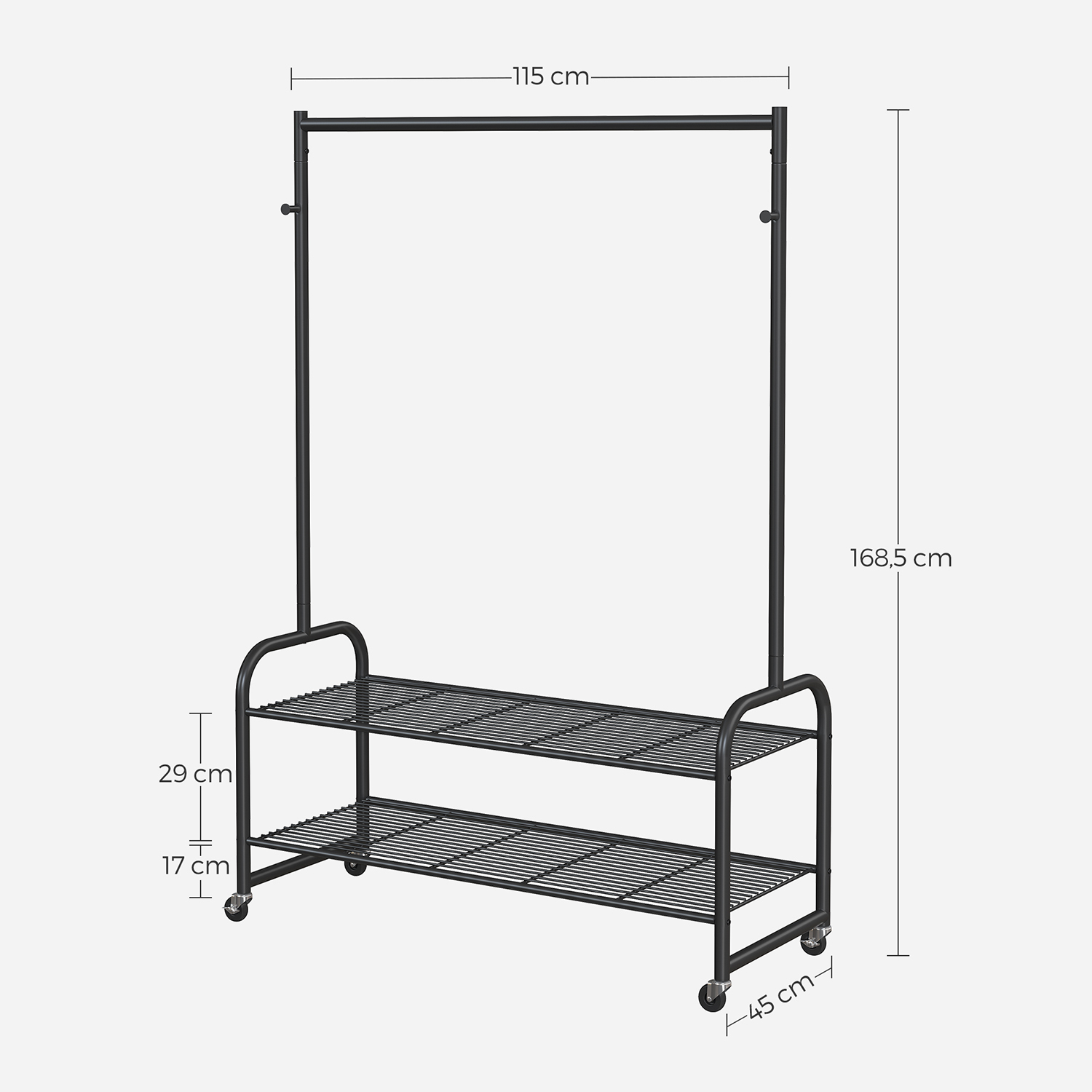 Product details: – Color: Black – Material: Steel – Size: 115 x 45 x 168.5 cm (L x W x H) – Weight: 6.6 kg – Max. static load capacity of the top bar: 45 kg – Max. static load capacity per hook: 10 kg – Max. static load capacity per shelf: 10 kg Scope of delivery:- 1 x coat rack – 1 x instructions