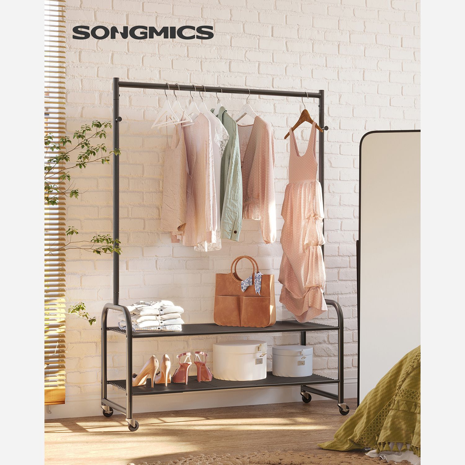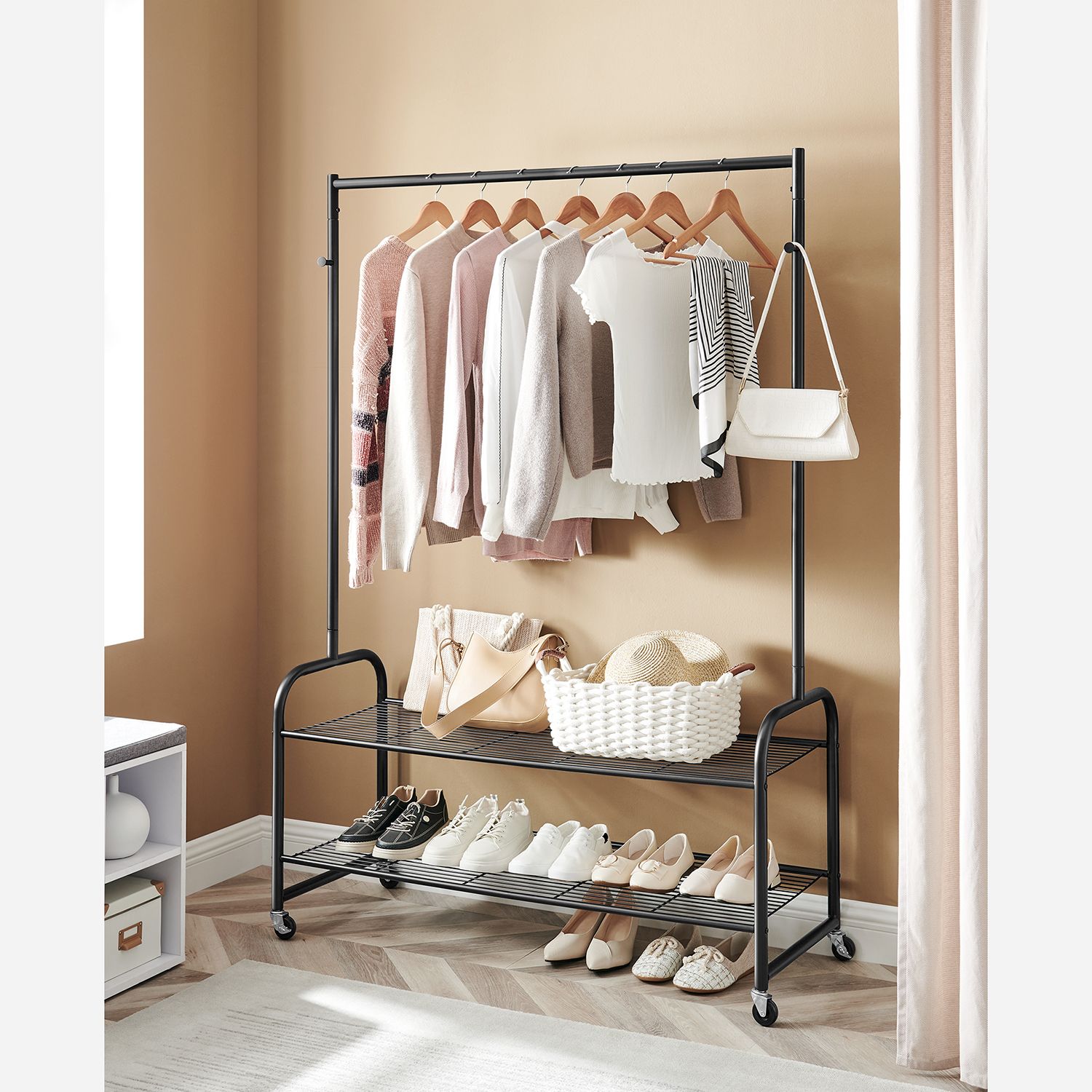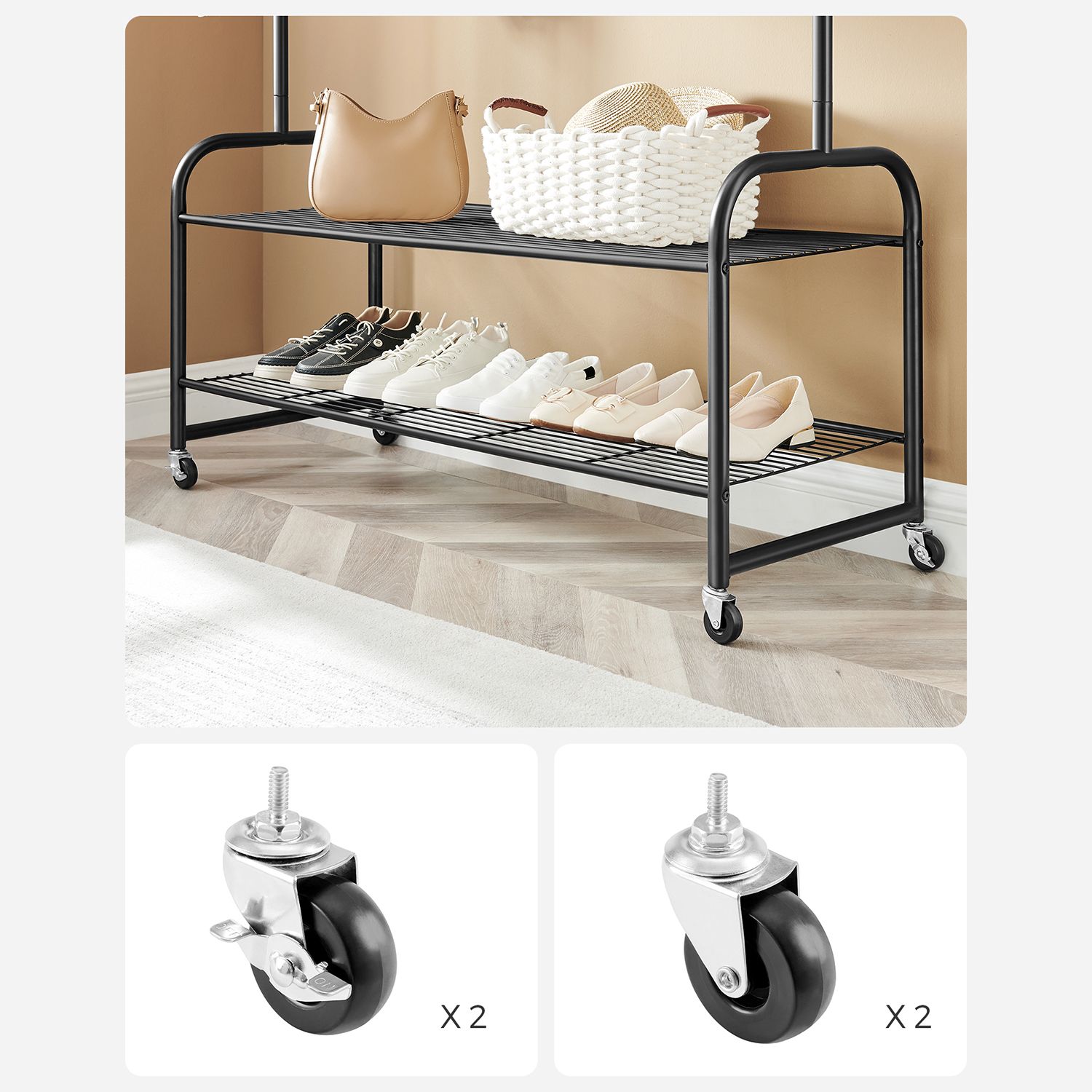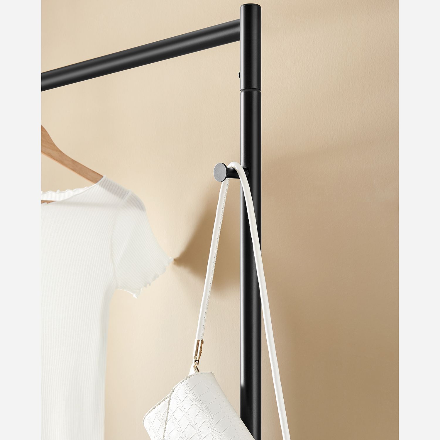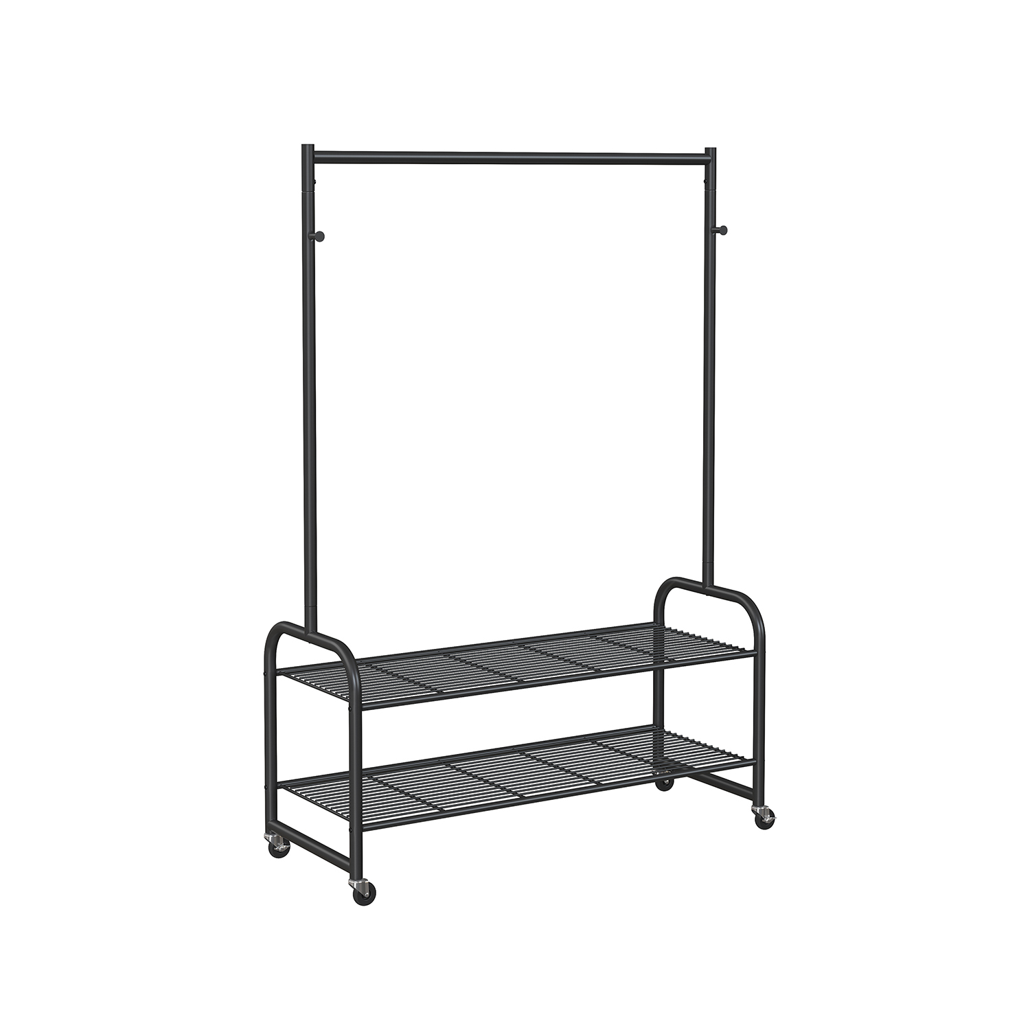 Product details: – Color: Black – Material: Steel – Size: 115 x 45 x 168.5 cm (L x W x H) – Weight: 6.6 kg – Max. static load capacity of the top bar: 45 kg – Max. static load capacity per hook: 10 kg – Max. static load capacity per shelf: 10 kg Scope of delivery:- 1 x coat rack – 1 x instructions