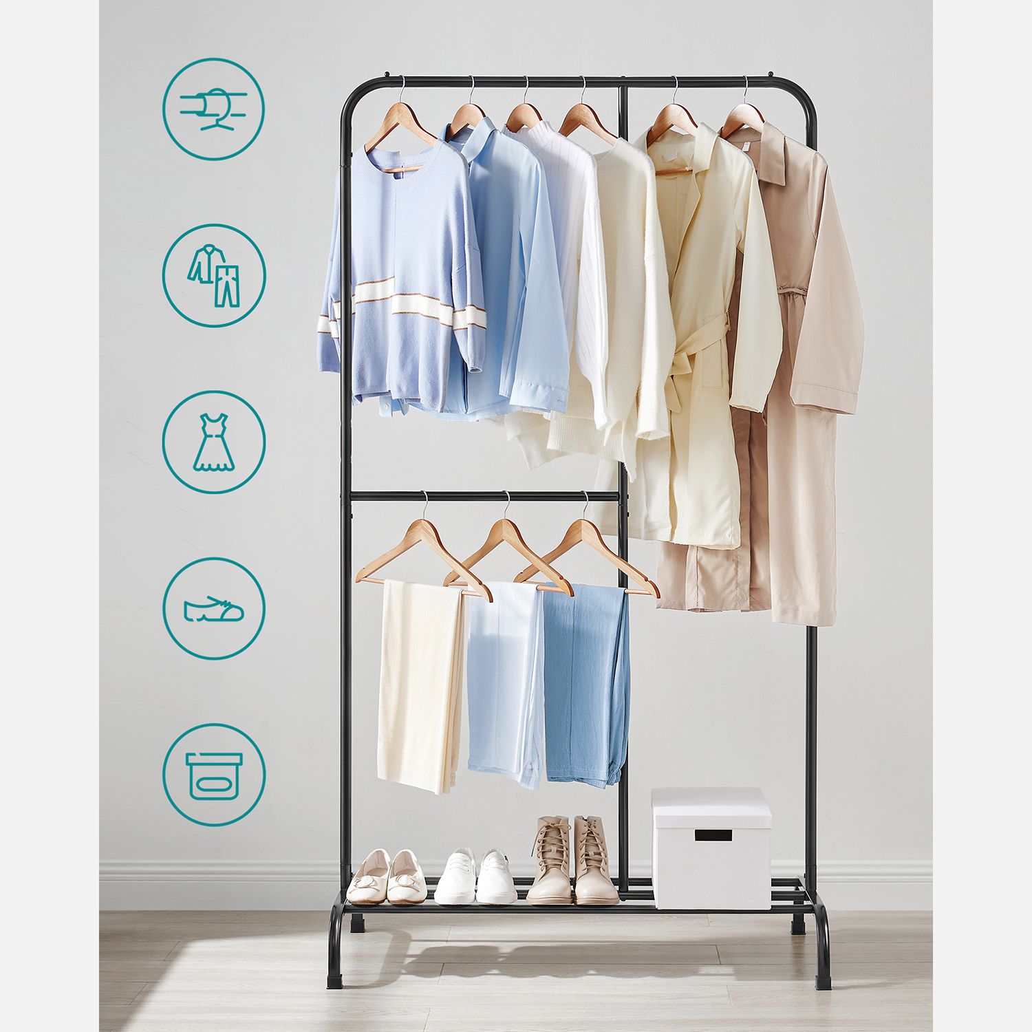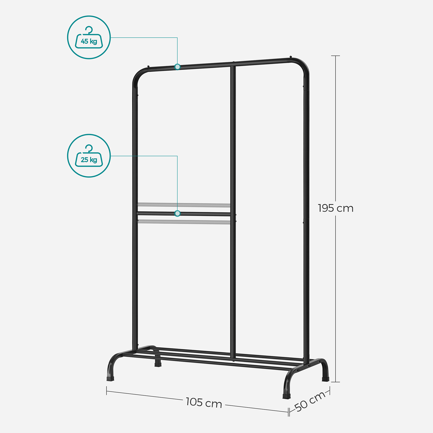 Product details: – Color: Black – Material: Steel – Size: 105 x 50 x 195 cm (L x W x H) – Weight: 4.5 kg – Max. static load capacity (top bar): 45 kg – Max. static load capacity (middle bar): 25 kg – Max. static load capacity (bottom shelf): 30 kg Scope of delivery:- 1 x clothes rack – 1 x instructions SONGIMC notes: – Please do not exceed the specified max. static load capacity.