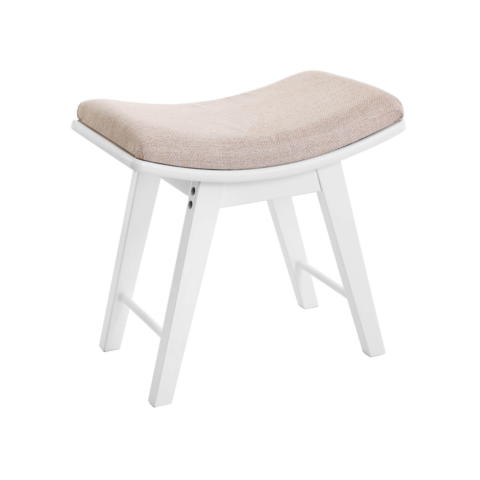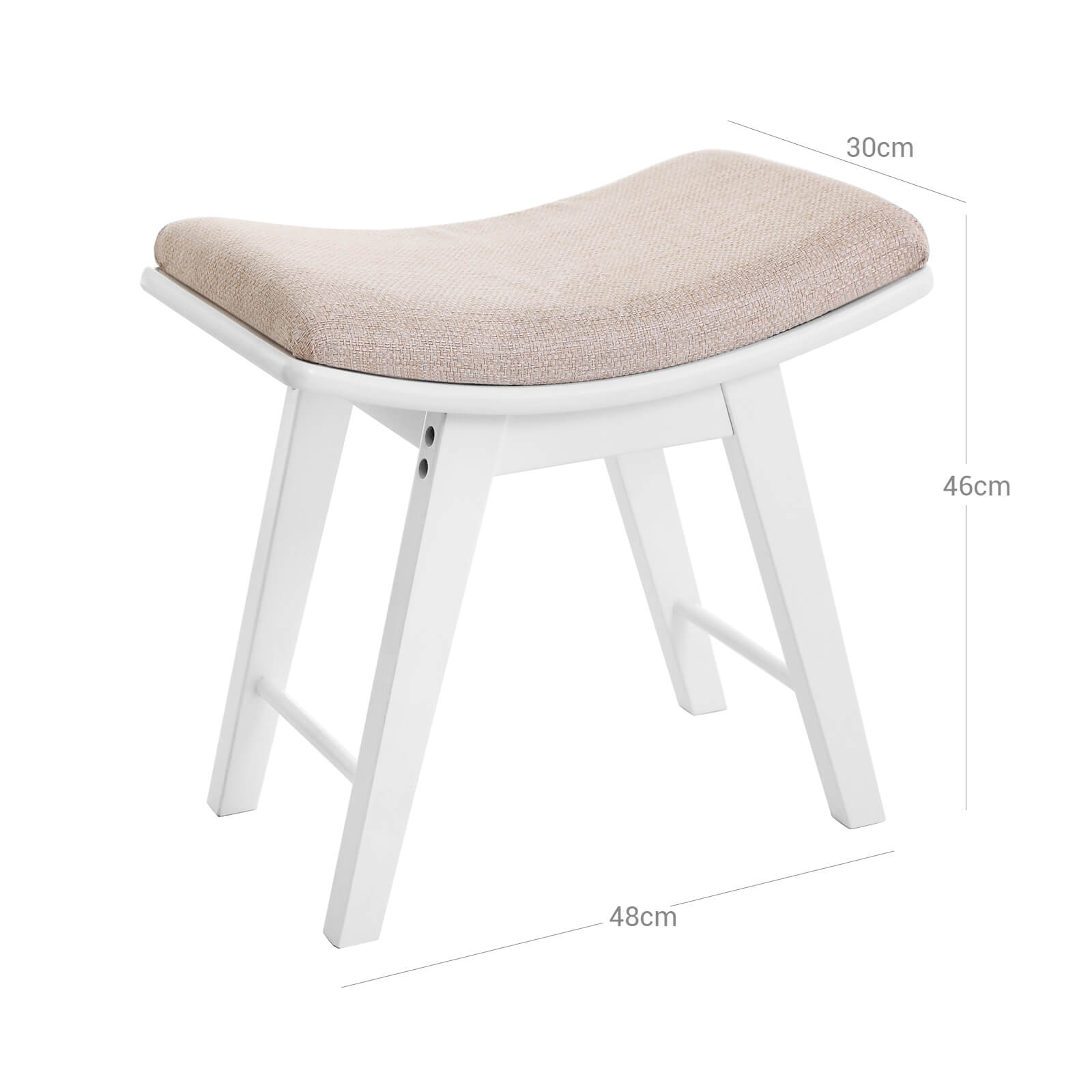 Product description: A good dressing table deserves a high-quality stool. The Songmics stool with a new design ensures a pleasant time when applying makeup. This dressing table with a simple look brings a contemporary touch to your room. A thick padded seat cushion guarantees a high level of seating comfort. The Allen key for assembly is included. It also serves perfectly as a shoe rack in the hallway. Product details: – Color: white – Material: rubberwood, MDF board – Dimensions: 48 x 46 x 30 cm (W x H x D) – Weight: 5 kg Scope of delivery: – 1 x rubberwood legs – 1 x stool frame – 1 x instructions (DE, EN, IT, FR, ES) – 1 x bag of fittings Notes: – The dressing table should be protected from direct sunlight. – Avoid any contact between the table and sharp objects or aggressive solvents in order to protect it from scratches or damage.
